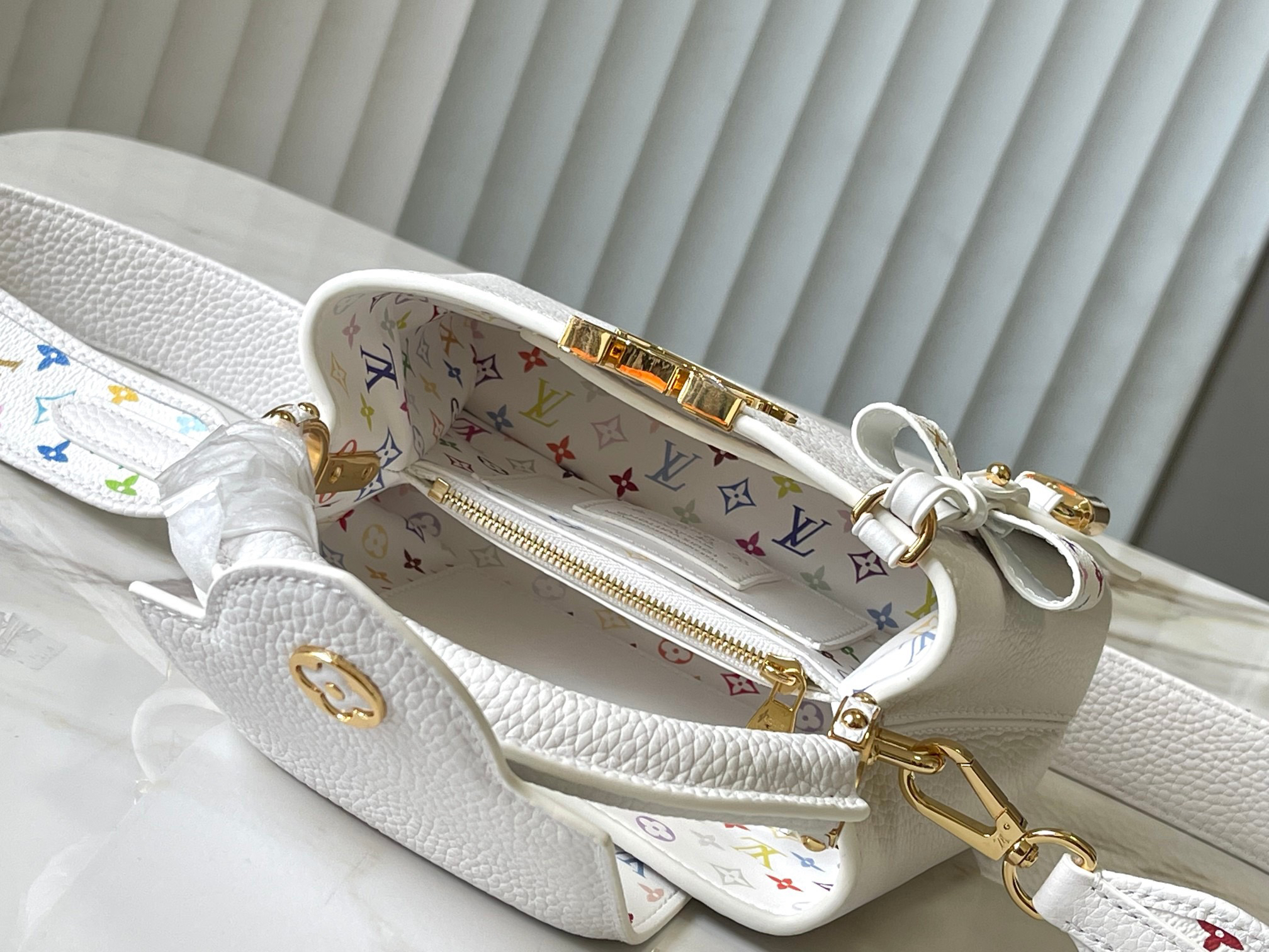 秋冬特惠💰1650 渠道级LV 新品 te级LV 动态芯片 M13253/M48865白拼紫三彩款 本款 Capucines手袋出自路易x村上隆再版系列 选用Taurillon牛皮革妙趣演绎经典设计 LV字母和可拆卸Monogram 肩带浸染明丽色调 致意艺术家标志性的虹彩笔触 蝴蝶结造型钥匙包和挂锁装饰再添考究细节 内隔层和多重口袋可轻松收纳日常所需 Size: 21 * 13.6 * 8 cm