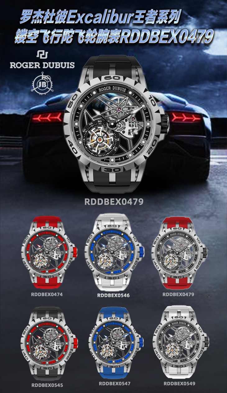 JB罗杰杜彼Excalibur Spidr(王者系列)RDDBEX0479。这是该品牌最具超跑运动元素的款式,镂空飞行陀飞轮腕表外观具有罗杰杜彼镂空时计的代表性特征, 同步原装45mm*13mm的钛合金表壳,星型外观设计、凯尔特十字架形陀飞轮框架。搭载着一枚上海定制的RD505SQ手动上链机芯,和原装一样金色摆轮上有配重砝码钉,机芯相对小厂更加稳定误差更小,机芯主体相似度达到98%,机芯11点和4点位置没有多余齿轮,机芯夹板排列有序的鱼鳞纹洗花,并且已经废除多余的日历挡位,具体评测可参考经典款无水印视频:蓝宝石防刮镜面,进口泰国橡胶原材料表带,柔韧度高做工精致,原装折叠扣。腕表霸气大方又炫酷,逼格满满,一度成为跑车爱好者的标配腕表,超高辨识度。JB Factory-专为高端陀飞轮而生。
