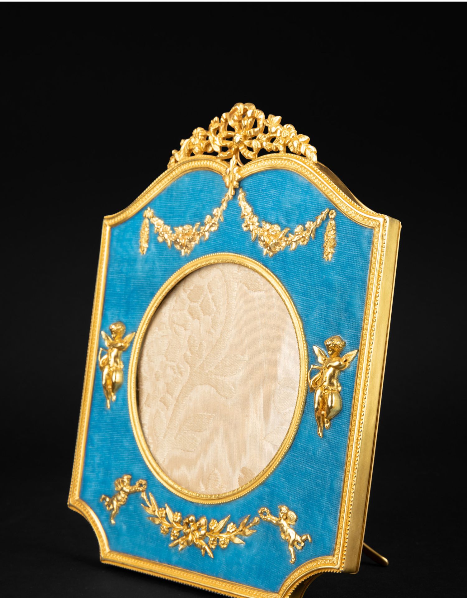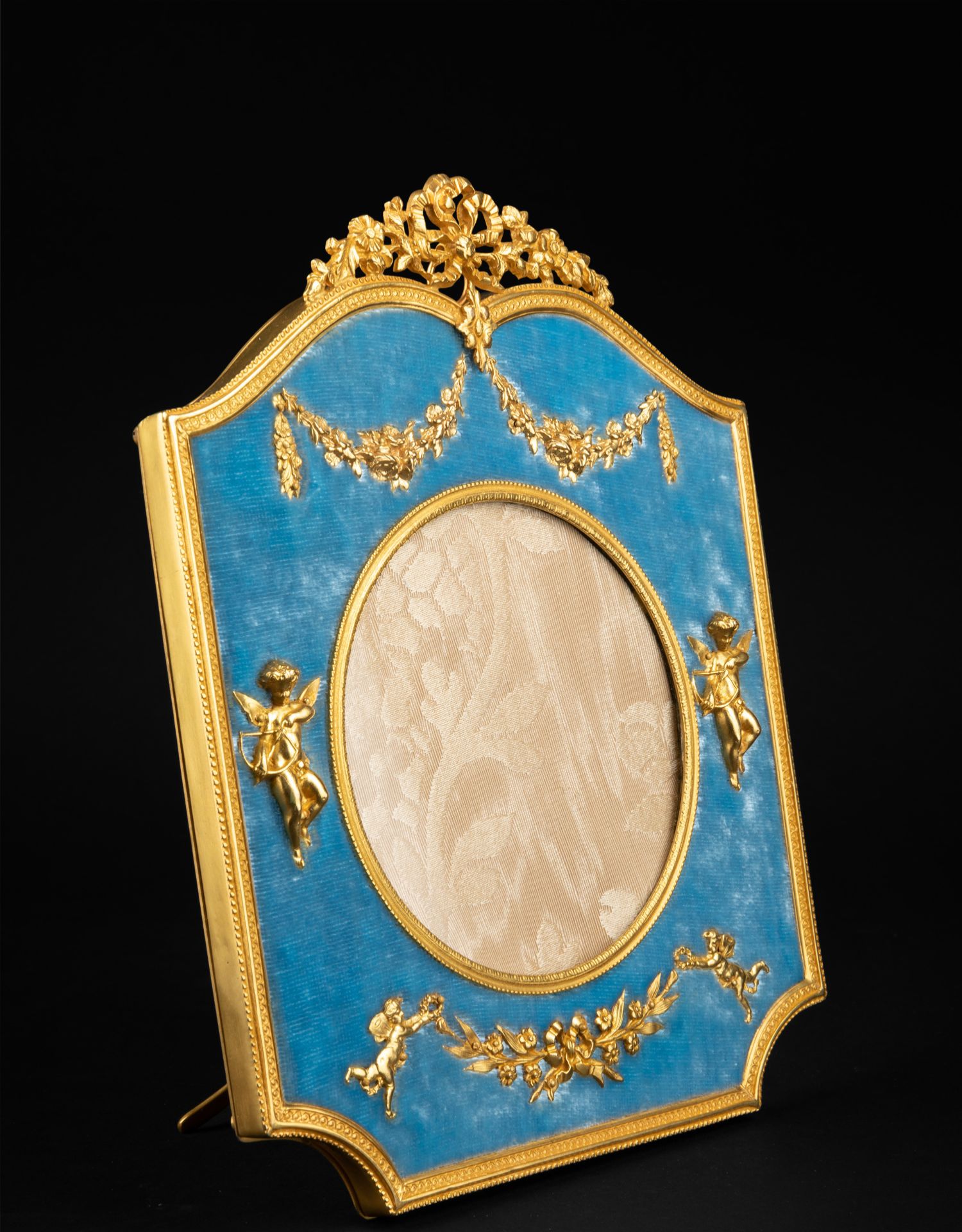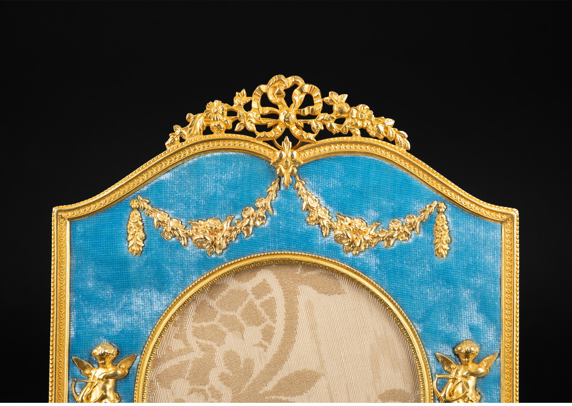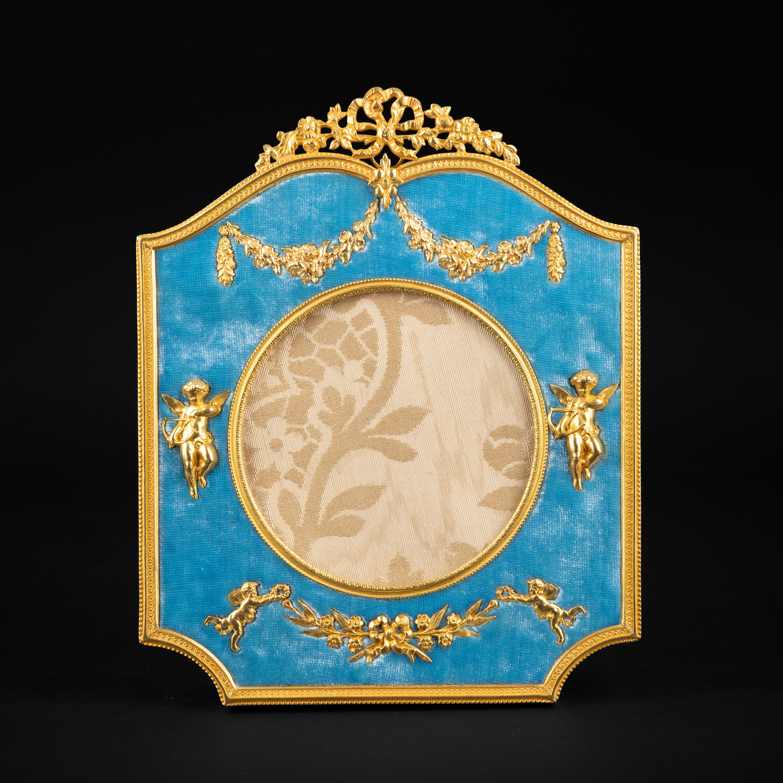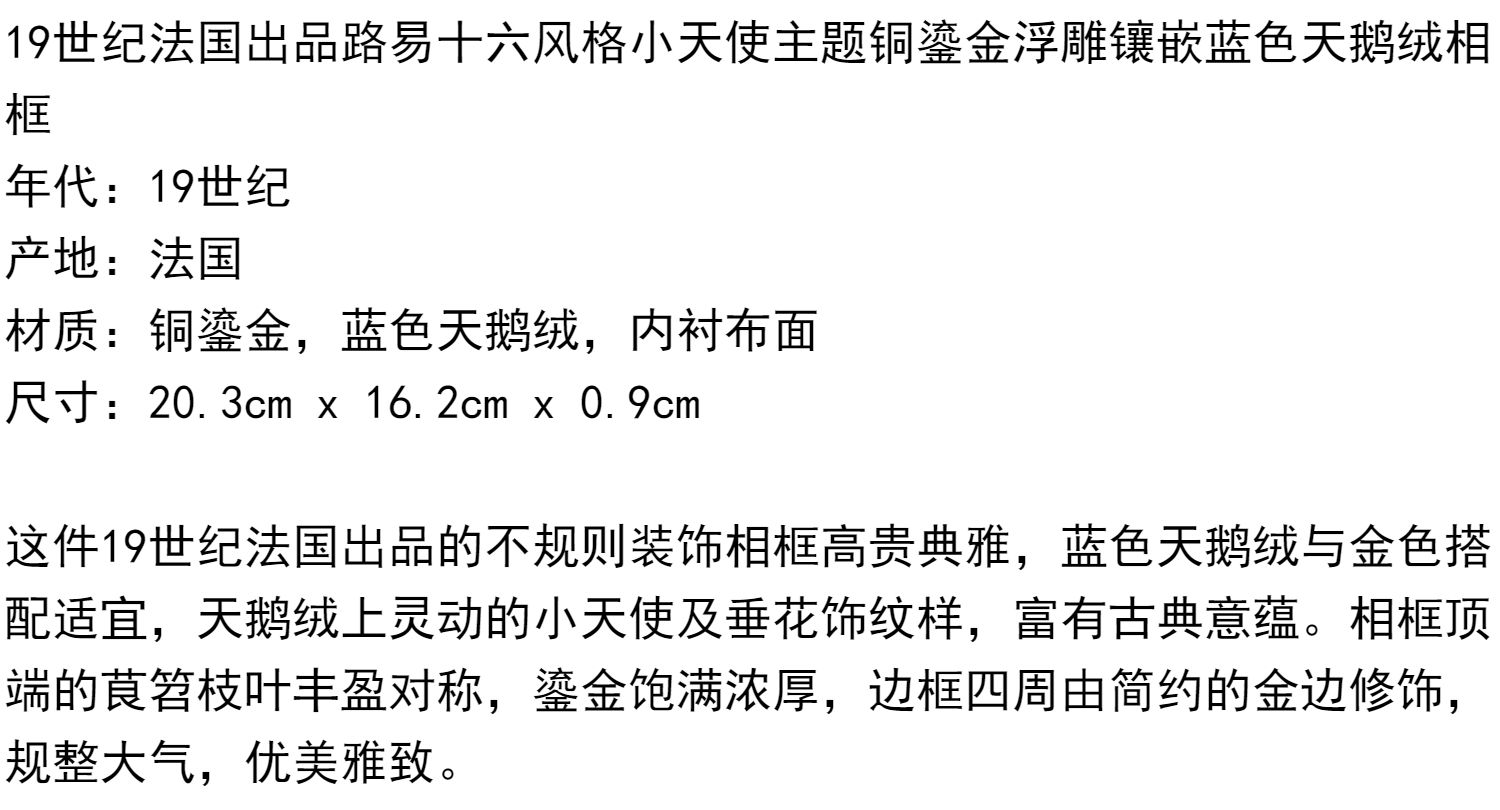 独角鹿西洋古董法国路易十六风格铜鎏金浮雕镶嵌蓝色天鹅绒相框