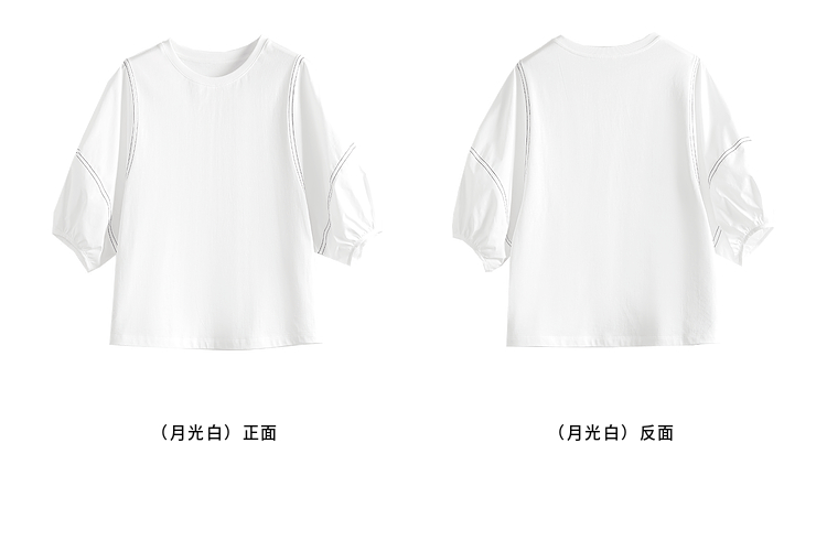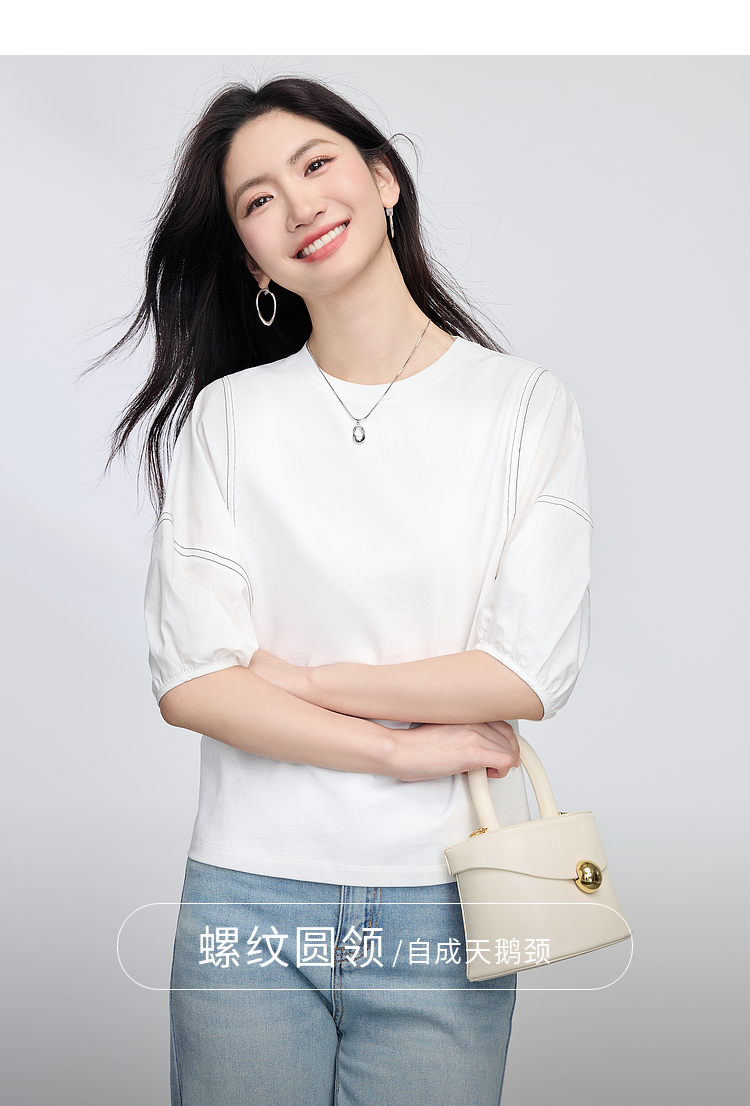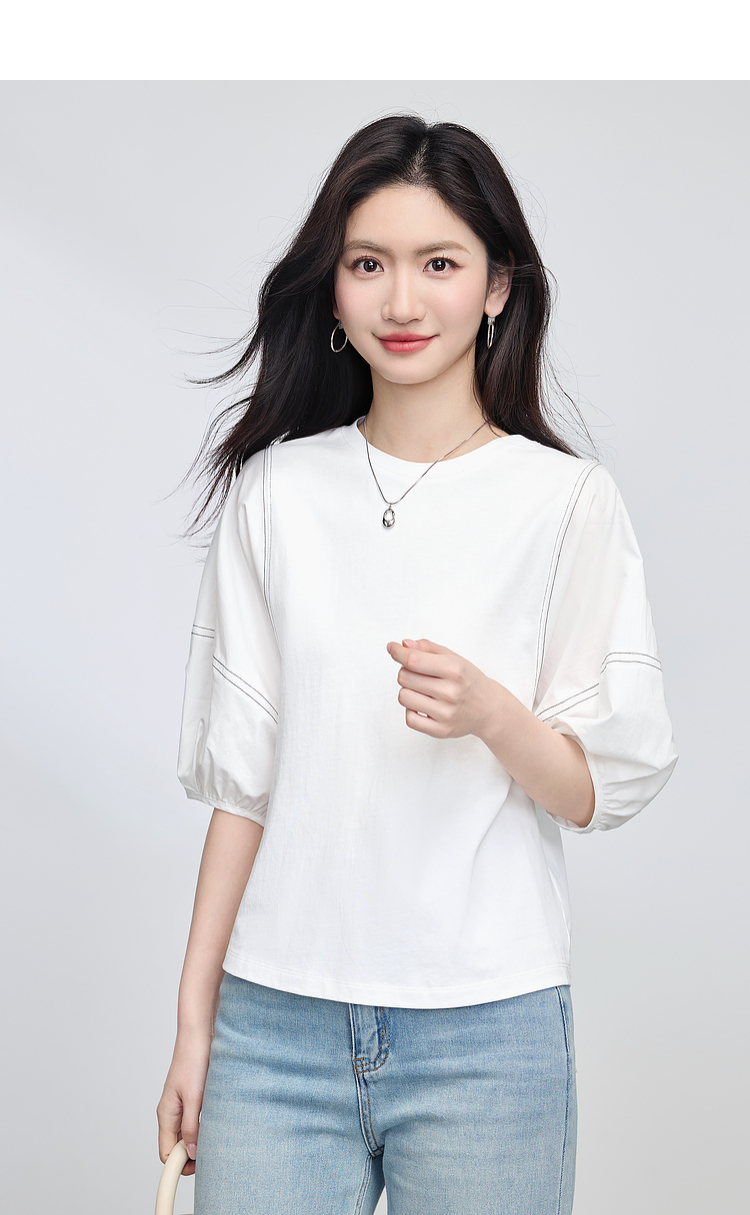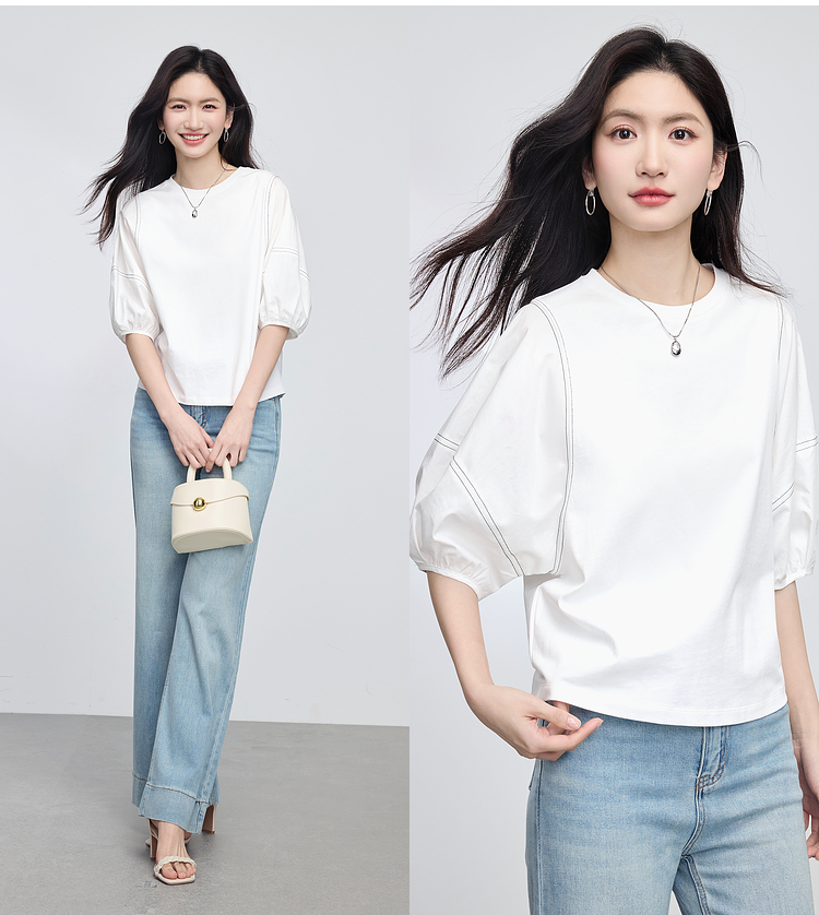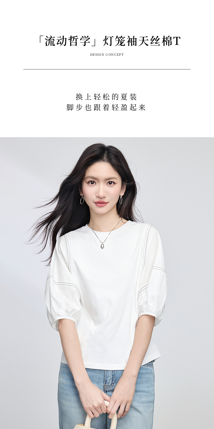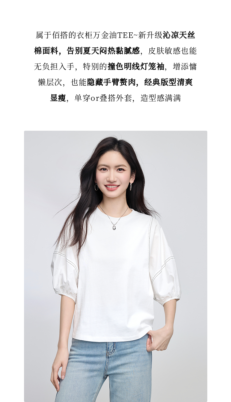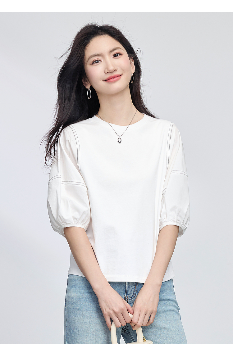 【专属特价】熙世界灯笼袖天丝棉T恤女夏季新款宽松休闲减龄五分中袖白色上衣