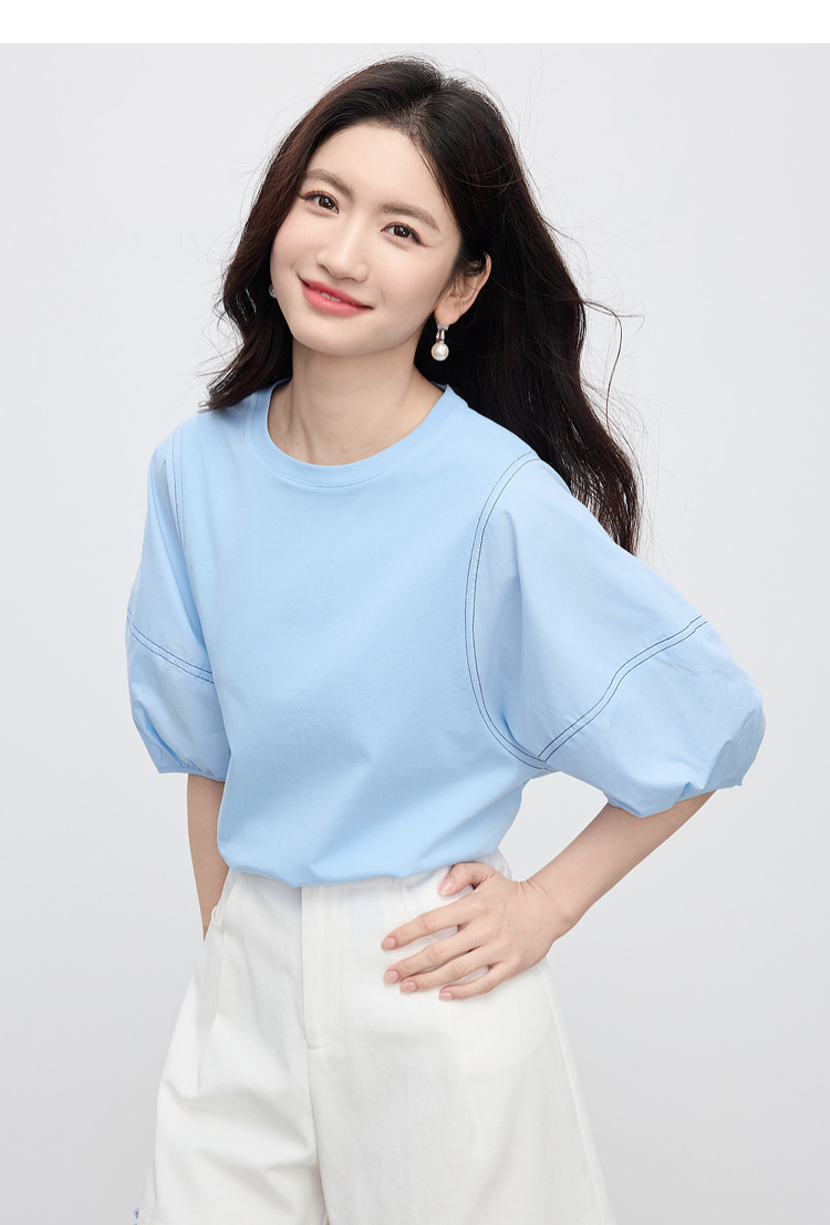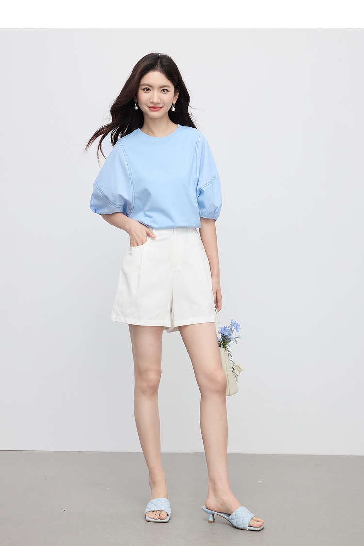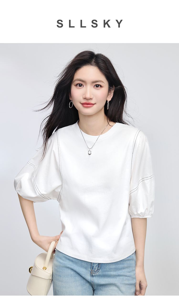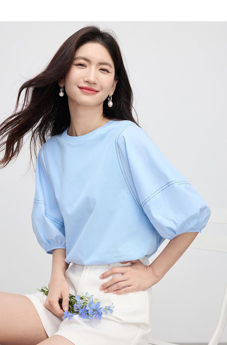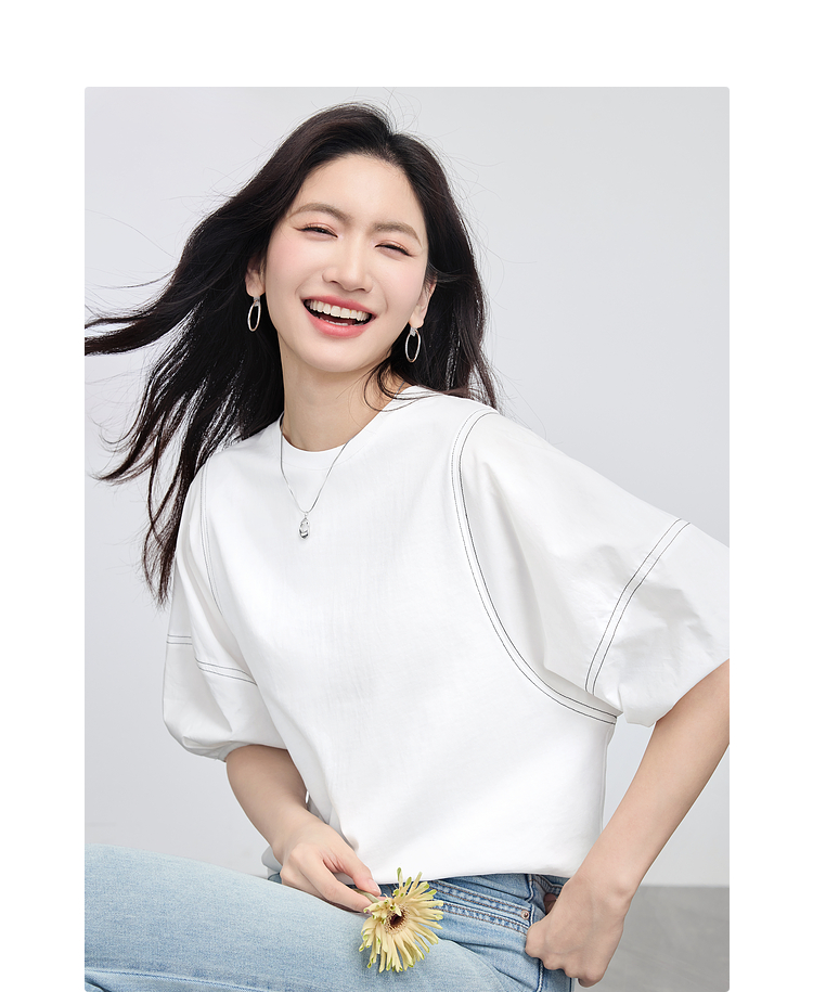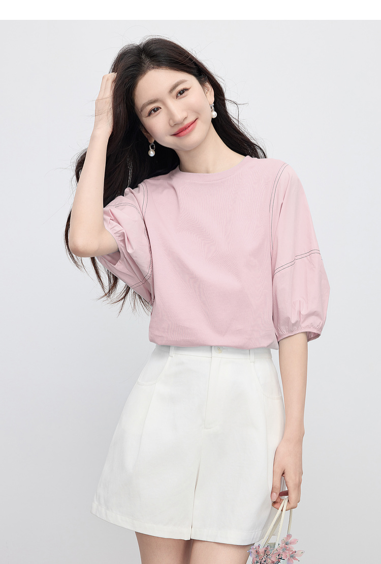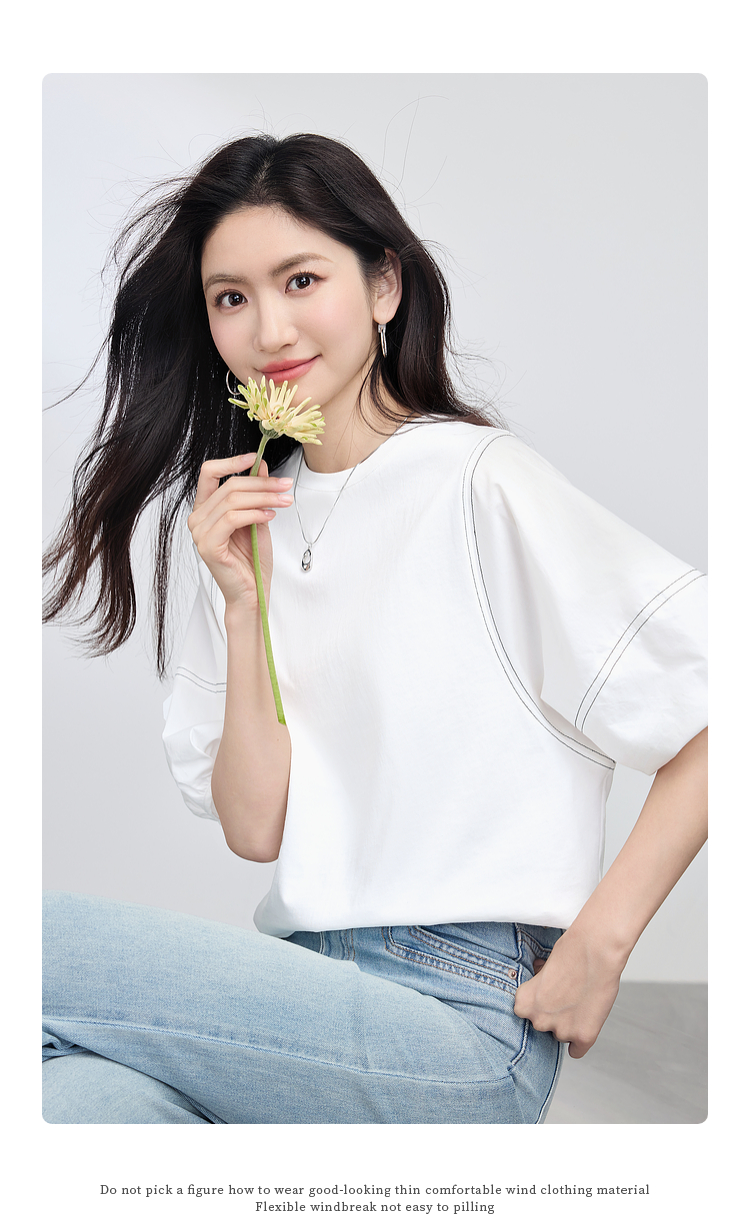 【专属特价】熙世界灯笼袖天丝棉T恤女夏季新款宽松休闲减龄五分中袖白色上衣