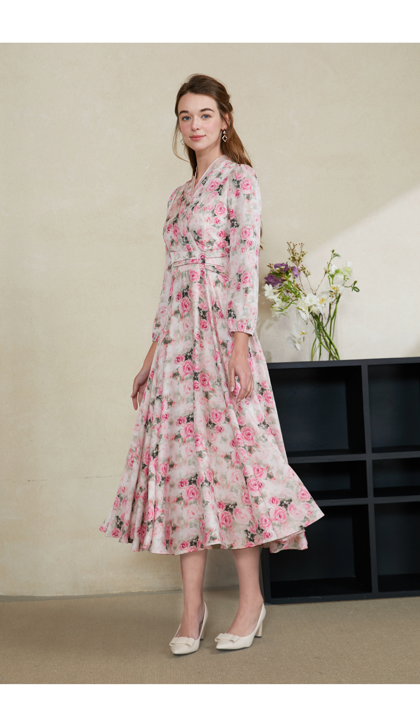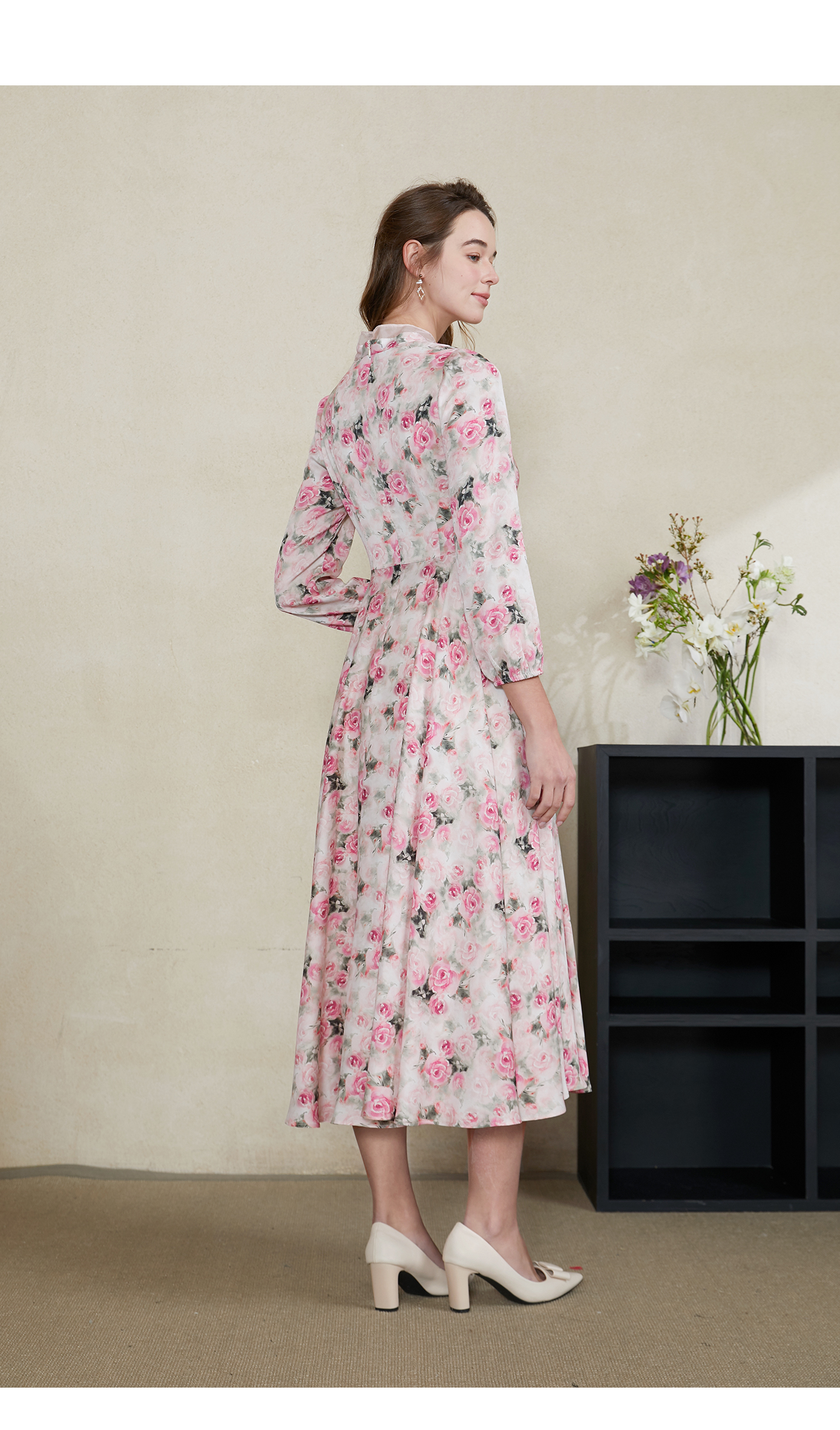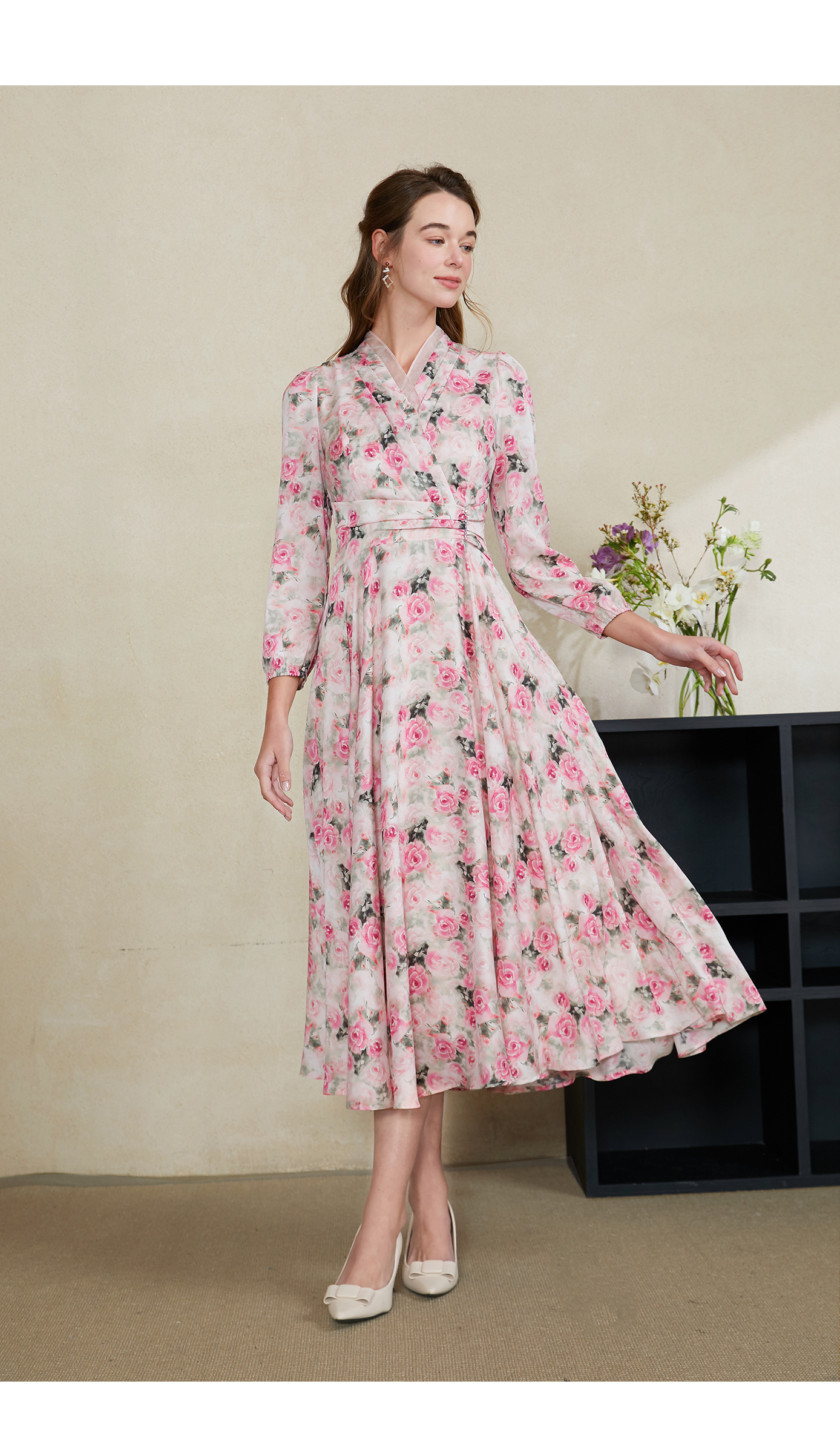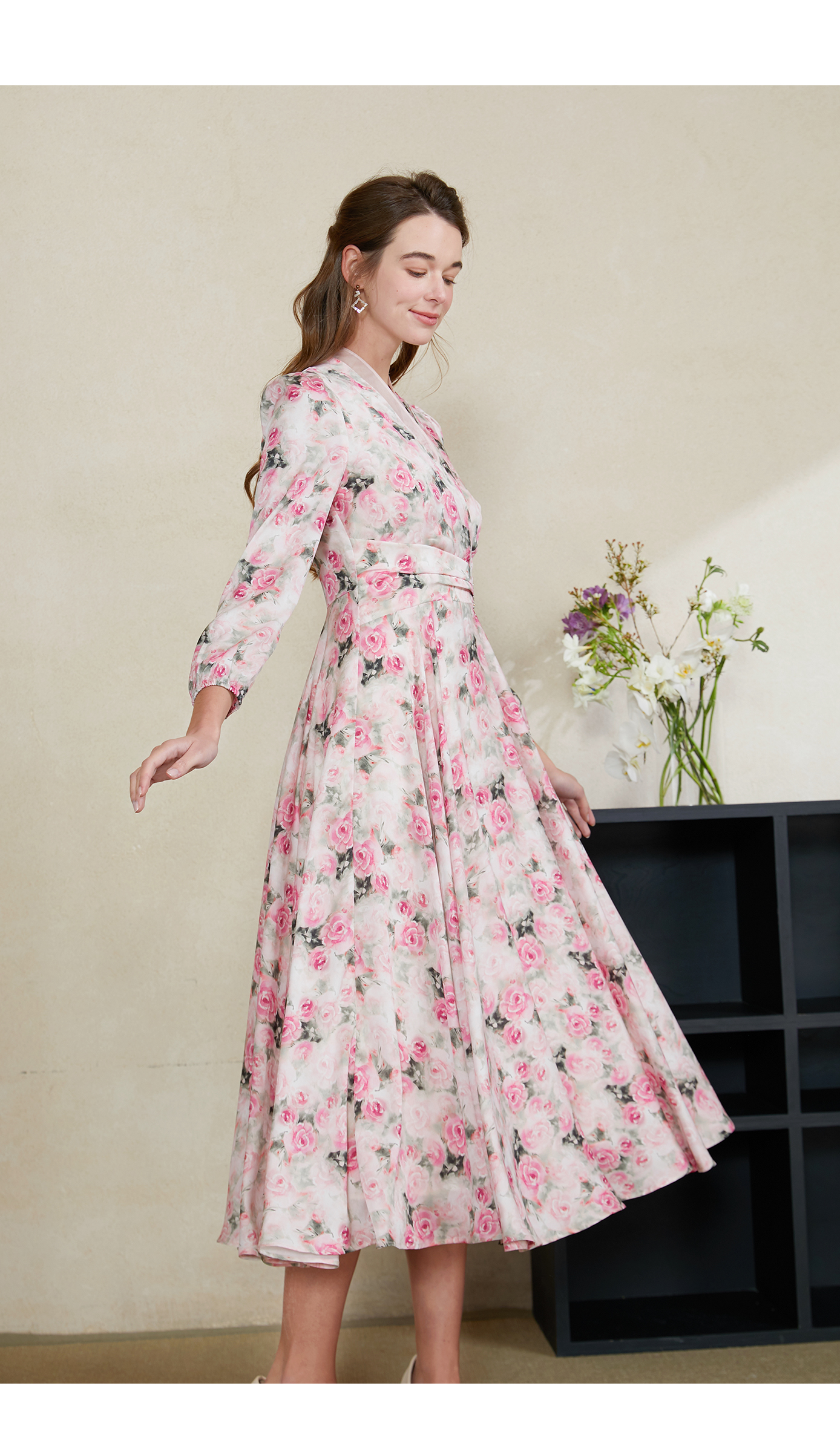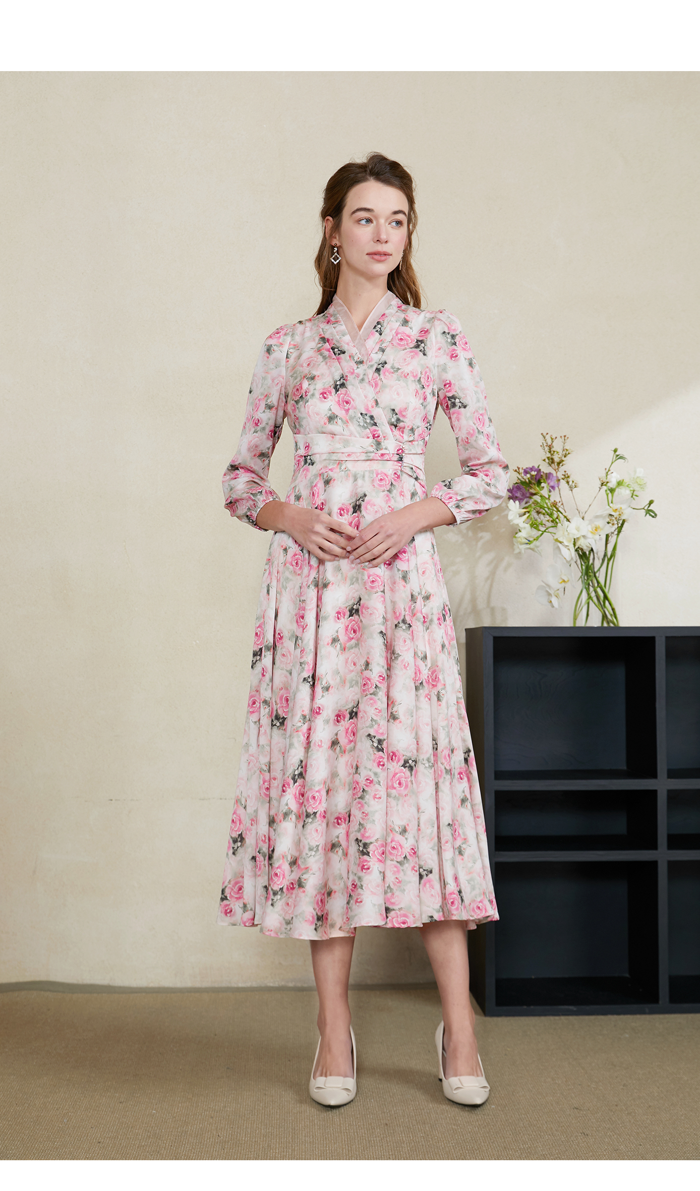 司歌印花雪纺中长连衣裙长袖收腰春A901329X