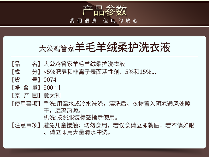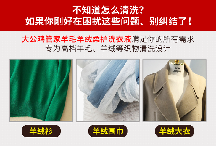 大公鸡管家羊绒洗衣液900ml/112674 适用羊毛羊绒等材质不缩水不发硬不变形