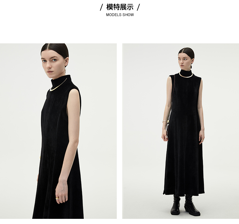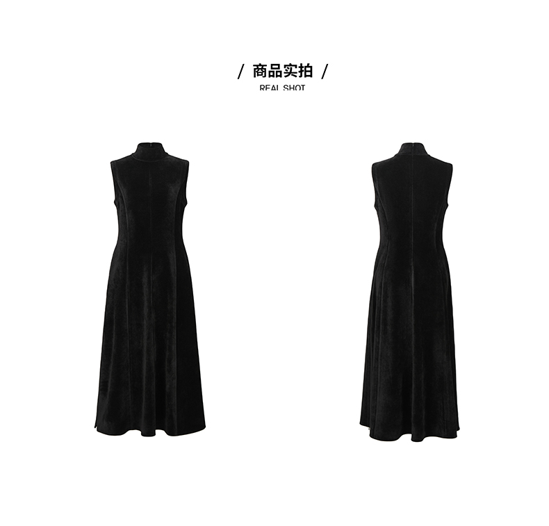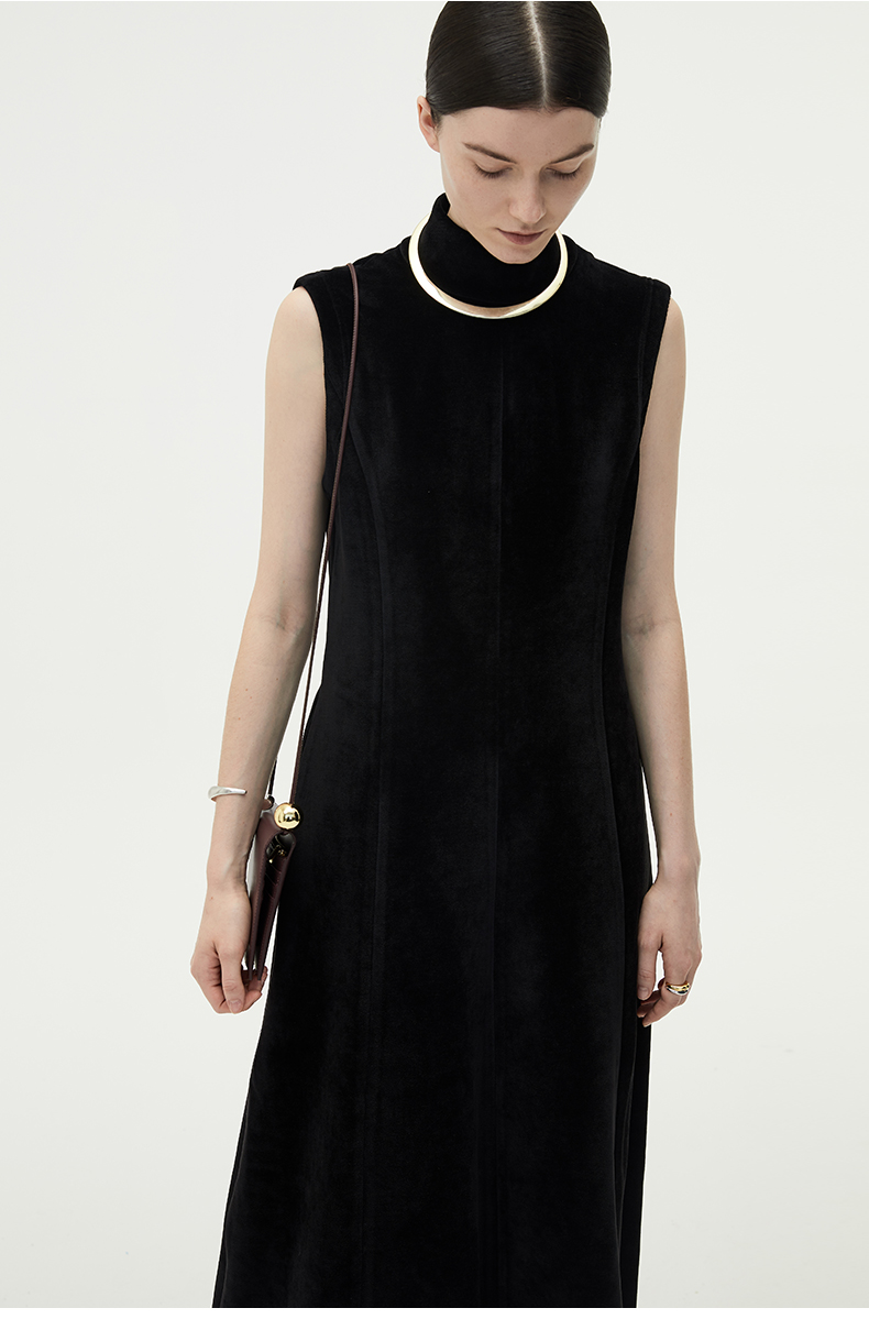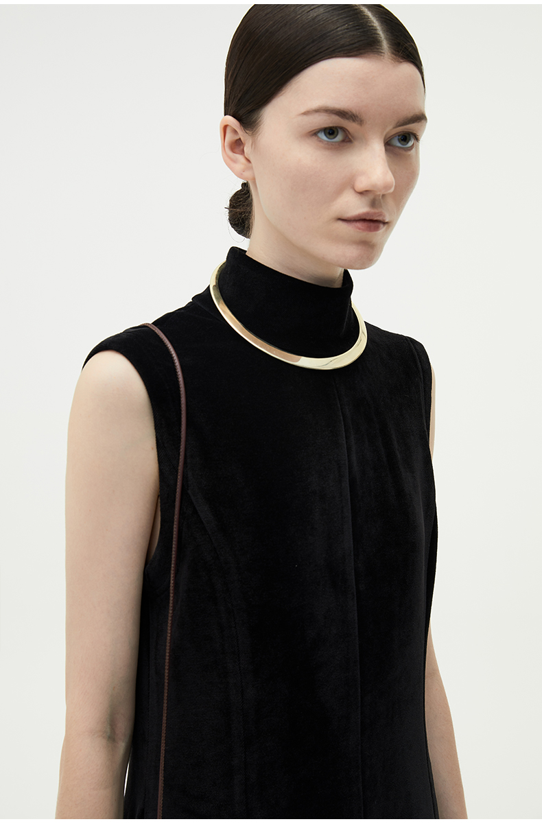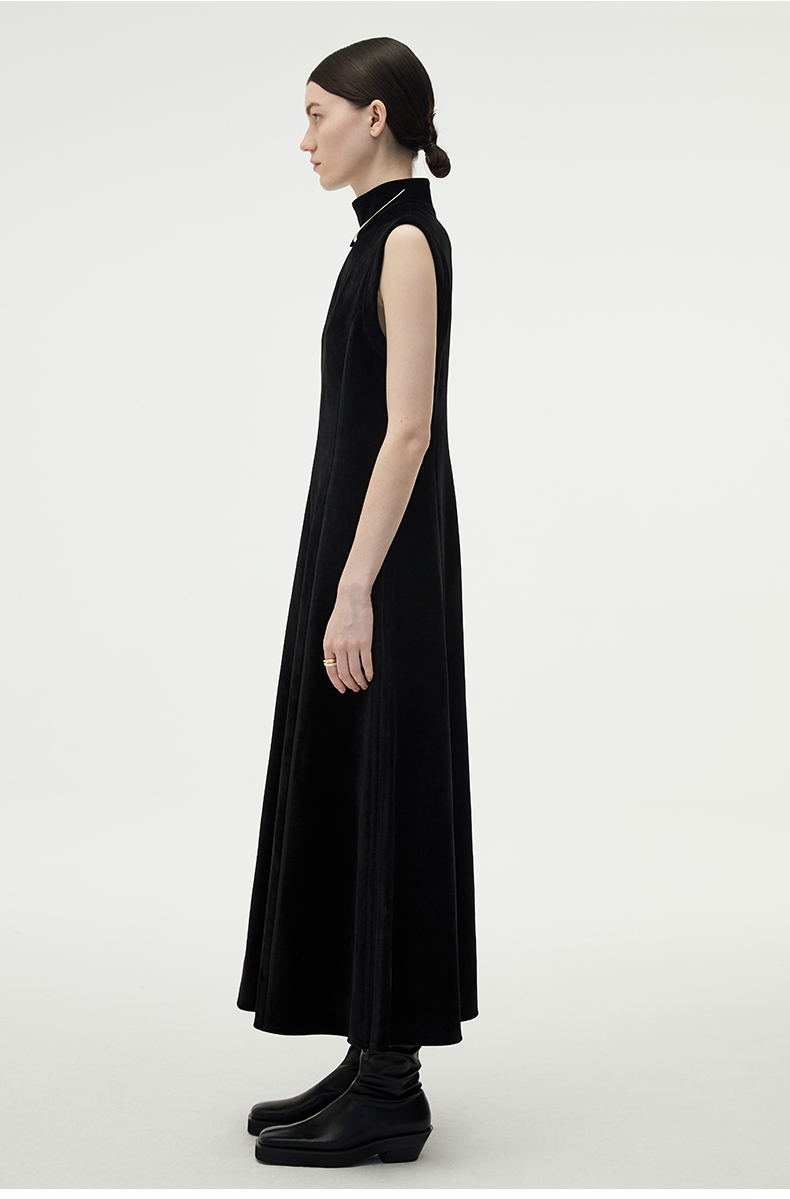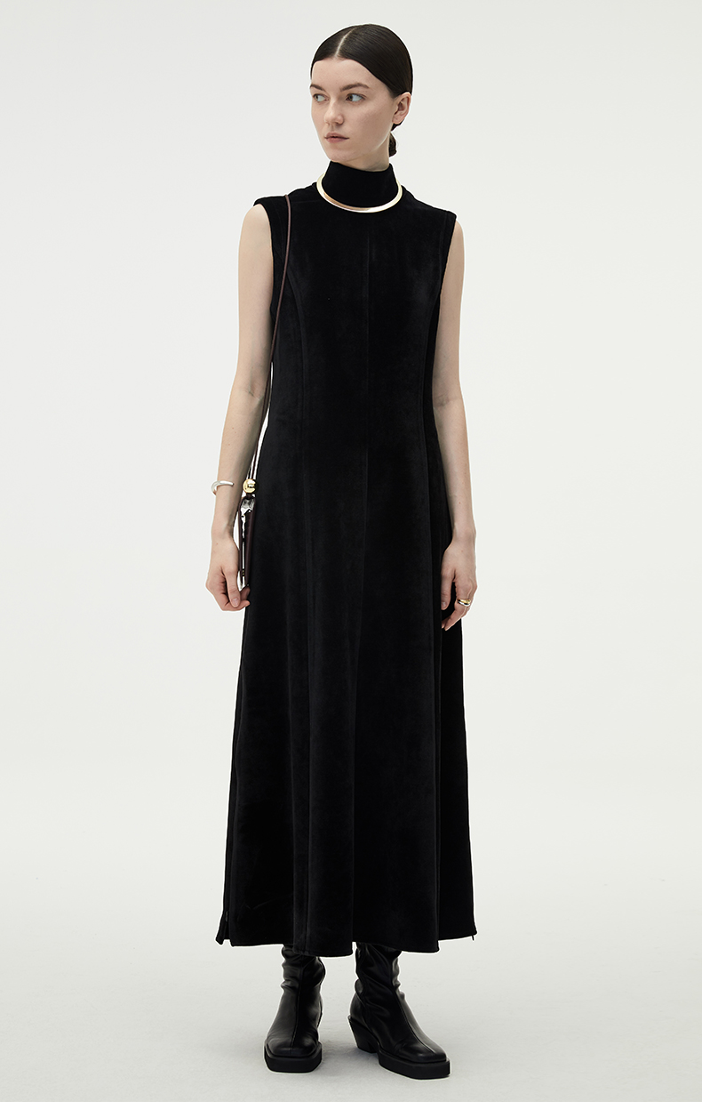 HIDEMI黑色小立领设计感立裁绒面背心长裙