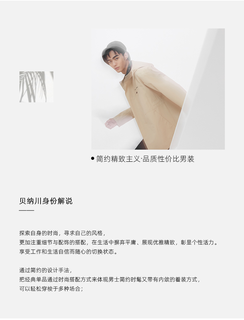 - 贝纳川男装致力于为不盲目追随潮流,坚持自己风格,注重细节与配饰搭配的而立之年轻熟男打造时髦、简约、轻松、真实的着衣风格。