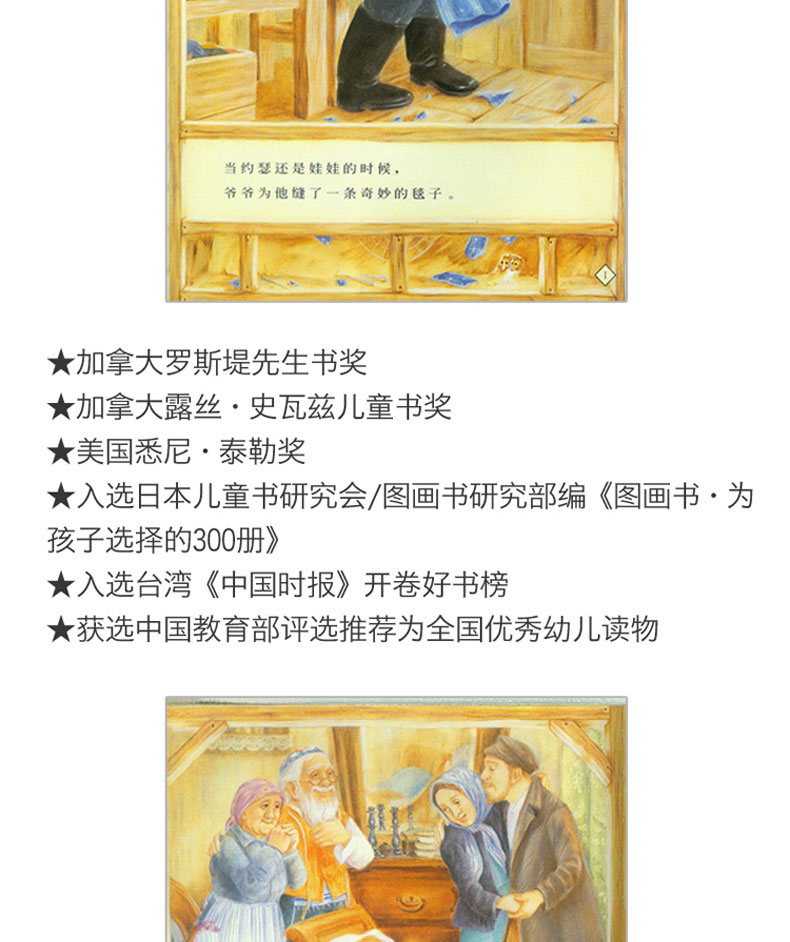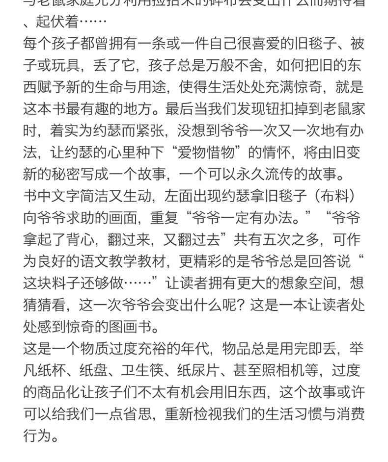 当约瑟还是娃娃的时候,爷爷为他缝了一条奇妙的毯子。……毯子又舒服、又保暖,还可以把噩梦通通赶跑。不过,约瑟渐渐长大了,奇妙的毯子也变得老旧了。……《爷爷一定有办法(精)》由菲比·吉尔曼所著,作者用重复而富节奏的文字来重述,既温馨又朗朗上口。图画则细腻地描绘出充满浓厚人情味的小镇和约瑟的家庭,不管是人们丰富的表情、家具、物品,都非常的生动、传神。