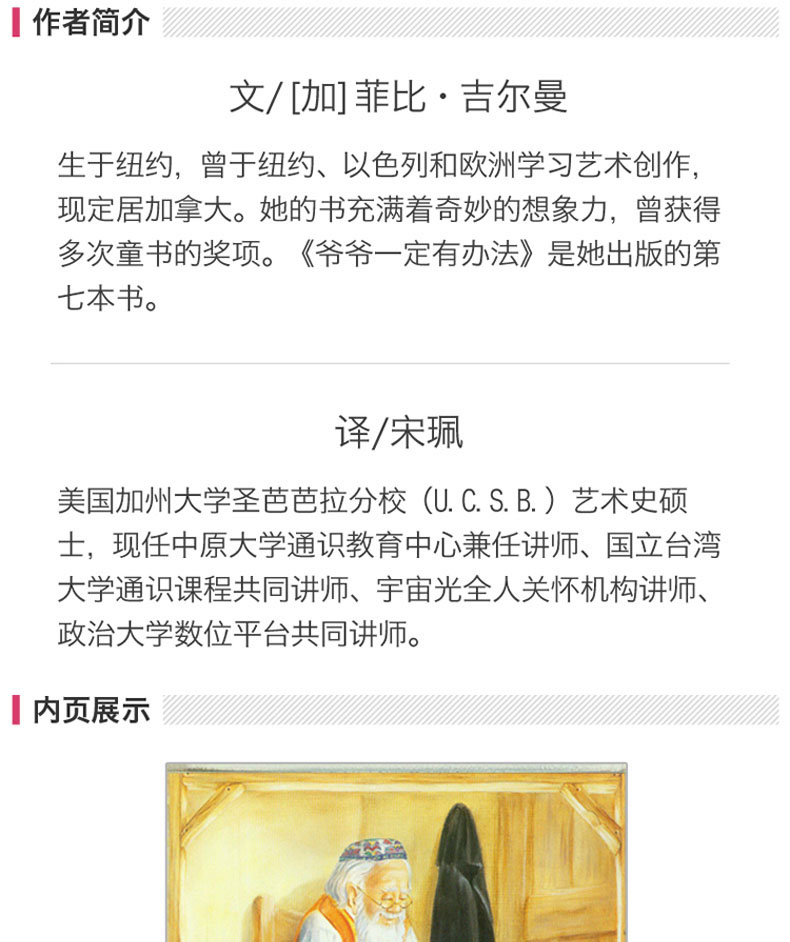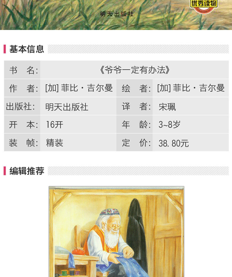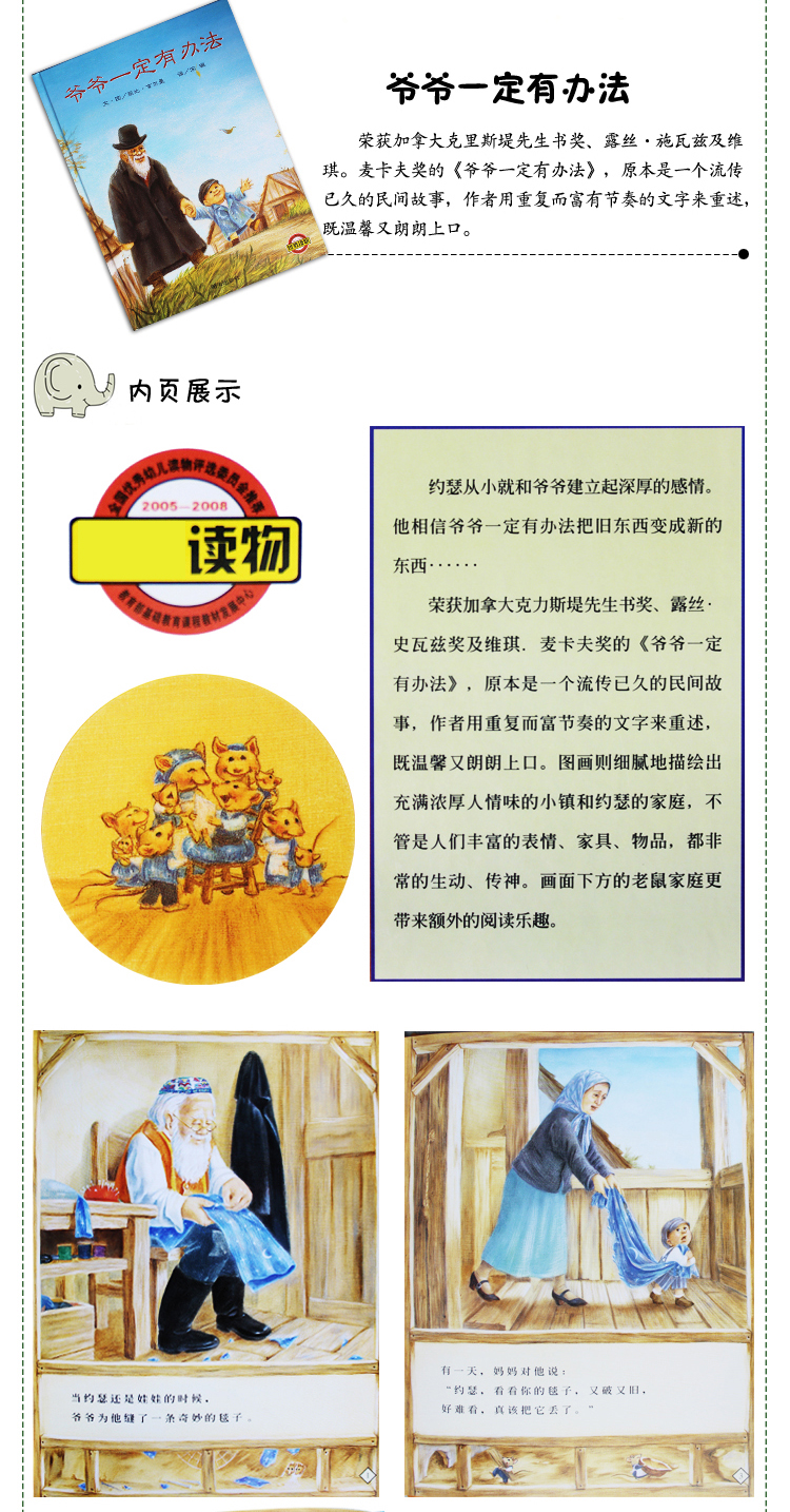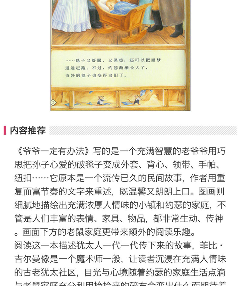 约瑟从小就和爷爷建立起深厚的感情。他相信爷爷一定有办法把旧东西变成新的东西……荣获加拿大克力斯堤先生书奖、露丝·史瓦兹奖及维琪·麦卡夫奖的《爷爷一定有办法(精)》(菲比·吉尔曼所著),《爷爷一定有办法(精)》原本是一个流传已久的民间故事,作者用重复而富节奏的文字来重述,既温馨又朗朗上口。图画则细腻地描绘出充满浓厚人情味的小镇和约瑟的家庭,不管是人们丰富的表情、家具、物品,都非常的生动、传神。画面下方的老鼠家庭更带来额外的阅读乐趣。