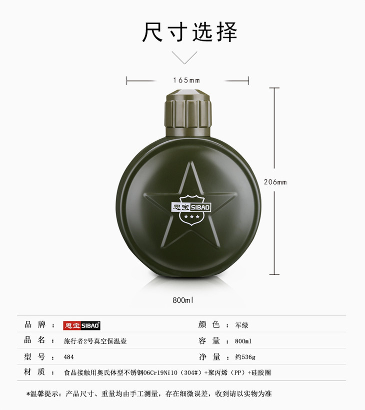 思宝旗舰店真空保温壶旅行者2#户外出行指南针军壶大容量驴友水壶