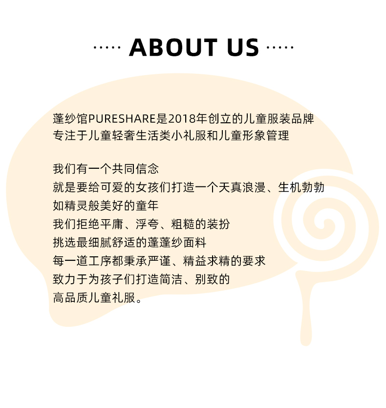 PureShare蓬纱馆,2018年创立的儿童服装品牌,专注于儿童轻奢生活类小礼服,主张“让孩子做最独特的自己”的品牌理念,为孩子们提供时尚简洁、优雅而又不失童真的生活类礼服。