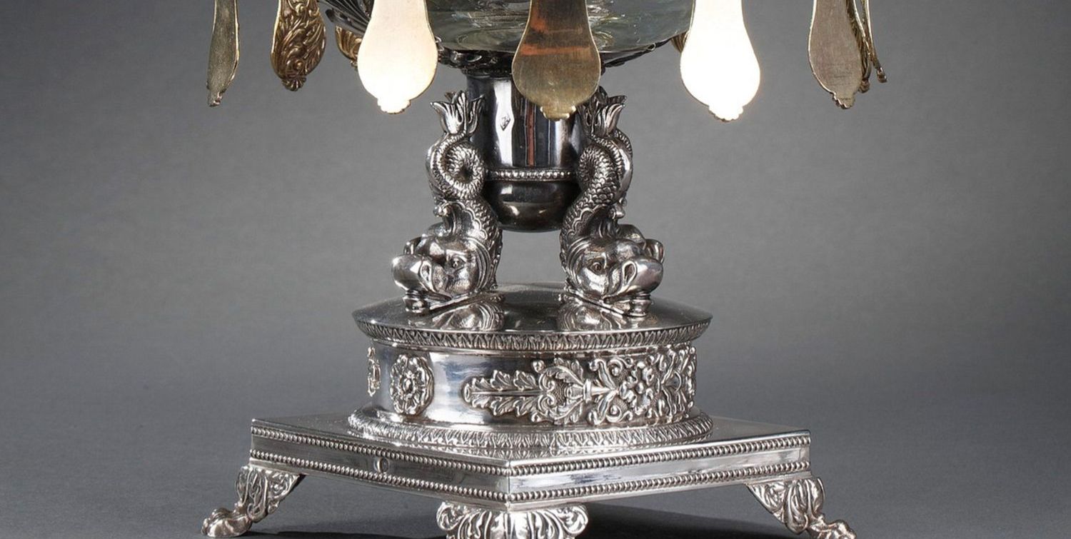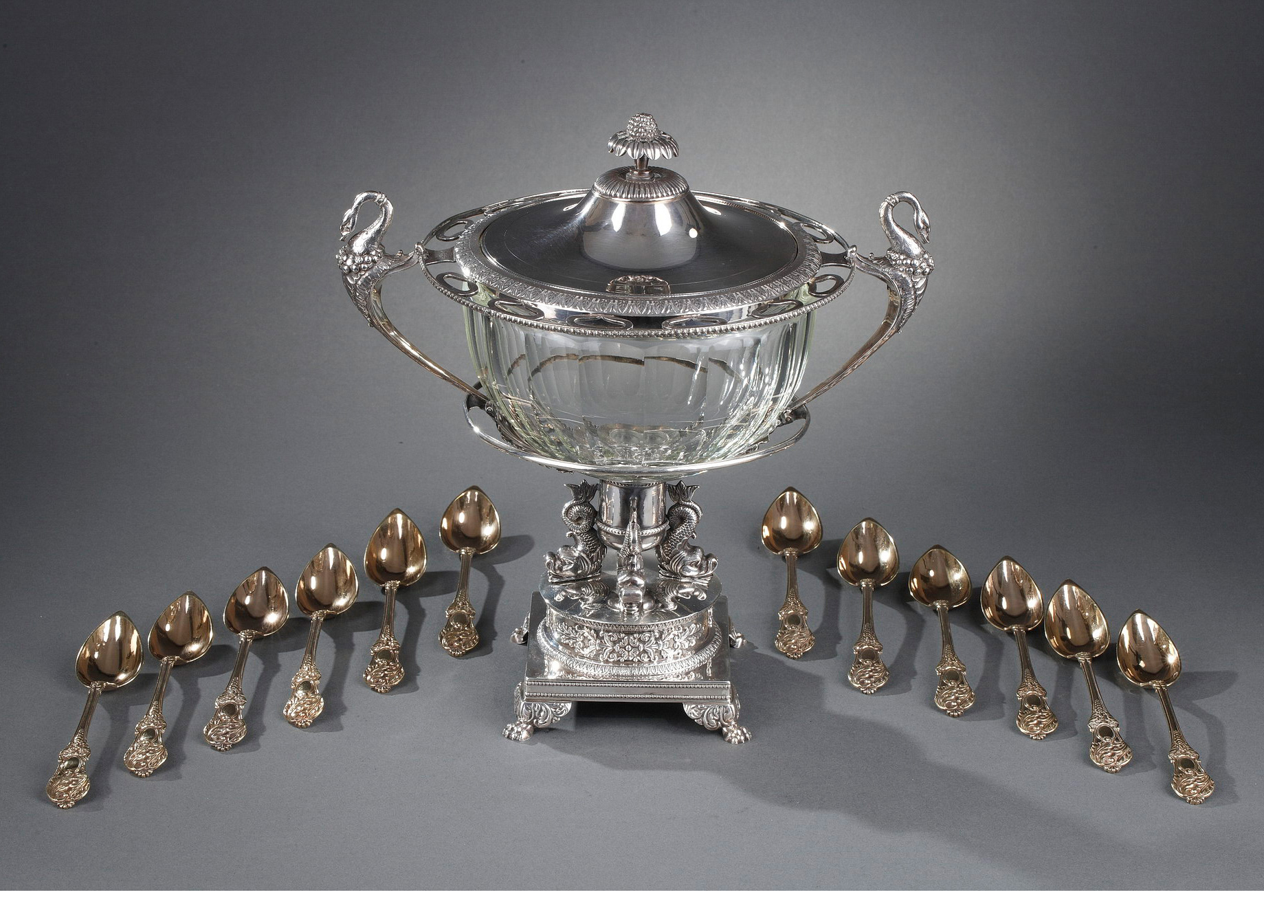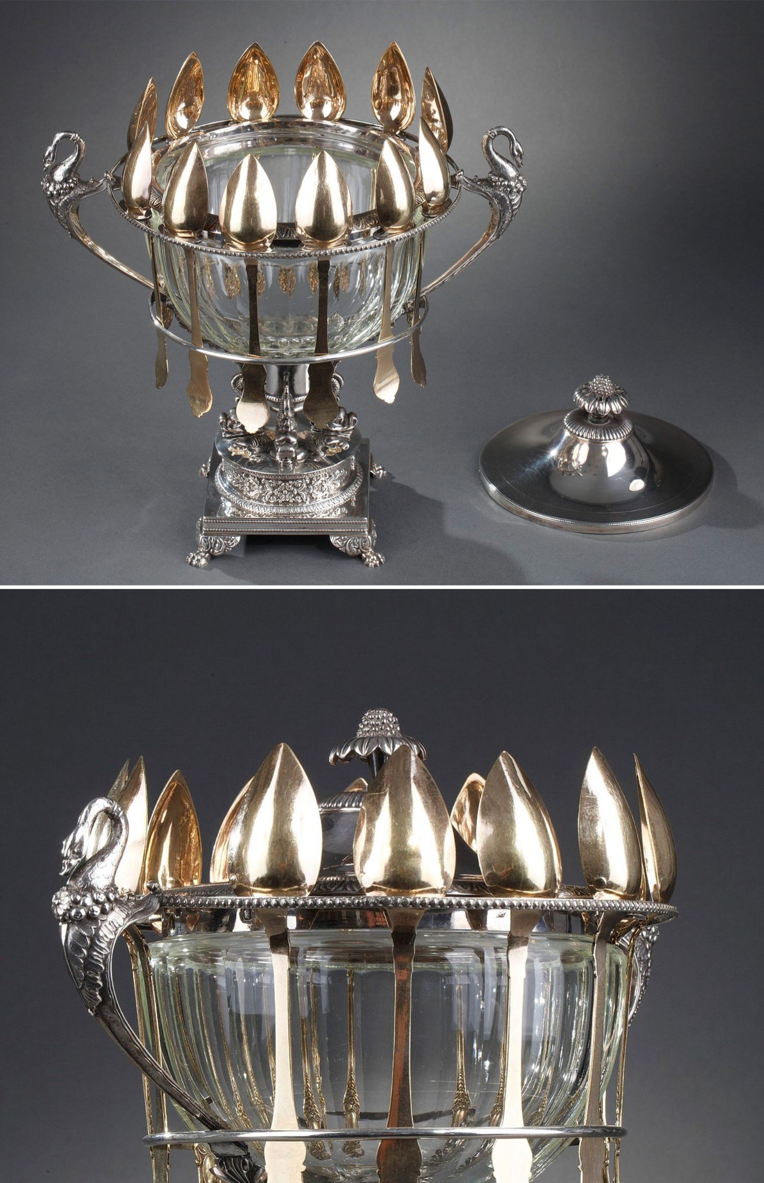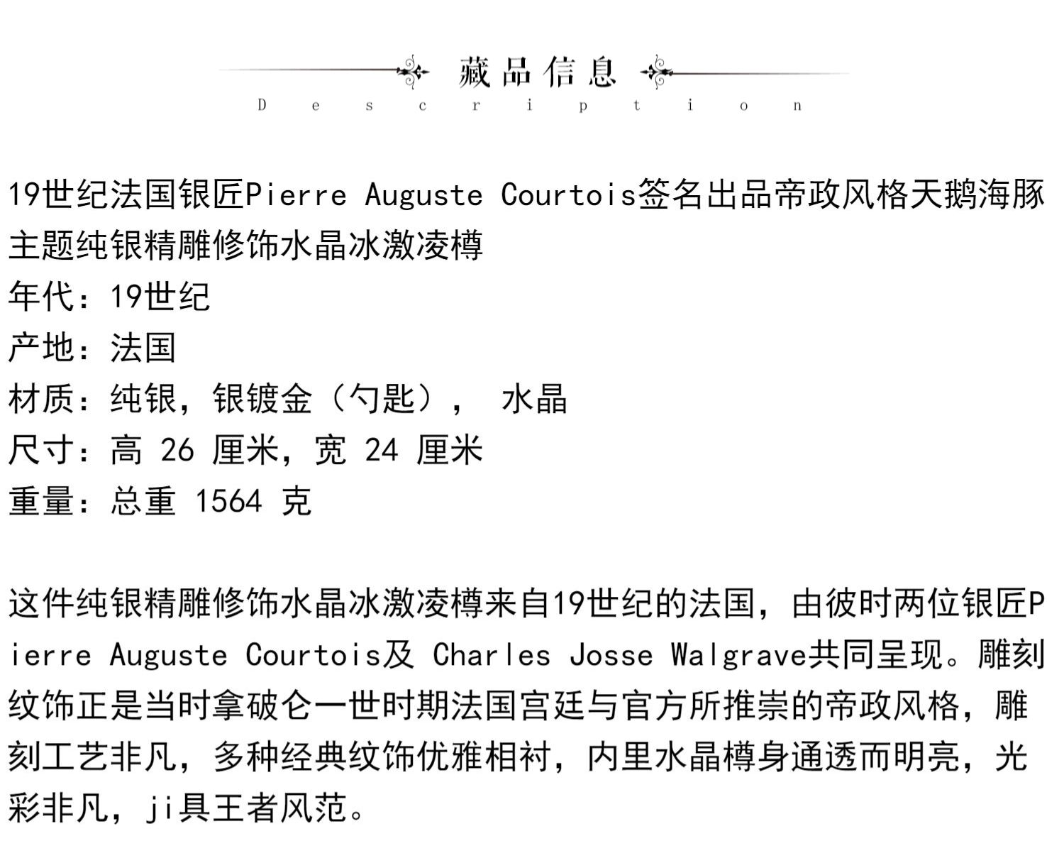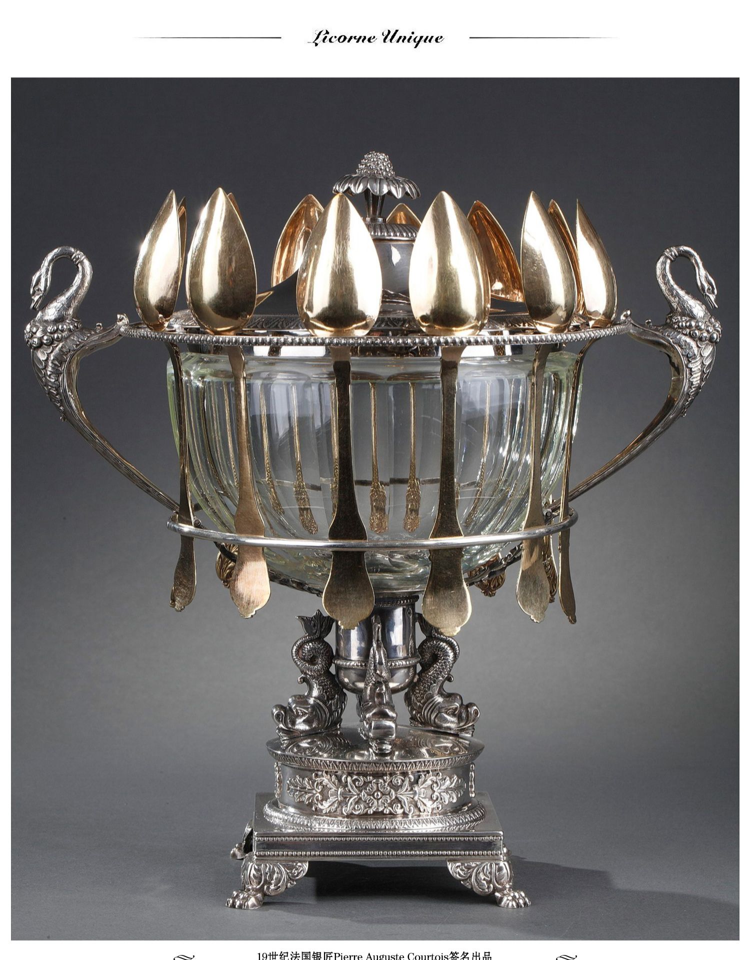 独角鹿西洋古董法国银匠帝政风格天鹅海豚纯银精雕水晶冰激凌樽