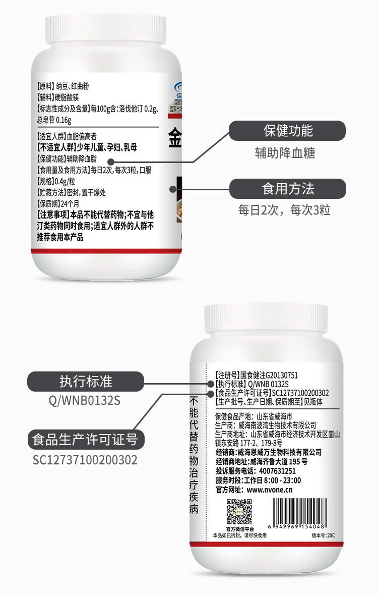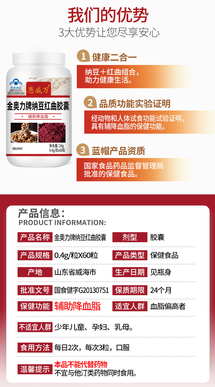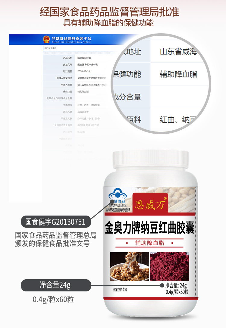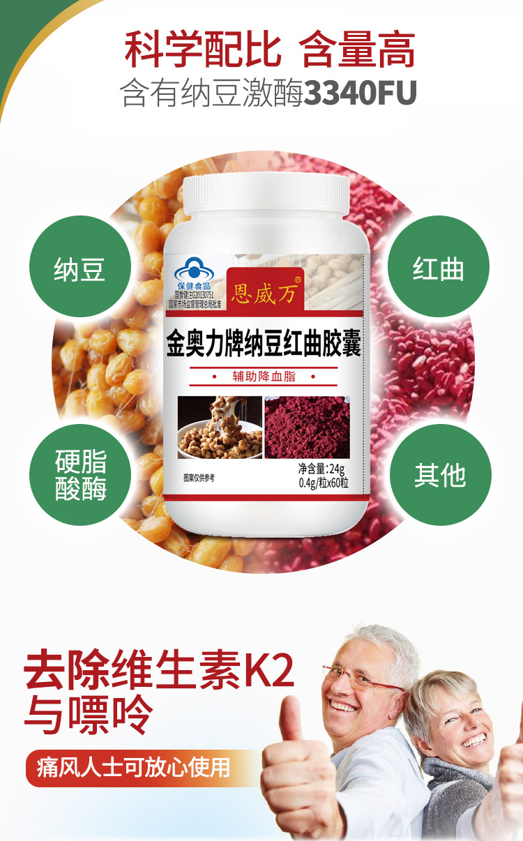 【血管通畅无负担】纳豆红曲血管清 辅助绛血脂 呵护心脑健康 疏通血管堵塞 蓝帽认证保健食品 纳豆红曲胶囊60粒瓶