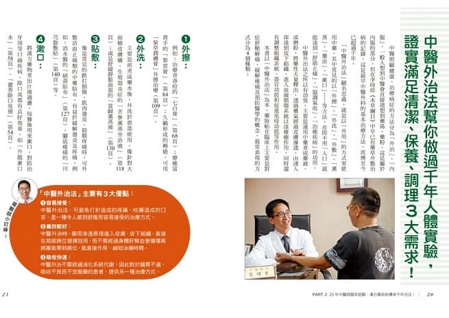 書中使用常見又容易購得的當歸、何首烏、川芎、甘草等20種天然中草藥互相搭配,完全圖解配方與比例,將草本精華與中藥一起融入,加上醫師的「對症看診筆記」,讓各藥材達到相輔相成的最佳效果。