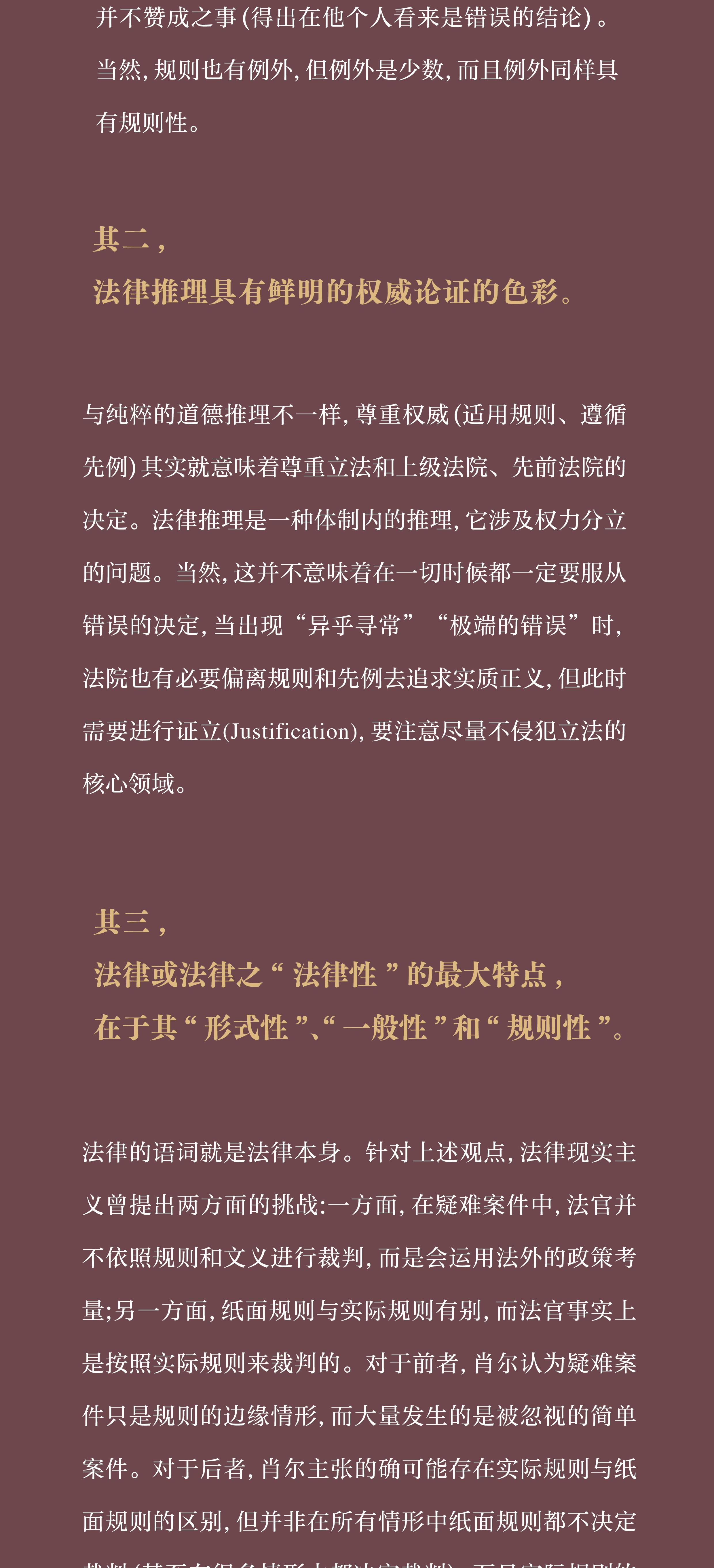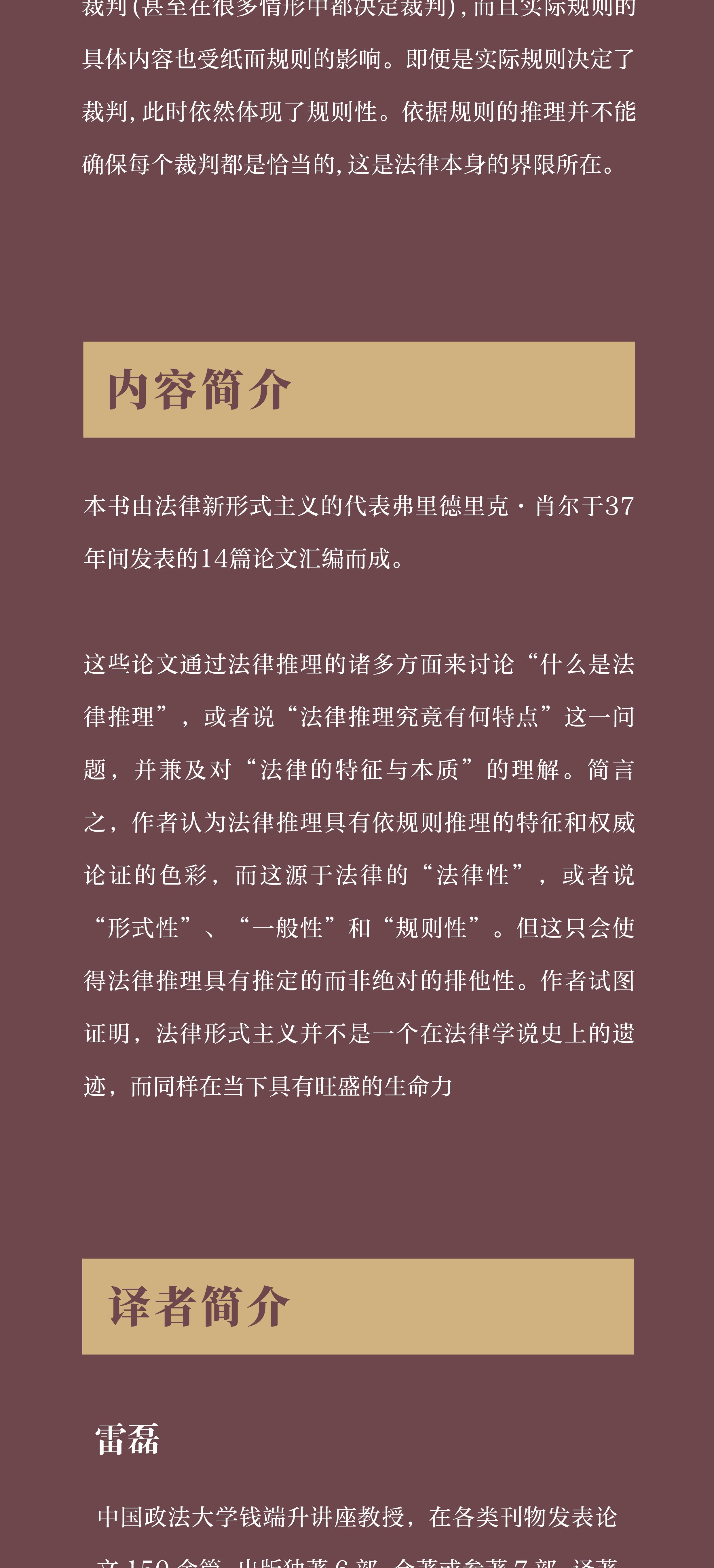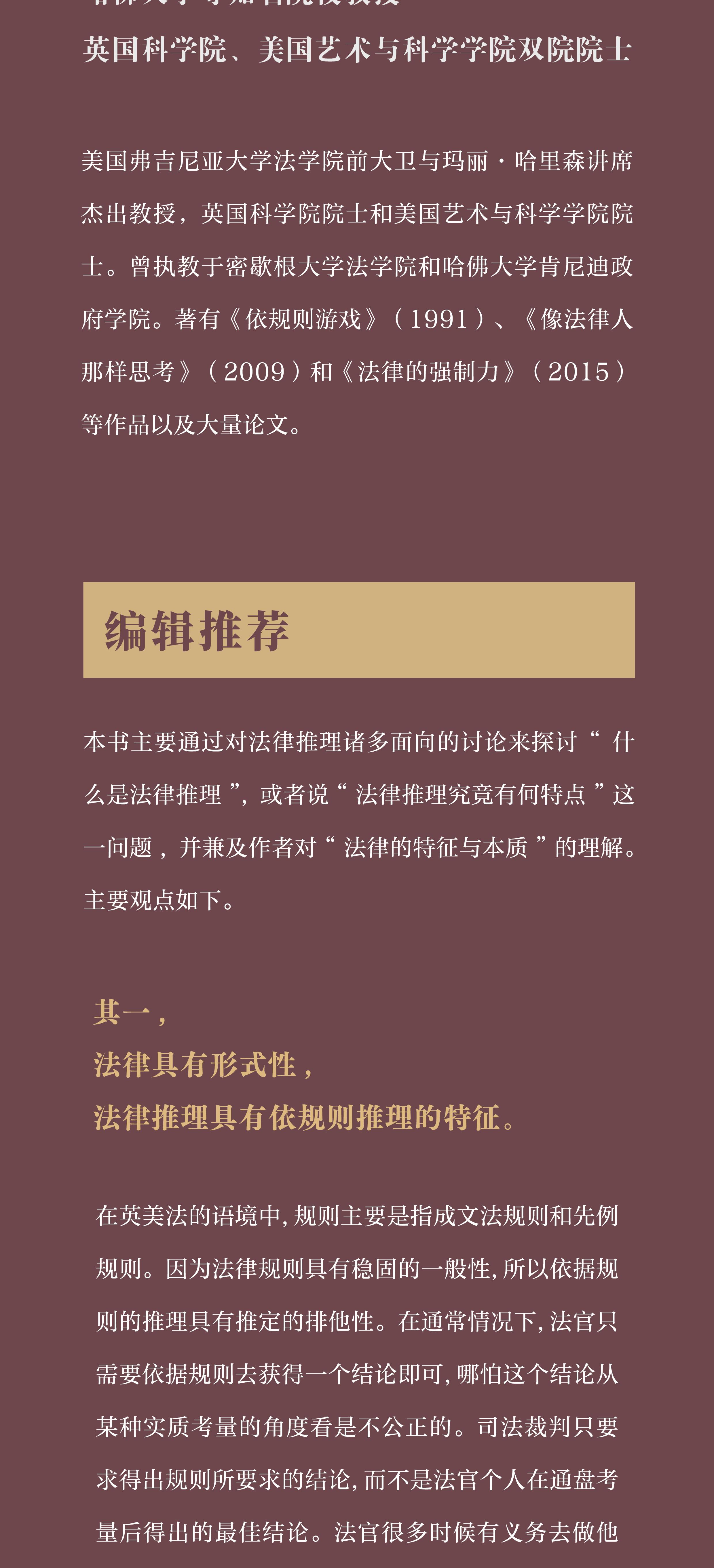 本书主要通过对法律推理诸多面向的讨论来探讨“什么是法律推理”,或者说“法律推理究竟有何特点”这一问题,并兼及作者对“法律的特征与本质”的理解。主要观点如下。其一,法律具有形式性,法律推理具有依规则推理的特征。在英美法的语境中,规则主要是指成文法规则和先例规则。因为法律规则具有稳固的一般性,所以依据规则的推理具有推定的排他性。在通常情况下,法官只需要依据规则去获得一个结论即可,哪怕这个结论从某种实质考量的角度看是不公正的。司法裁判只要求得出规则所要求的结论,而不是法官个人在通盘考量后得出的最佳结论。法官很多时候有义务去做他并不赞成之事(得出在他个人看来是错误的结论)。当然,规则也有例外,但例外是少数,而且例外同样具有规则性。其二,法律推理具有鲜明的权威论证的色彩。与纯粹的道德推理不一样,尊重权威(适用规则、遵循先例)其实就意味着尊重立法和上级法院、先前法院的决定。法律推理是一种体制内的推理,它涉及权力分立的问题。当然,这并不意味着在一切时候都一定要服从错误的决定,当出现“异乎寻常”“极端的错误”时,法院也有必要偏离规则和先例去追求实质正义,但此时需要进行证立(justification),要注意尽量不侵犯立法的核心领域。其三,法律或法律之“法律性”的最大特点,在于其“形式性”、“一般性”和“规则性”。法律的语词就是法律本身。针对上述观点,法律现实主义曾提出两方面的挑战:一方面,在疑难案件中,法官并不依照规则和文义进行裁判,而是会运用法外的政策考量;另一方面,纸面规则与实际规则有别,而法官事实上是按照实际规则来裁判的。对于前者,肖尔认为疑难案件只是规则的边缘情形,而大量发生的是被忽视的简单案件。对于后者,肖尔主张的确可能存在实际规则与纸面规则的区别,但并非在所有情形中纸面规则都不决定裁判(甚至在很多情形中都决定裁判),而且实际规则的具体内容也受纸面规则的影响。即便是实际规则决定了裁判,此时依然体现了规则性。依据规则的推理并不能确保每个裁判都是恰当的,这是法律本身的界限所在。