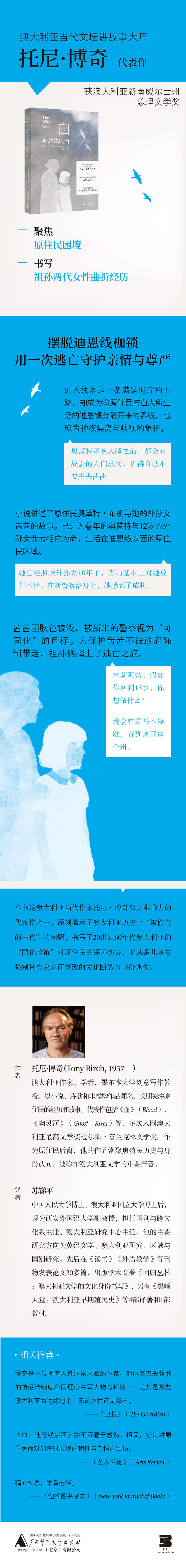 本书是澳大利亚当代作家托尼·博奇深具影响力的代表作之一,深刻揭示了澳大利亚历史上“被偷走的一代”的问题,书写了20世纪60年代澳大利亚的“同化政策”对原住民的深远伤害,尤其是儿童被强制带离家庭而导致的文化断裂与身份迷失。