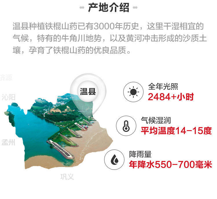 怀庆府的温县这个地方,气候环境被专家总结为“春不过旱,夏不过热,秋不过涝,冬不过冷”,特别适合山药的生长。由于此地北依太行山,南临黄河,被山河怀抱,得名为“怀”,又称“三百里怀川”。