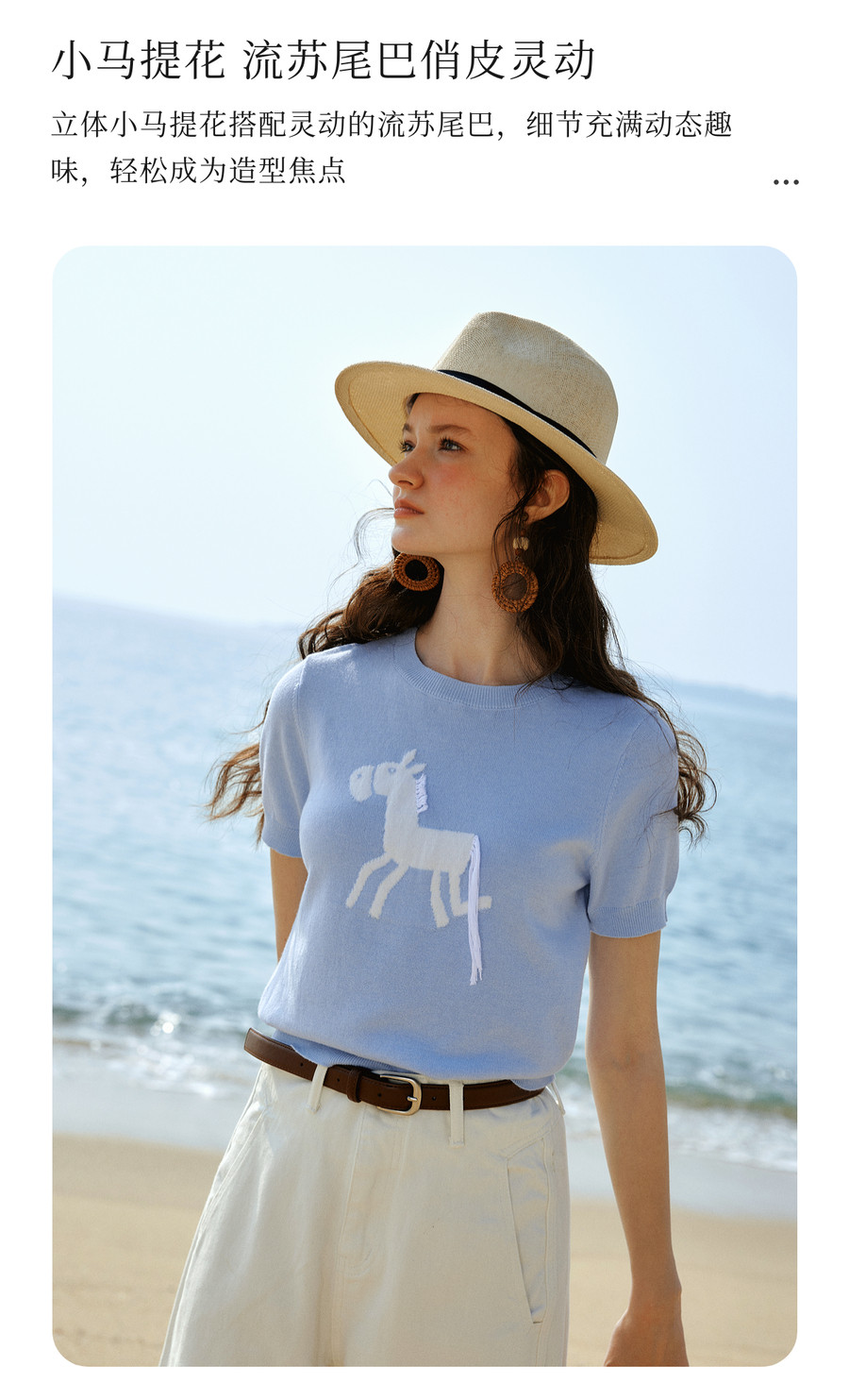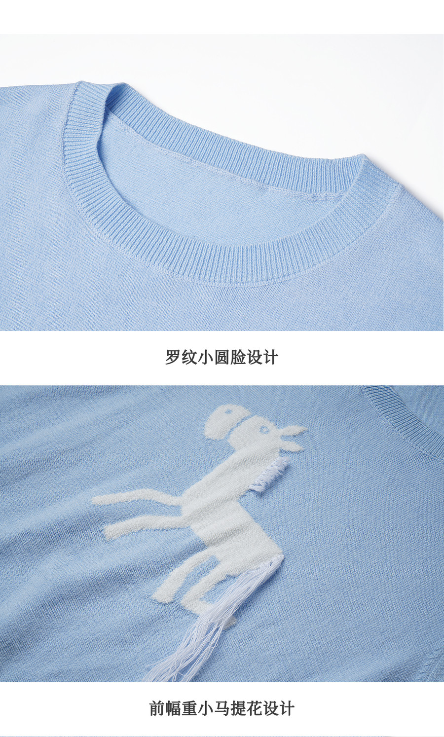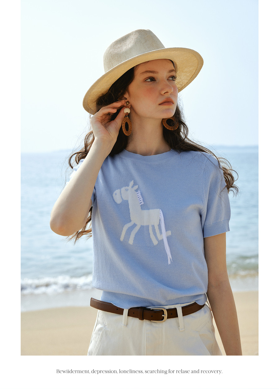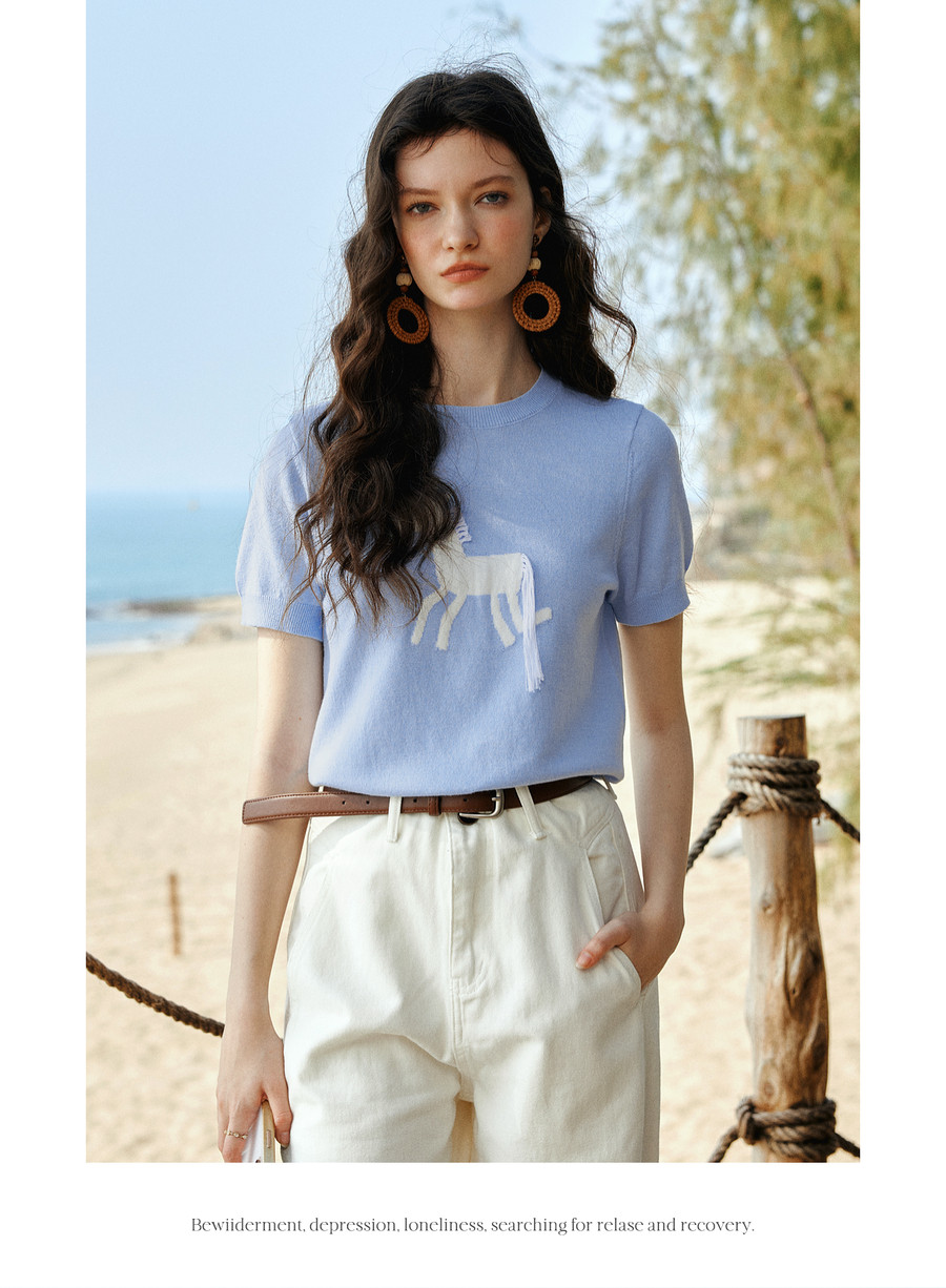 欧芮儿蓝色休闲重工趣味小马短袖针织衫女春季2026新款短袖上衣