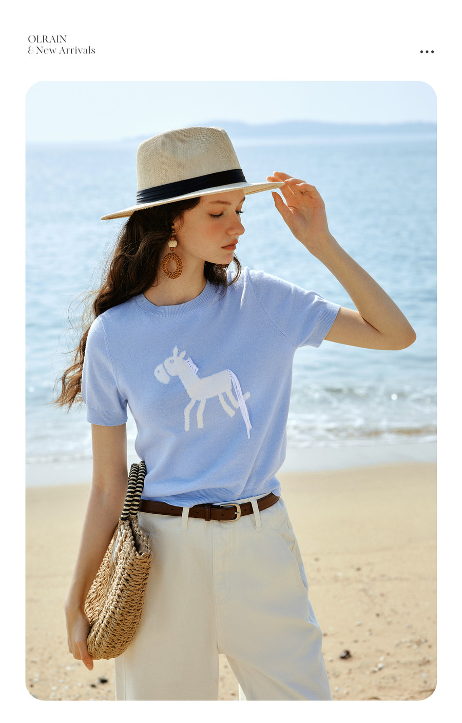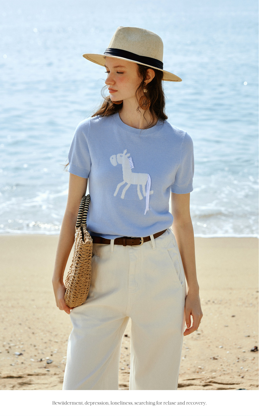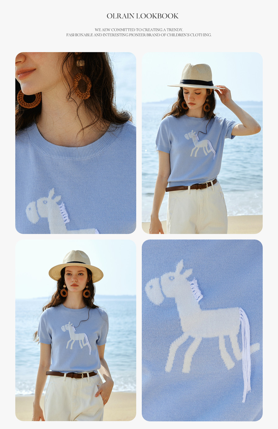 欧芮儿蓝色休闲重工趣味小马短袖针织衫女春季2026新款短袖上衣