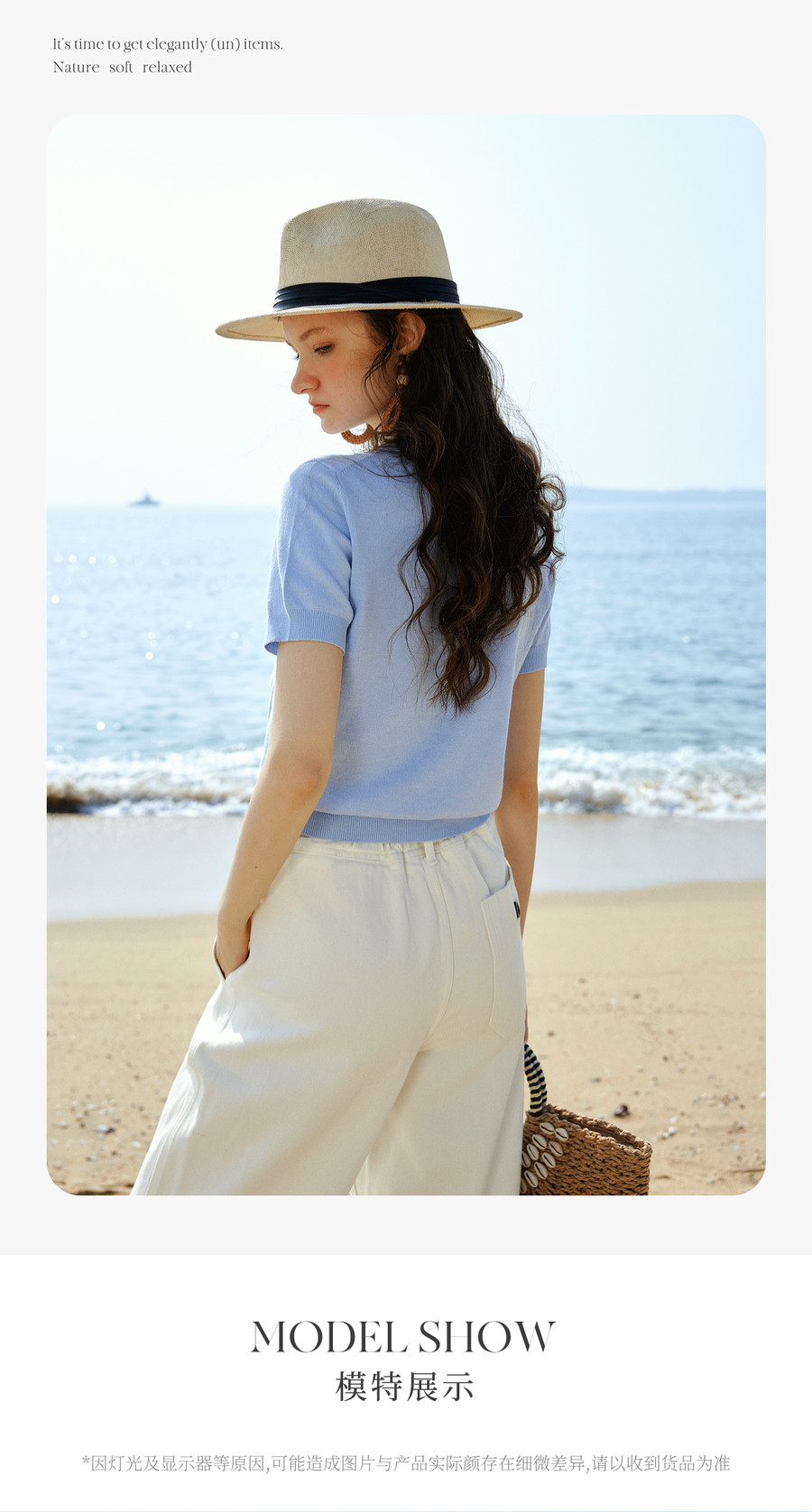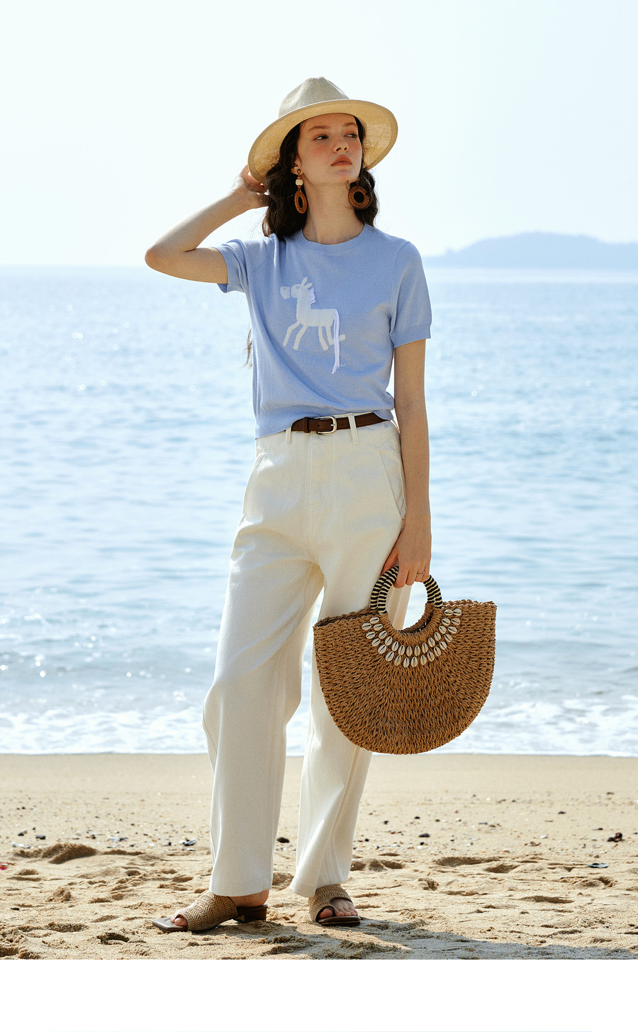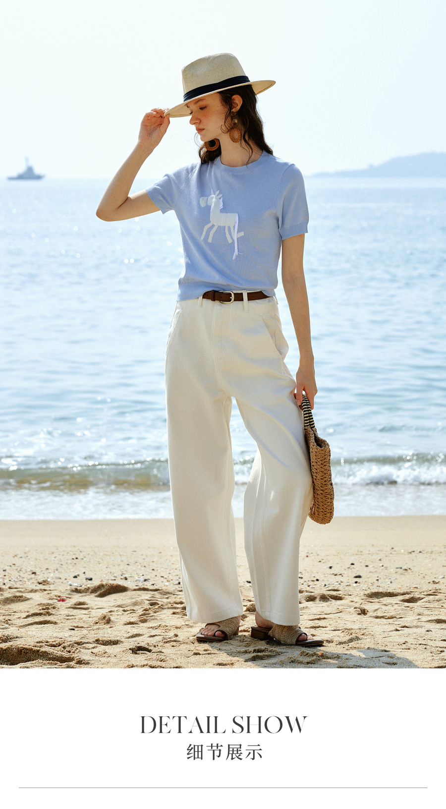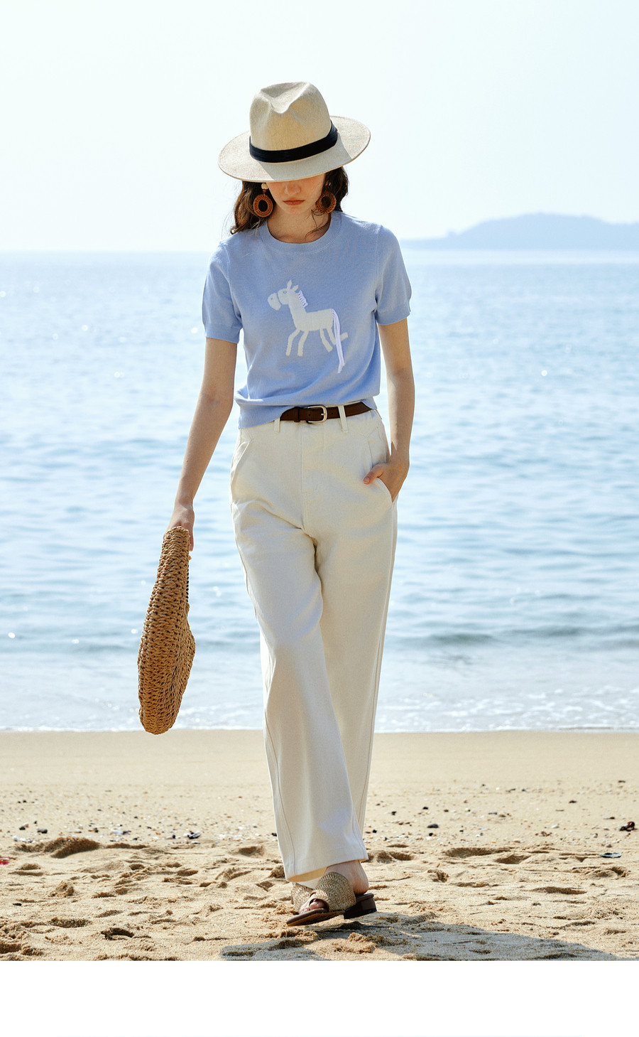 欧芮儿蓝色休闲重工趣味小马短袖针织衫女春季2026新款短袖上衣