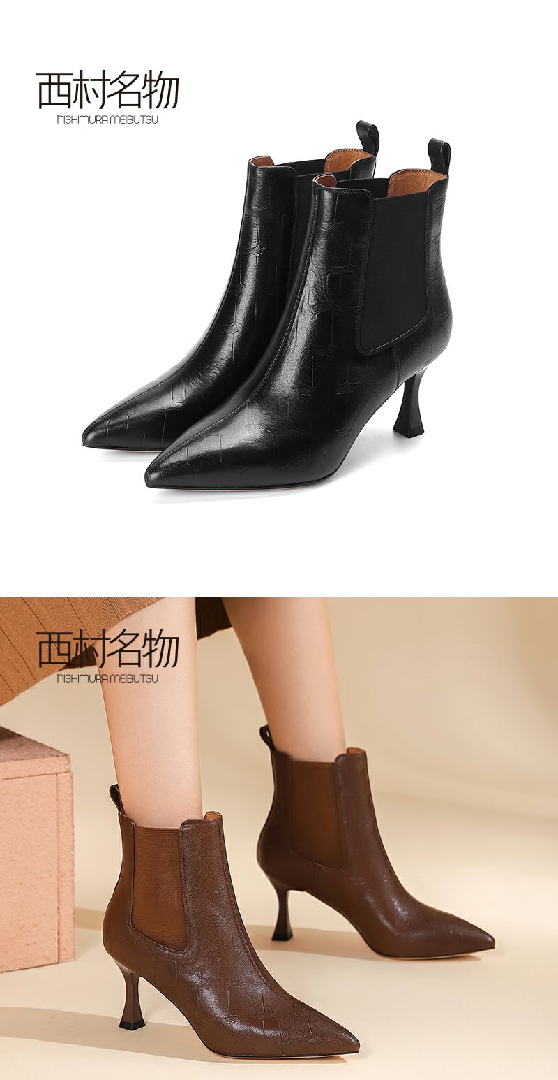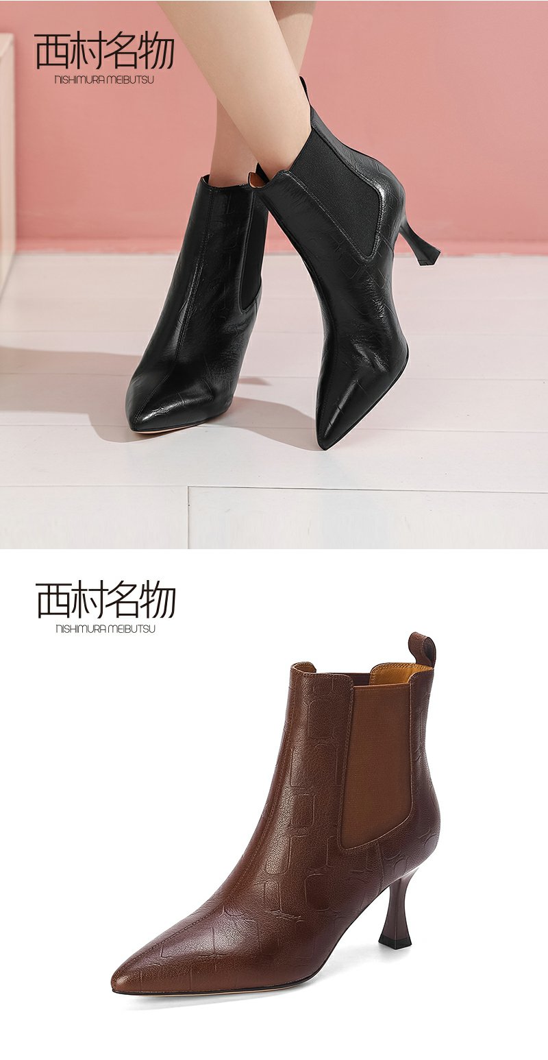 西村名物欧美短靴优雅尖头细跟羊皮压纹黑色皮靴女显瘦气质44881