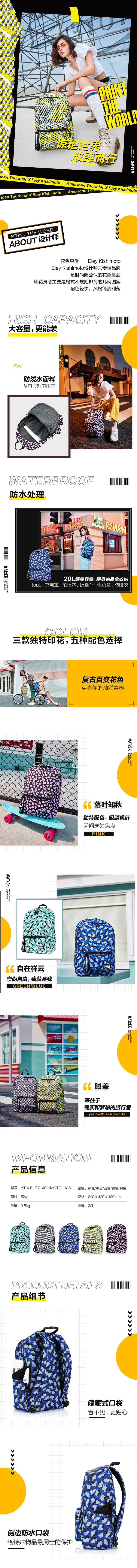 【美旅】EK联名 印花 时尚设计 潮流个性 街头撞色 轻便 宽织带 大容量 防泼水 双肩包 背包 书包 HA3*005