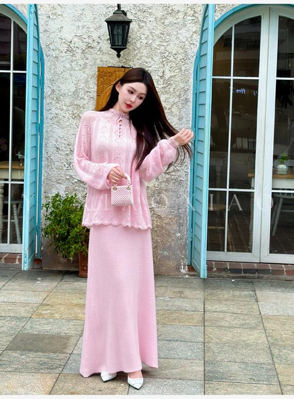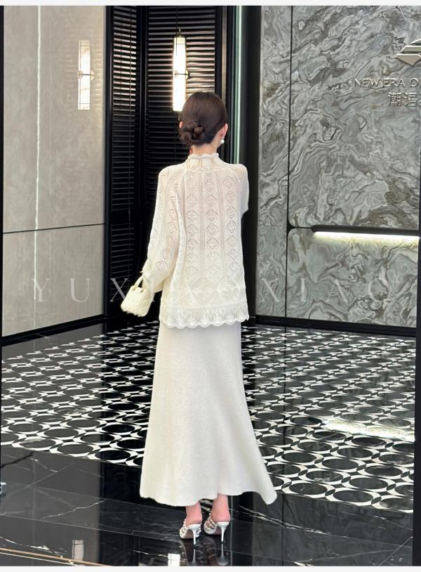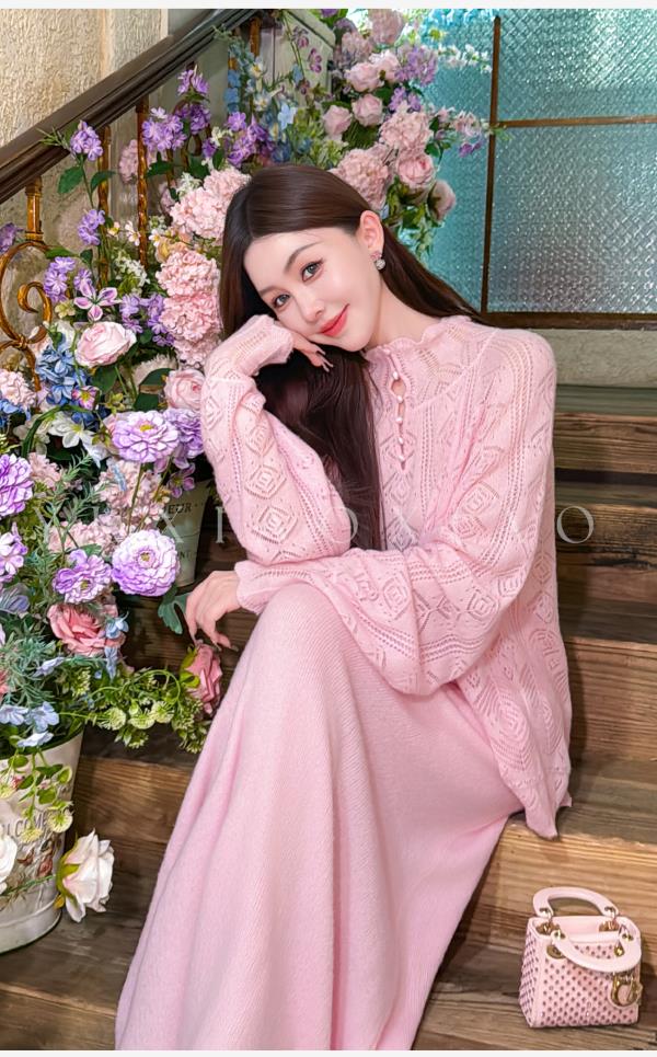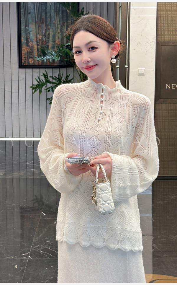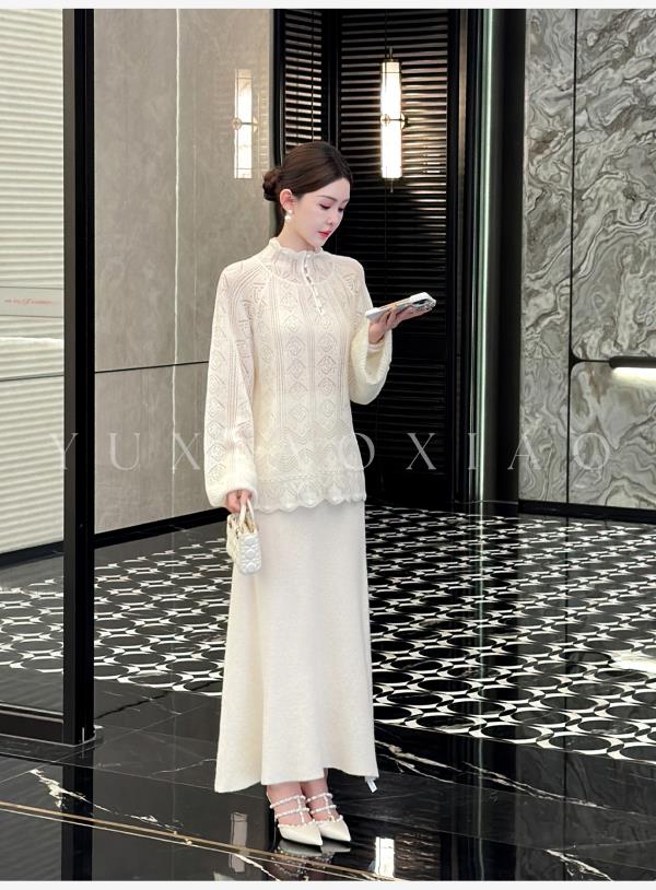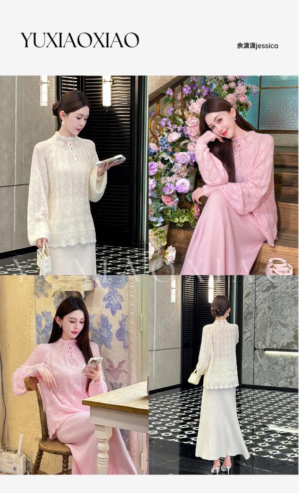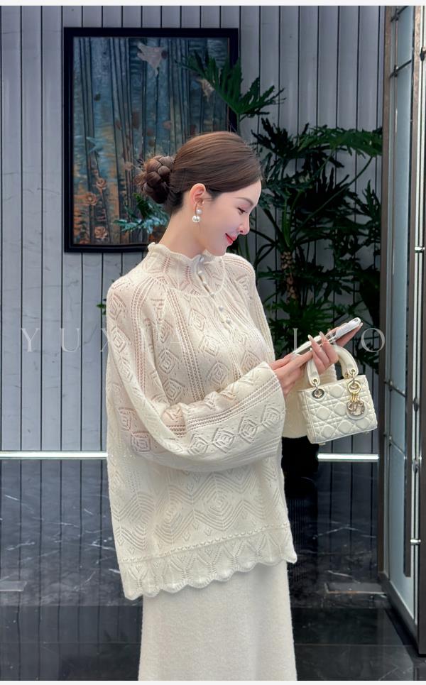 余潇潇【安妮假日】羊绒羊毛天丝混纺两面穿荷叶领毛衣&A摆长半裙