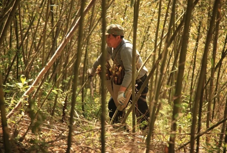 农户们需要走5公里山路,翻到向阳面的山麓,采挖大山的馈赠,竹笋挖好装运成袋,再从陡峭的山路运下来。