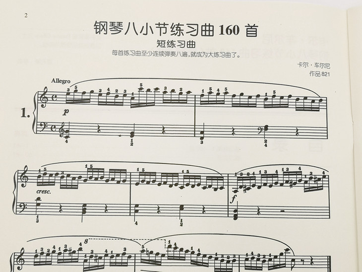 《车尔尼钢琴八小节练习曲160首:作品821》内容简介:车尔尼具有非凡的才能:他在有限的和声设计范围内发展与创造了在键盘上的各种手指训练。他所创作的大量练习曲集的特点是手指快速的跑动和清晰的乐句,大部分是为右手而作,作品的风格流畅、动听、愉悦,在当时这些作品极为流行。
