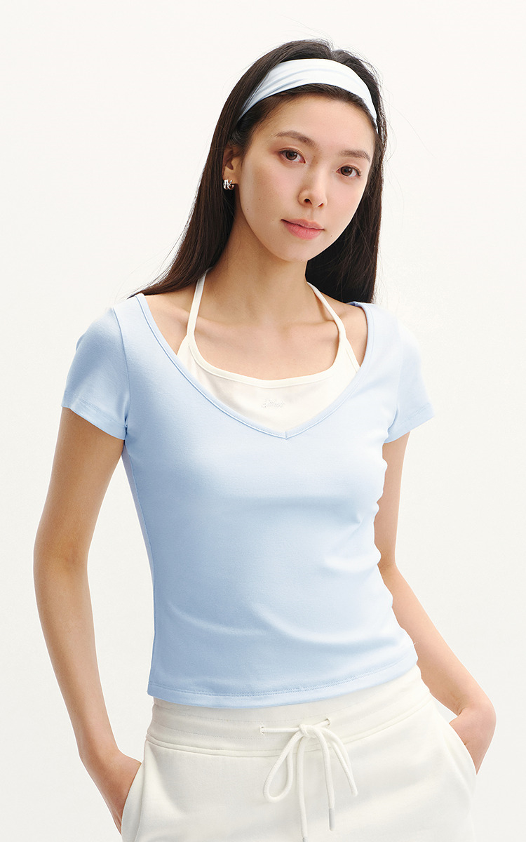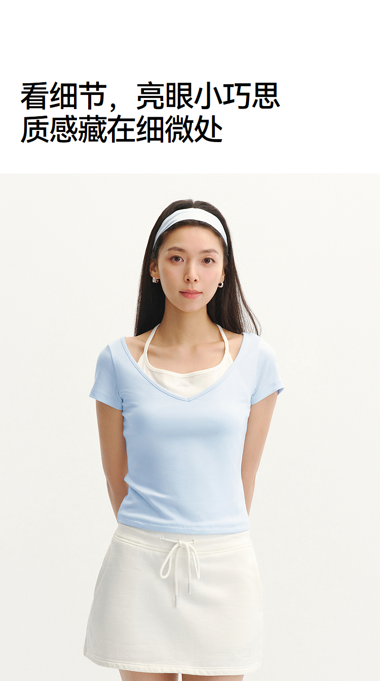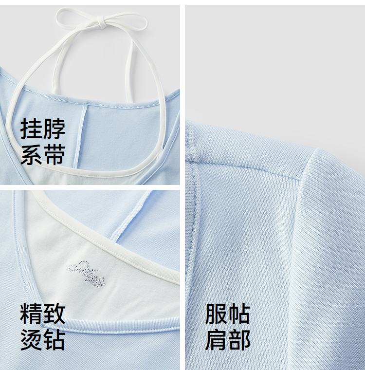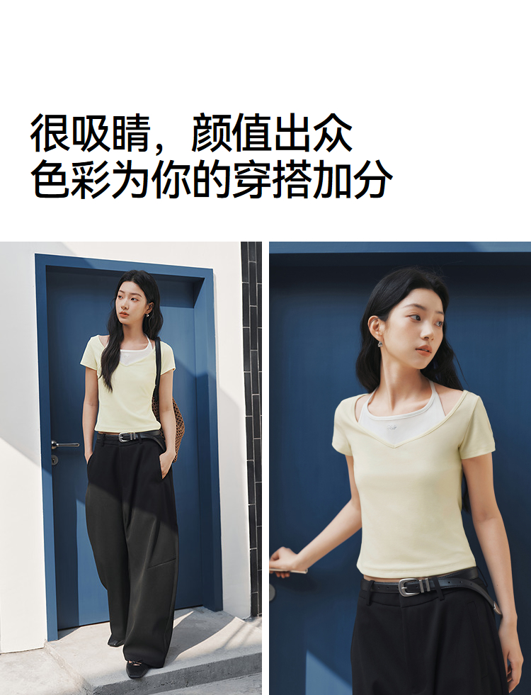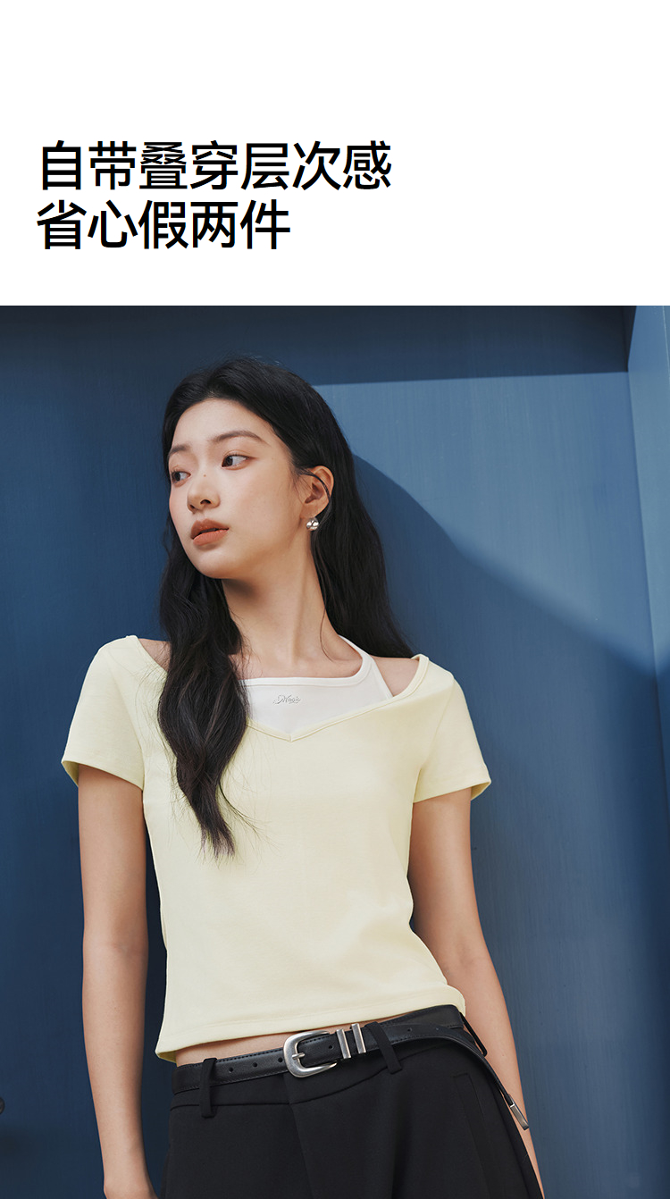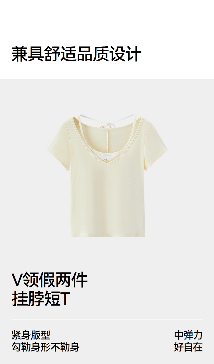 森马短袖T恤女夏季短款挂脖V领假两件蝴蝶结紧身烫钻2026新款上衣