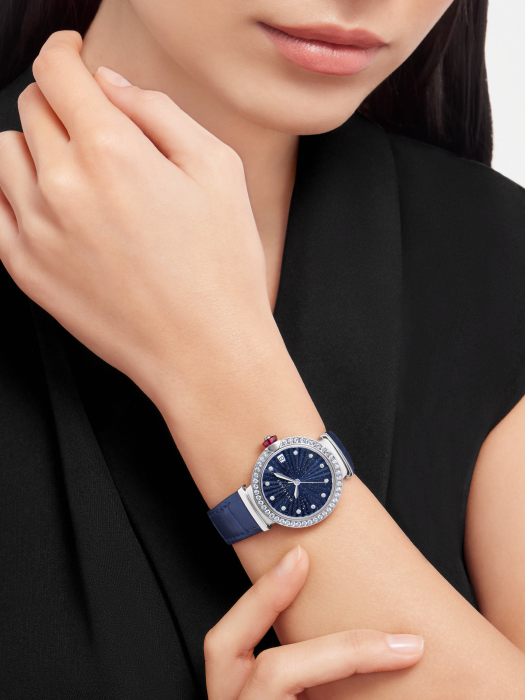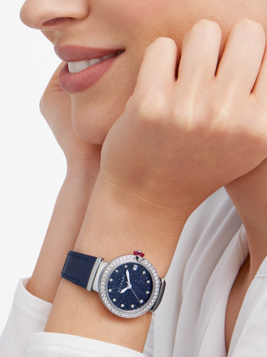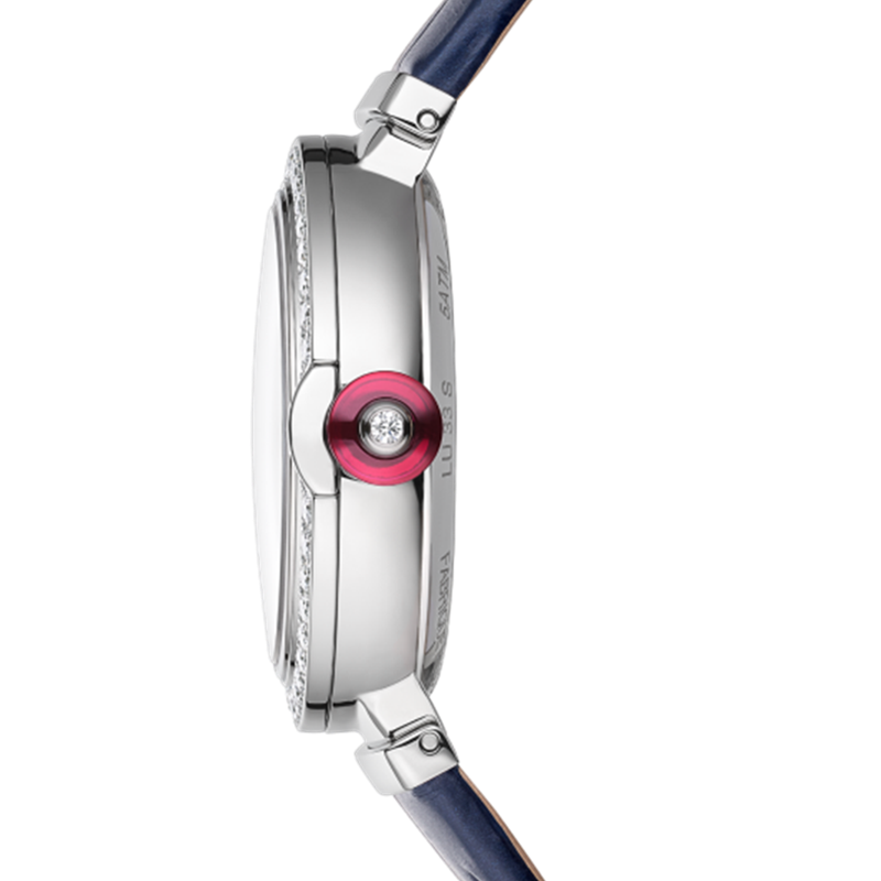 镜面 材质 | 蓝宝石水晶玻璃 | 表盘 | 精钢表壳 立体表盘缀以刻面蓝色砂金石装饰元素 11颗钻石时标 精钢表圈镶嵌圆形明亮式切割钻石,精钢表冠镶嵌一颗凸形蛋面切割合成红碧玺(约0.816克拉)和一颗圆形钻石 透底 |