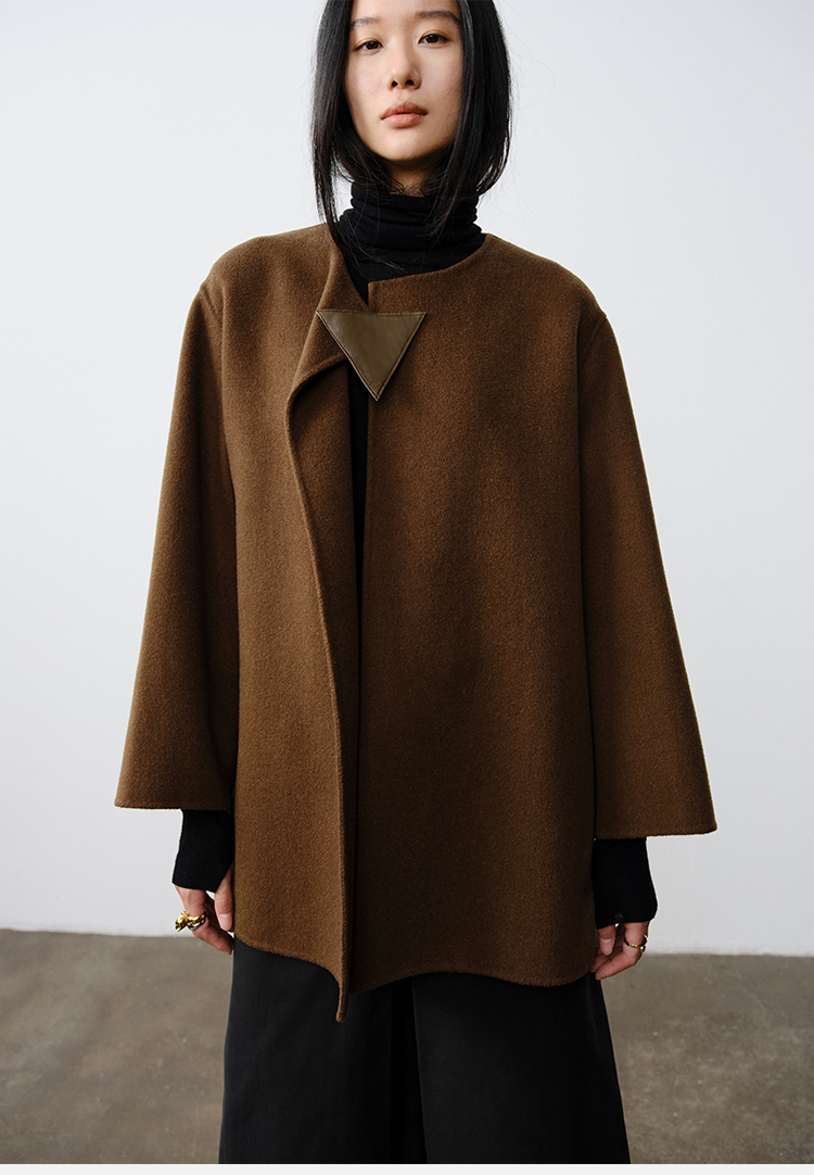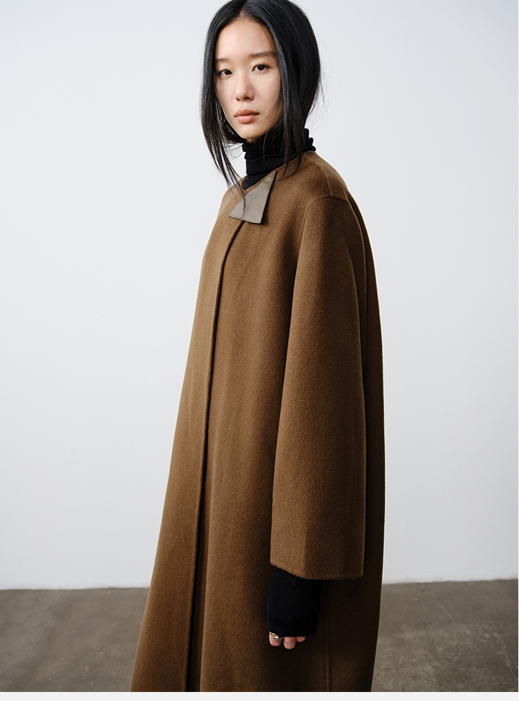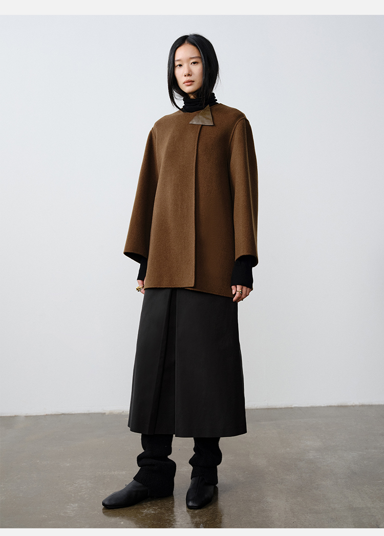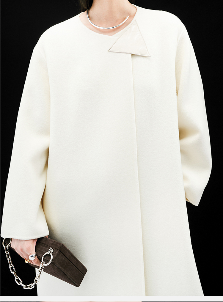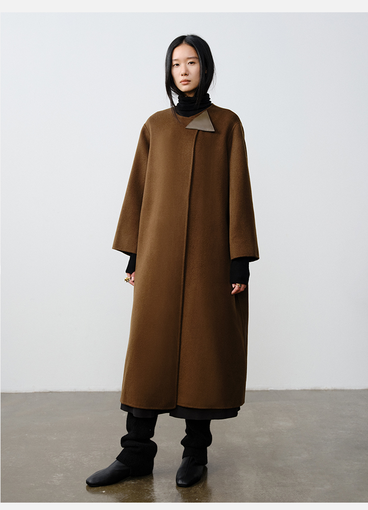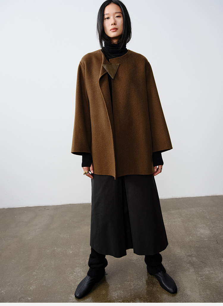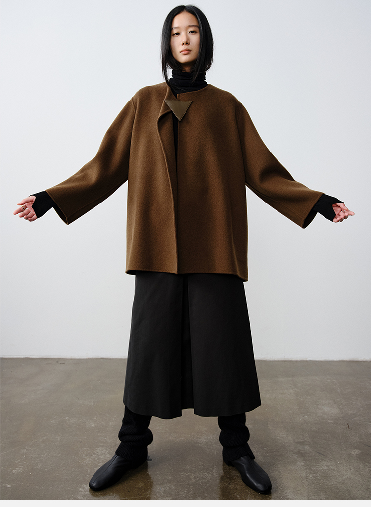 HIDEMI 几何三角形拼皮美利奴羊毛廓形大衣 长款/短款