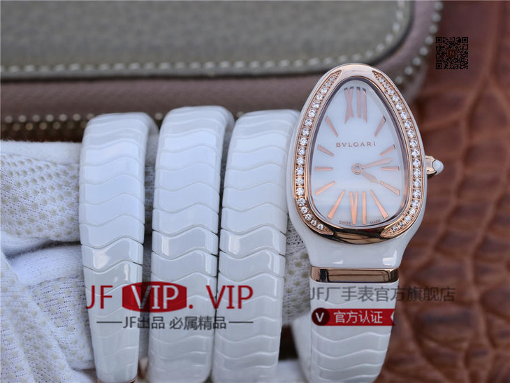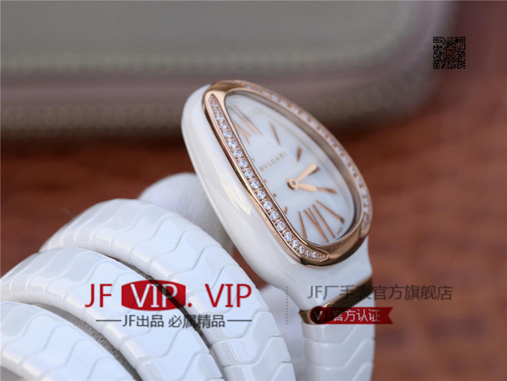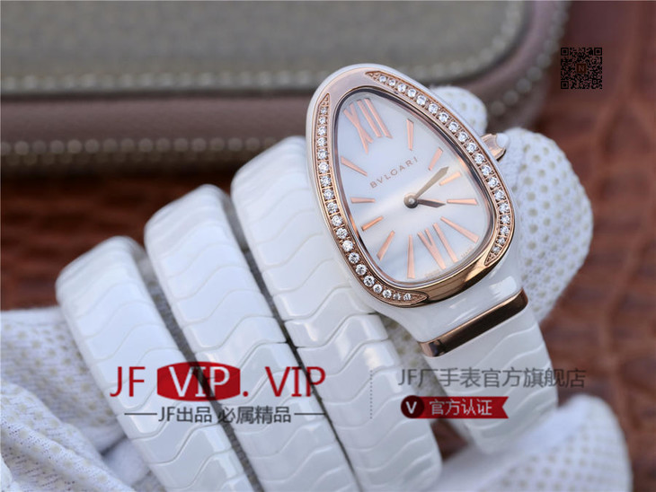 BV宝格丽SERPENTI系列白色陶瓷与黑陶瓷腕表以精美蛇形向众人展现时尚奢华之美。表圈处镶嵌切割美钻,精美奢华。腕表精致奢华,精美蛇形腕表缠绕于腕间,亮丽时尚。BV厂永远让爱美的你走时尚路线,配送专柜全套礼盒。