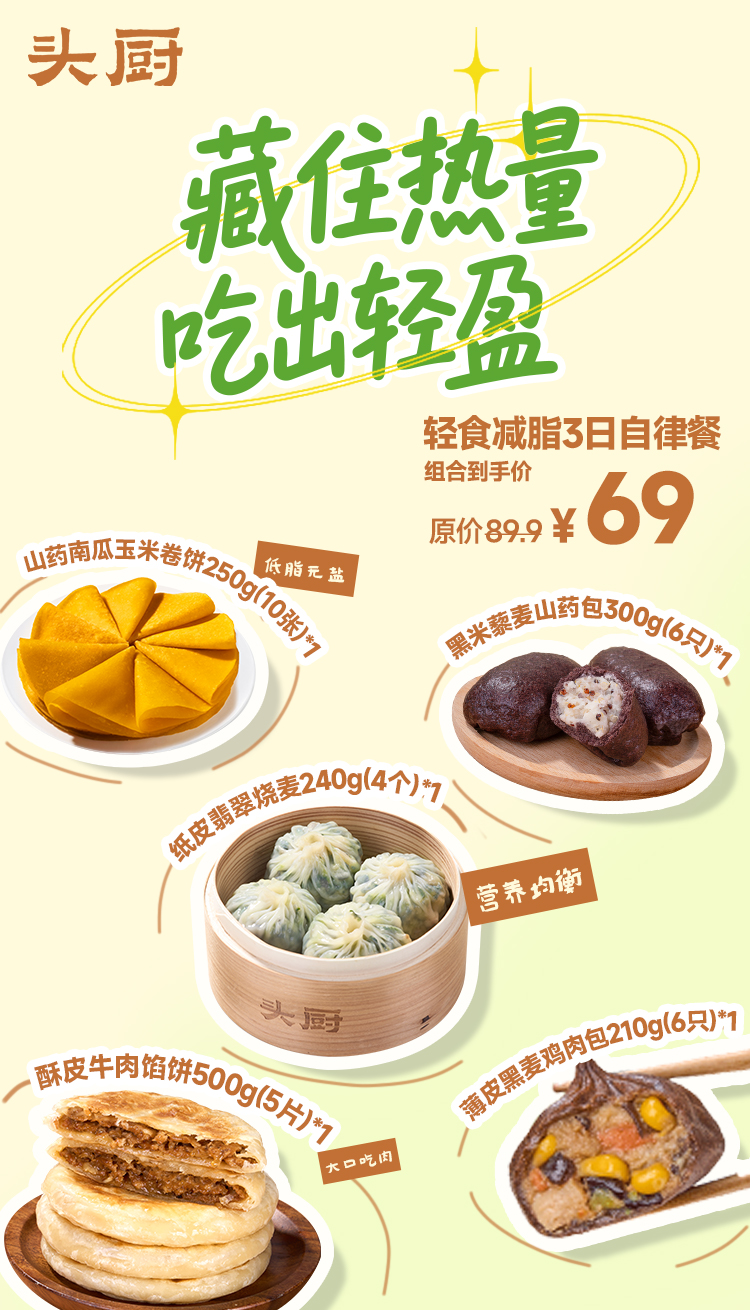 头厨|轻食减脂3日自律餐:山药南瓜玉米卷饼+黑米藜麦山药包+酥皮牛肉馅饼+薄皮黑麦鸡肉包+纸皮翡翠烧麦