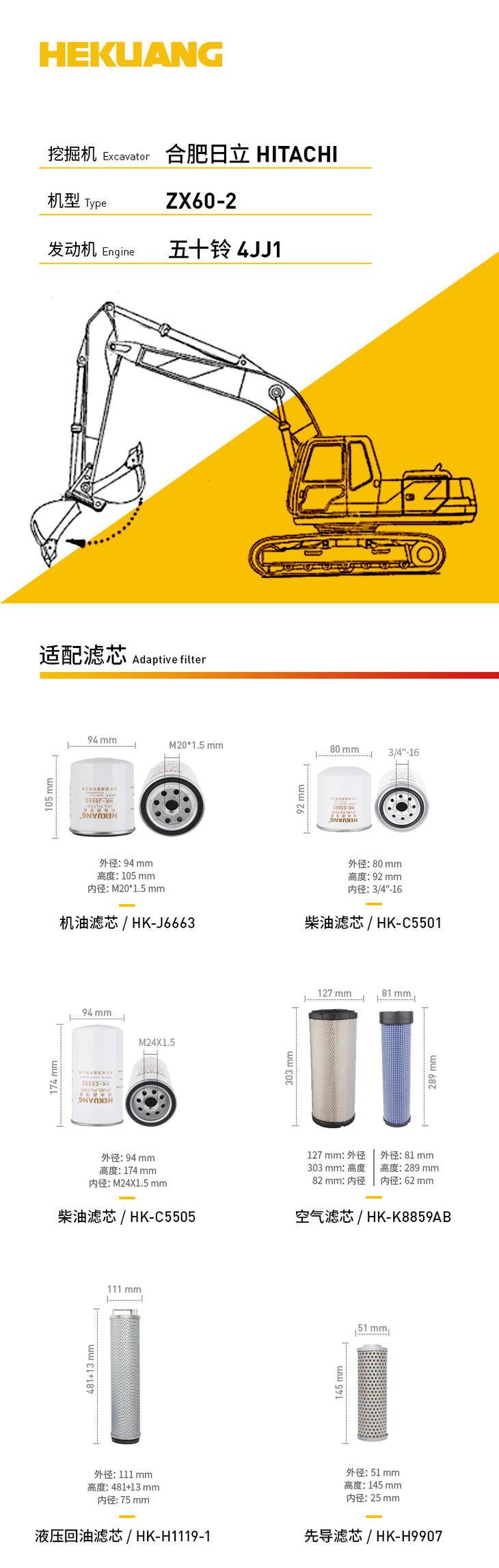 日立ZX60-2(五十铃4JJ1挖掘机滤芯 机油柴油空气滤芯 液压油先导滤芯