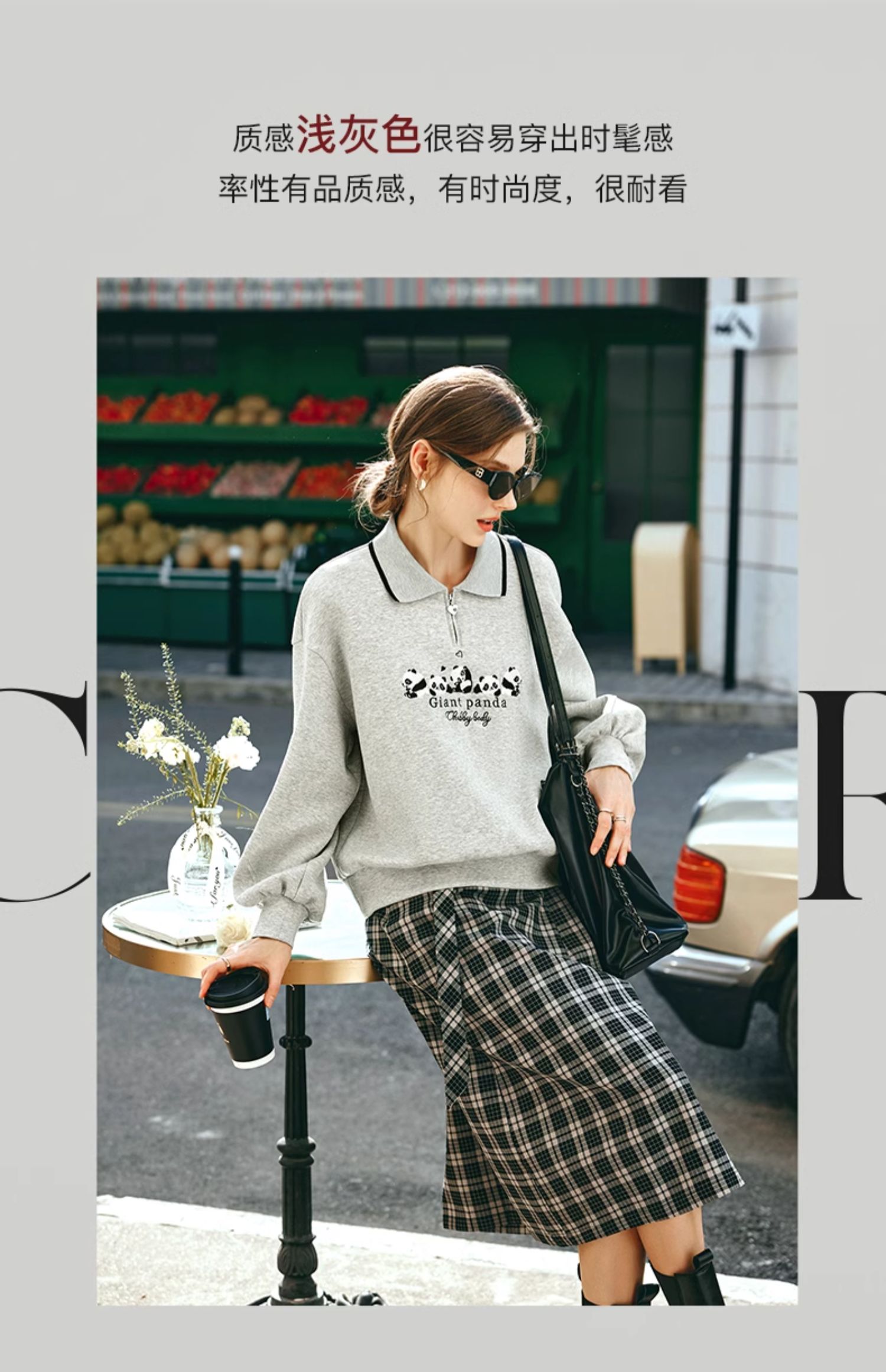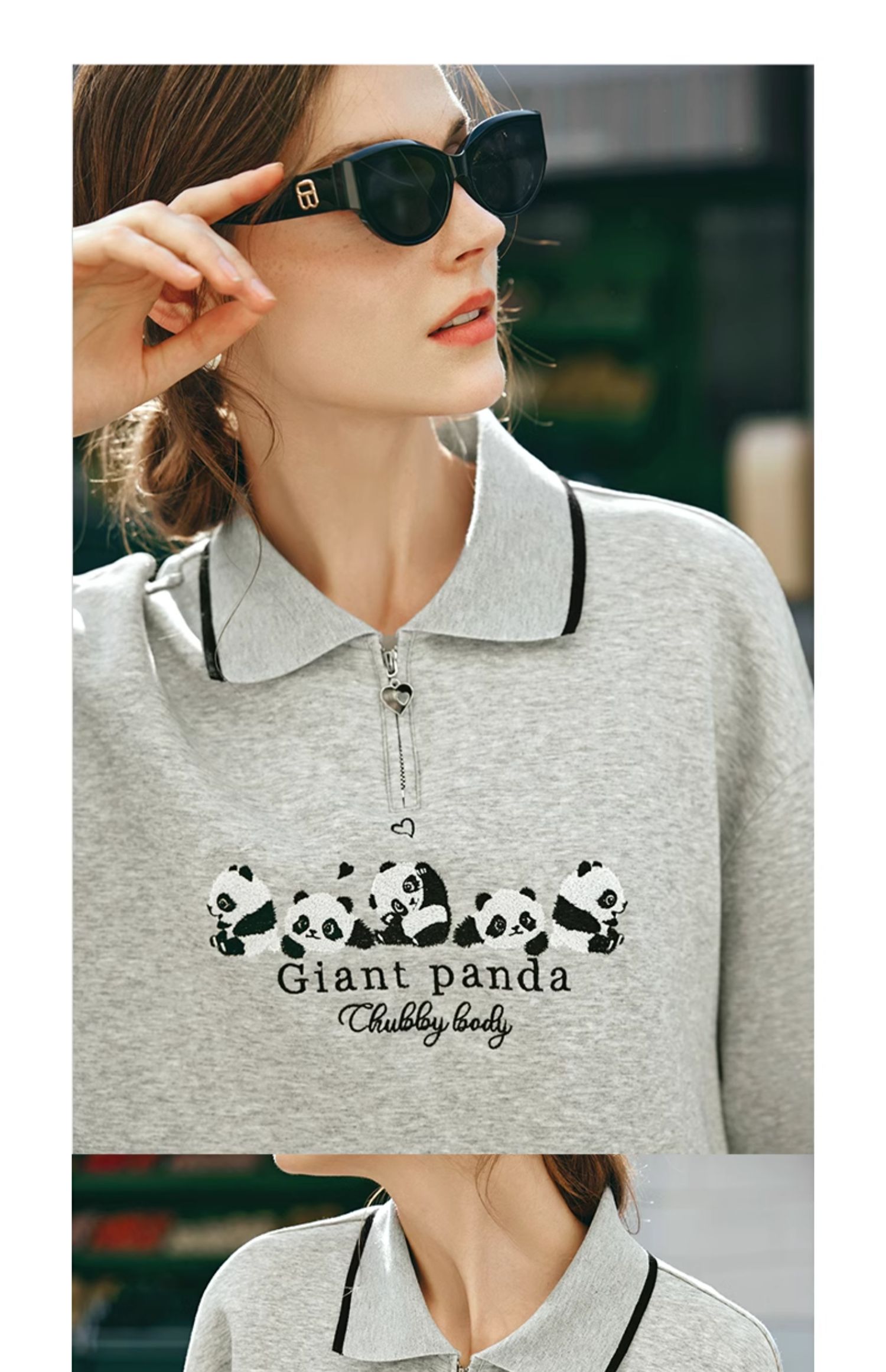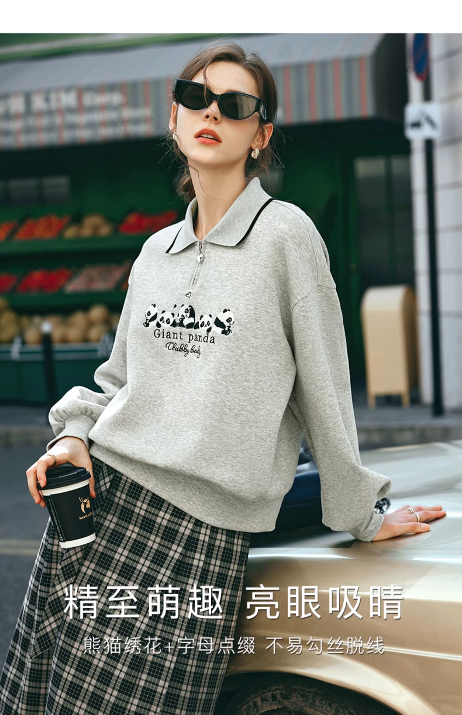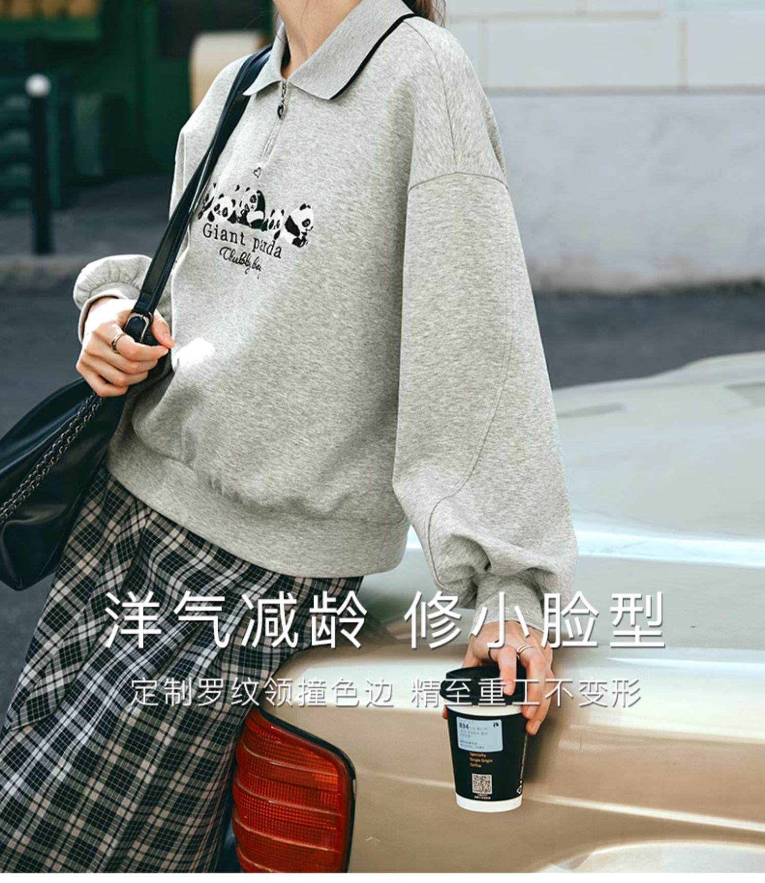 OLrain欧芮儿美式灰色卫衣女早春2024年新款设计感熊猫刺绣上衣