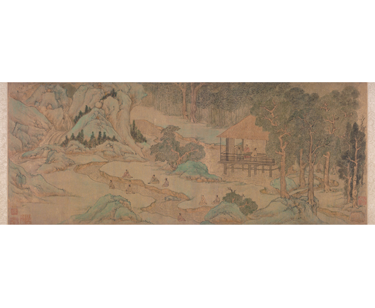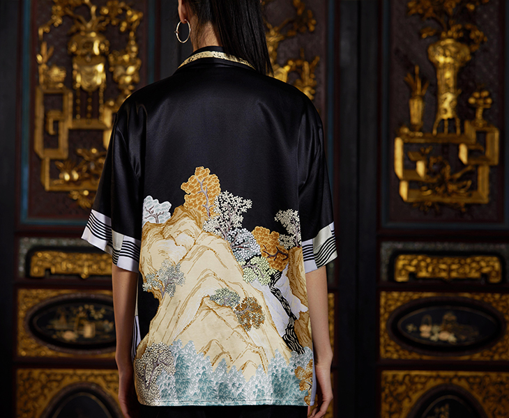 此款图案的创作灵感来源于文徵明的青山绿水画《兰亭修契图》。再现了文人士大夫曲水流觞的场景。细笔小青绿画法,表现了树林葱郁,修竹傍水的春日美景,再来闲亭一座。曲线的波浪底纹与几何边框使兰亭美景增添几分现代感,更突出了画面的山水的结构关系。此图表达了设计师乐天知命而安于自然生活的思想。