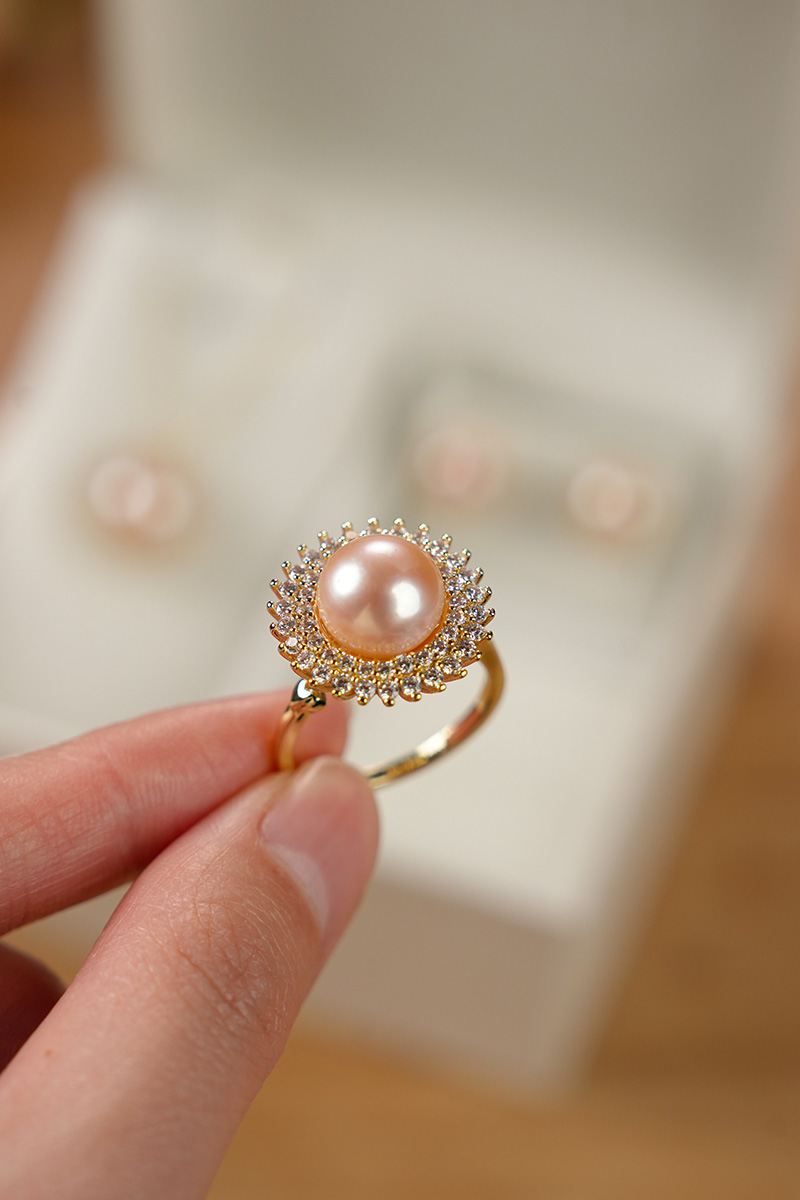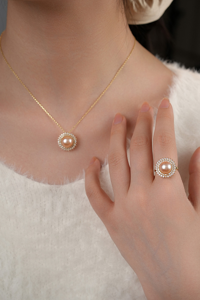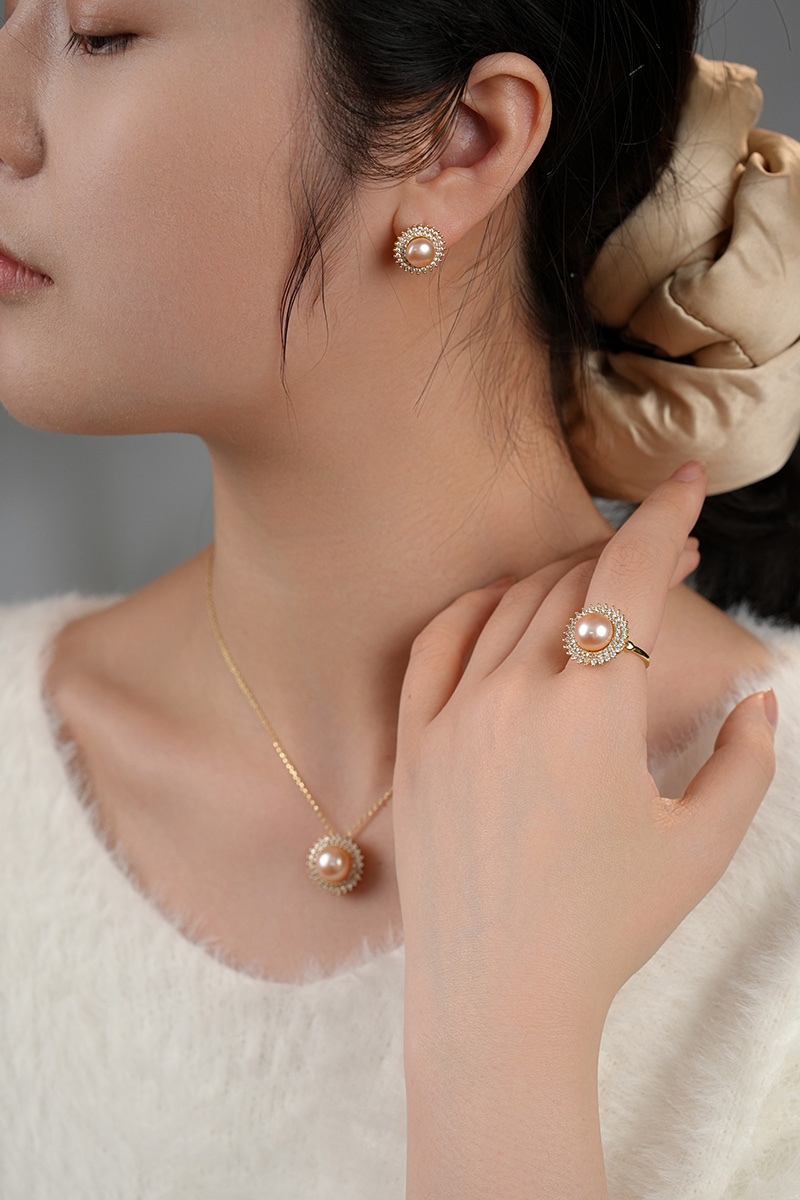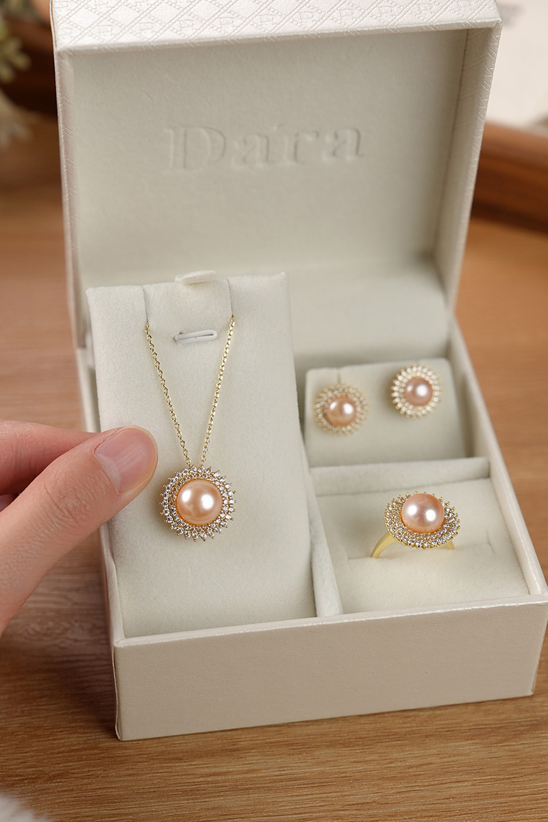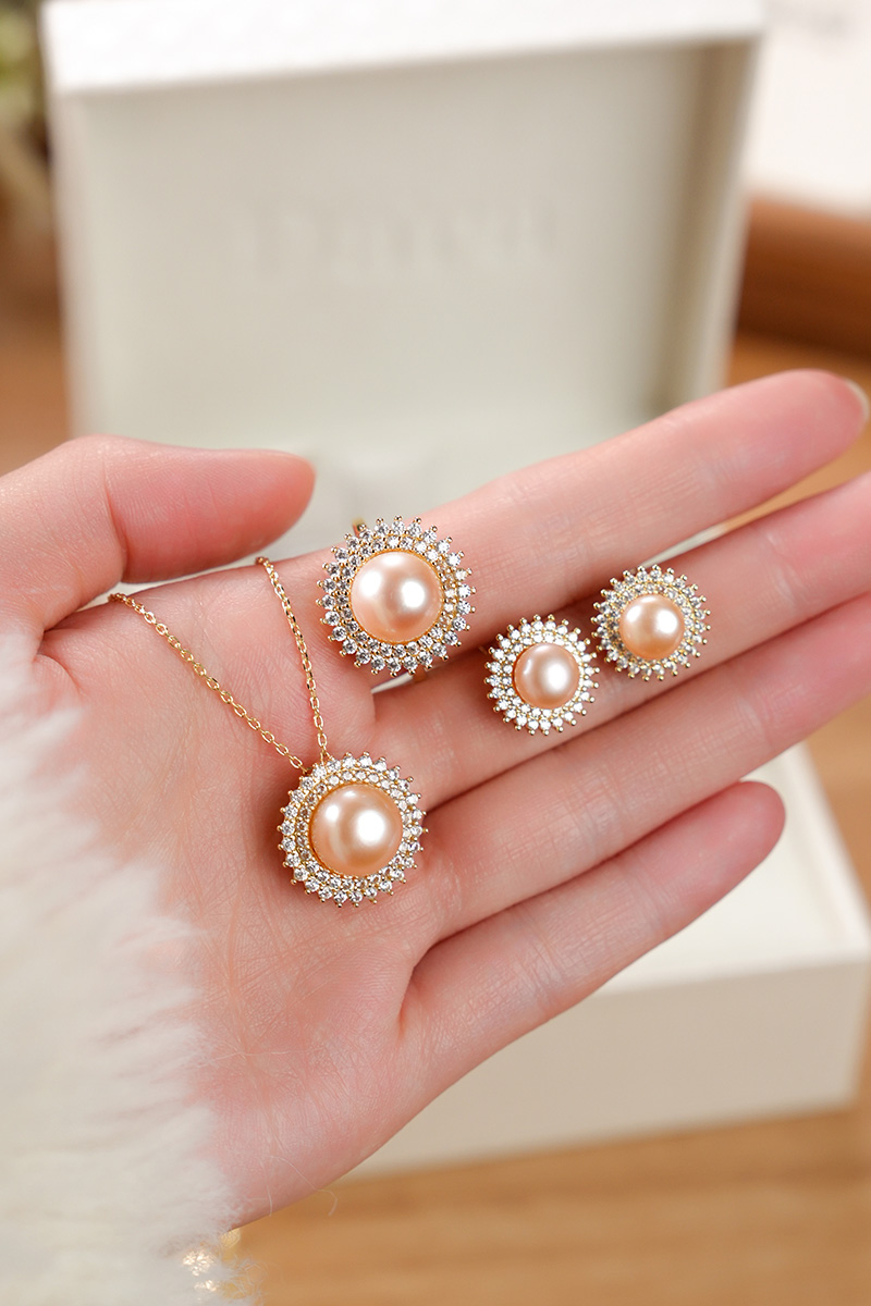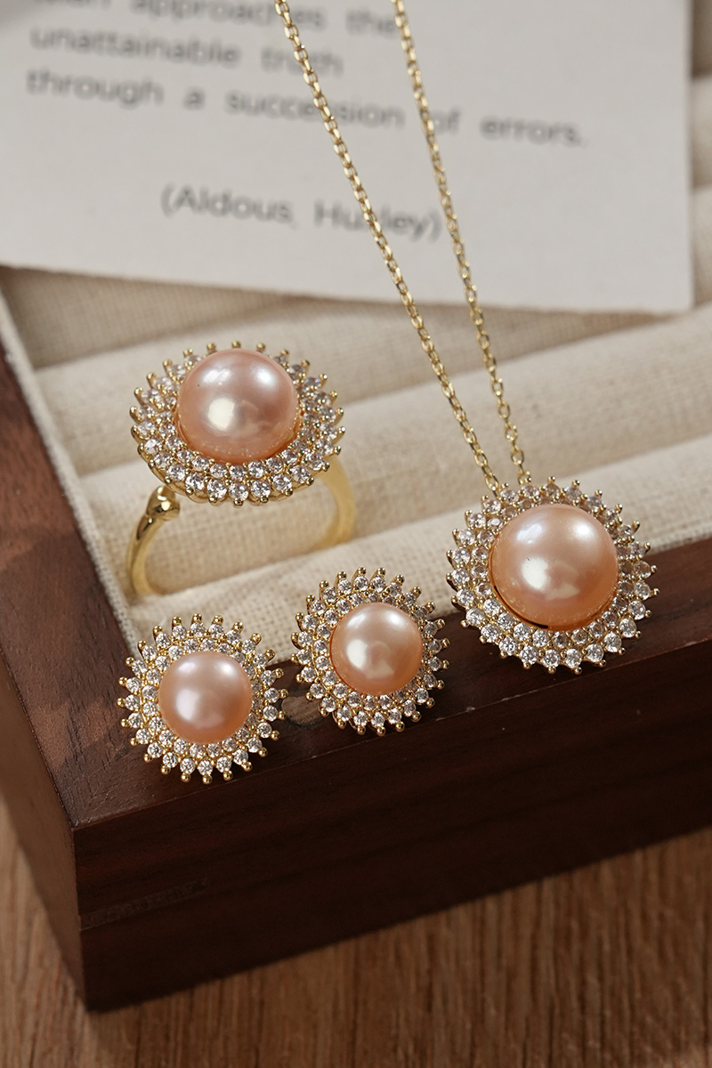 【分销】【珍珠溯源】戴拉珍珠《向阳花》X192300T-1,淡水无核珍珠三件套装,鎏金设计,合金花托包裹珍珠,如旭日绽放