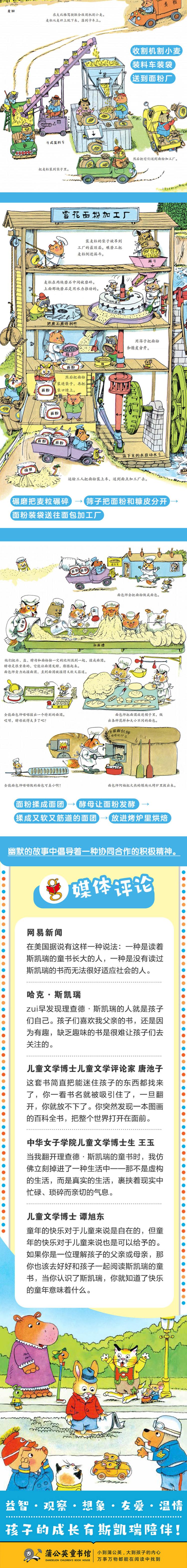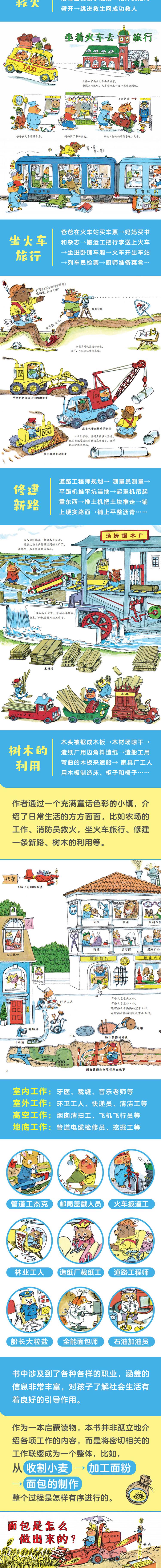 《忙忙碌碌镇》认识职业和社会分工!在忙忙碌碌镇中,温和的动物居民们过着快乐而忙碌的生活。作者通过一个充满童话色彩的小镇,介绍了日常生活的方方面面,比如农场的工作、消防员救火,坐火车旅行、修建一条新路、树木的利用等。书中涉及到了各种各样的职业,涵盖的信息非常丰富,对孩子了解社会生活有着良好的引导作用。同时,妙趣横生的故事情节,大量隐藏着的图画信息,可以让孩子长时间地投入阅读和观察,从新的发现中获得快乐的体验。作为一本启蒙读物,本书并非孤立地介绍各项工作的内容,而是将密切相关的工作联缀成为一个整体,比如,从收割小麦到加工面粉,再到面包的制作,整个过程是怎样有序进行的。幽默的故事中倡导着一种协同合作的积极精神。