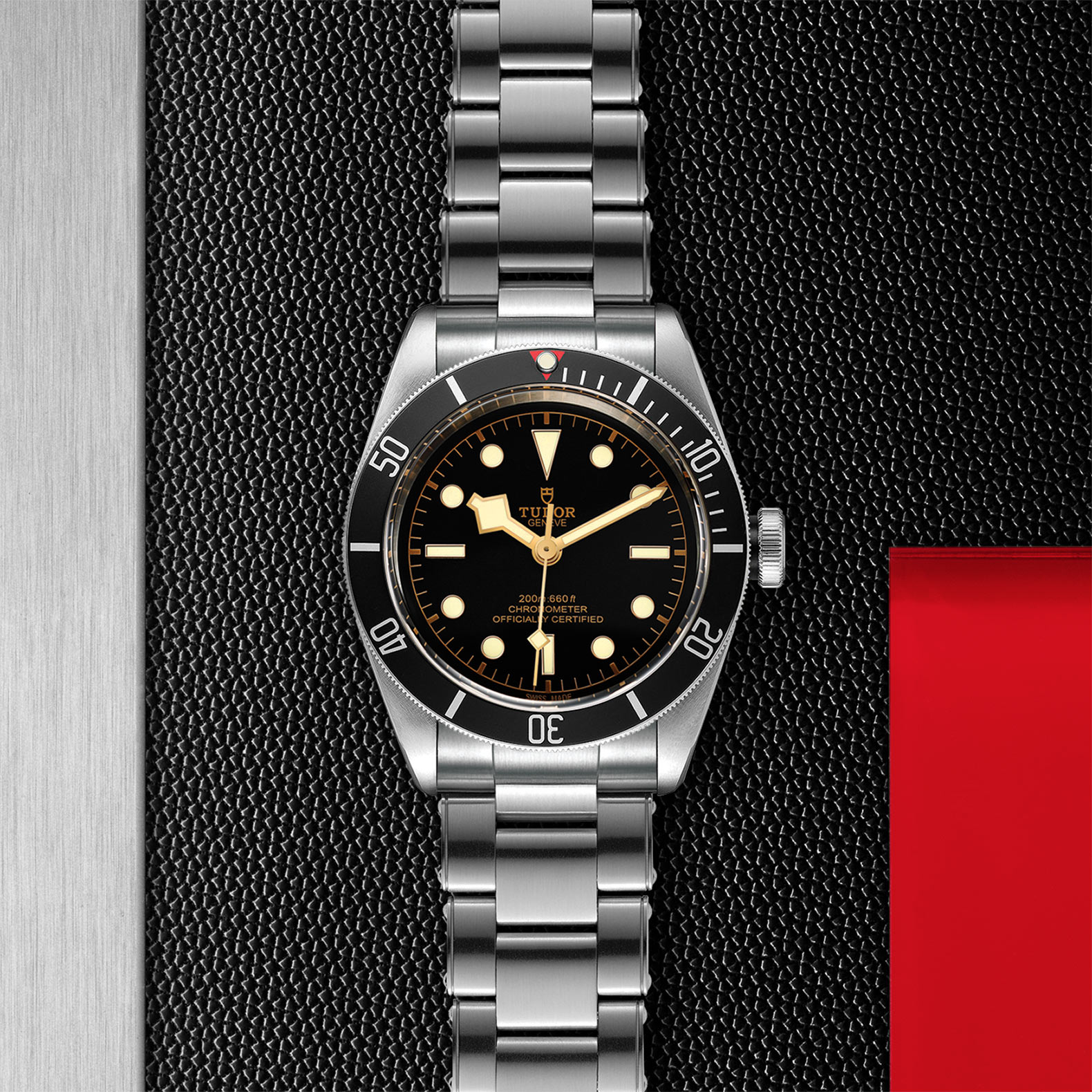 不锈钢旋入式上链表冠,刻有帝舵表玫瑰标志,黑色漆面,配黑色阳极氧化铝上链表冠轴