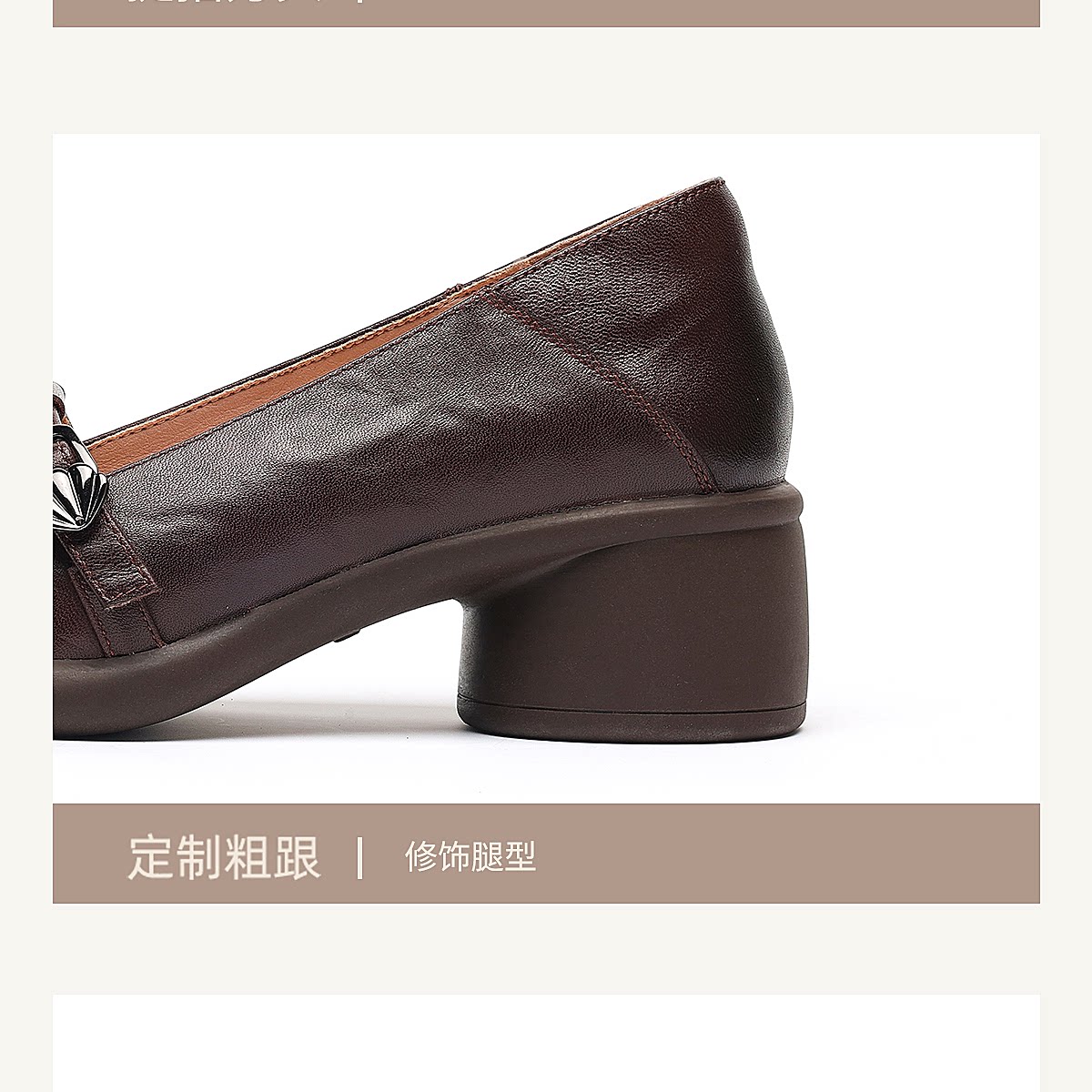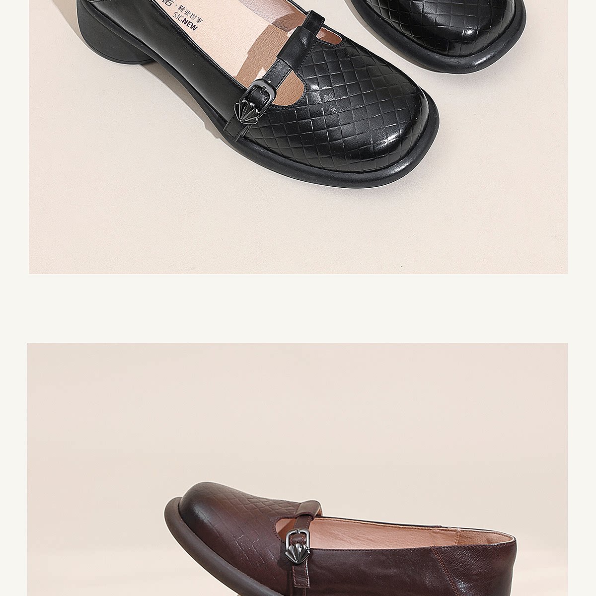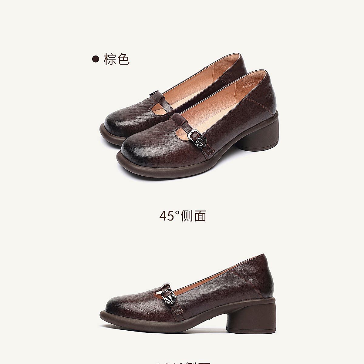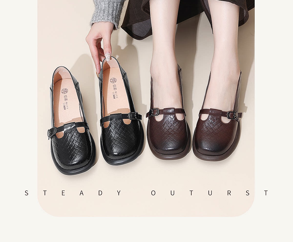 复古风真皮圆头浅口单鞋女低跟软底舒适妈妈鞋乐福鞋6C5255-3