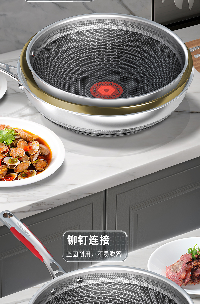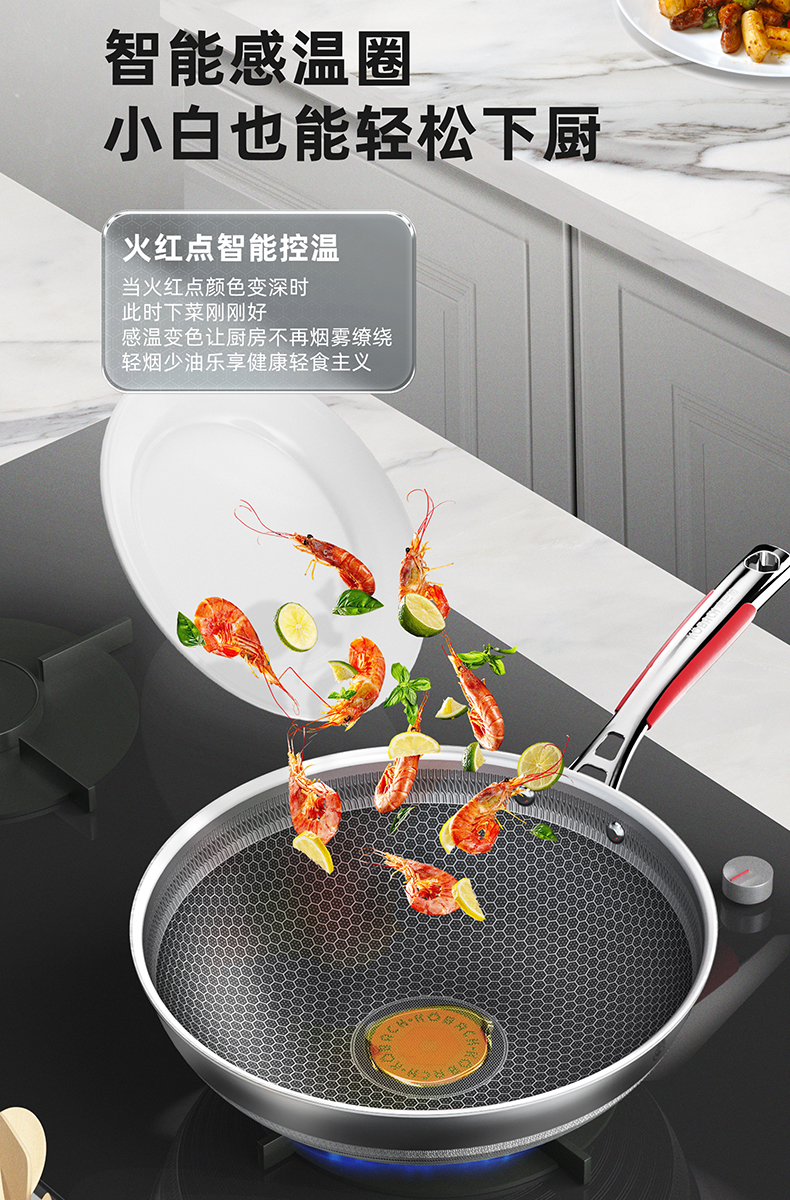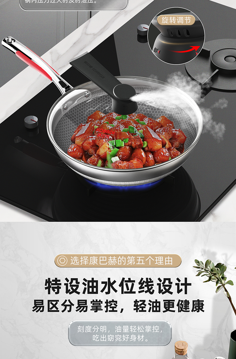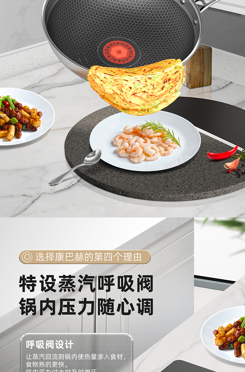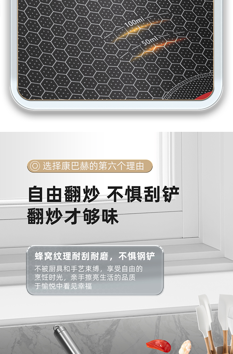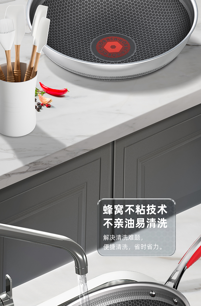 1.蜂窝纹理耐刮耐磨,不惧钢铲不被厨具和手艺束缚,享受自由的烹饪时光,亲手擦亮生活的品质于愉悦中看见幸福 2.多层复合结构,导热快速热量传递均匀烹饪鲜人一步 3.呼吸阀设计,让蒸汽回流到锅内使热量渗入食材,食物熟的更快,锅内压力过大时及时泄压。 4.精细蚀刻工艺,在锅壁内蚀刻出精密凹凸纹理凸出部分构成一张蜂窝网状结构,防粘层仅覆盖纹理凹陷处,不易脱落更耐用