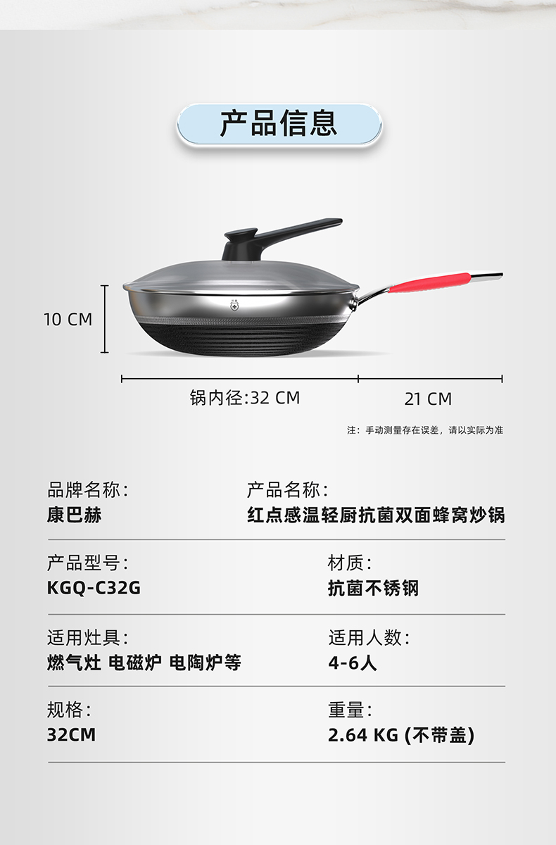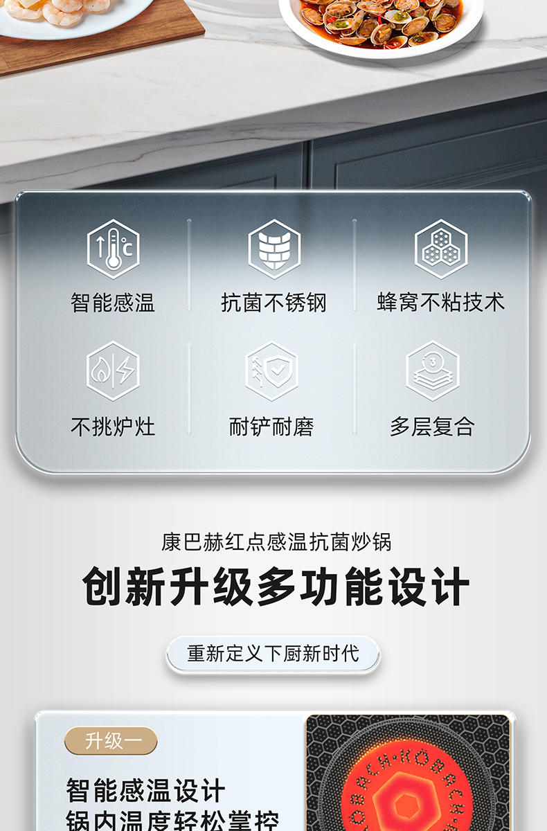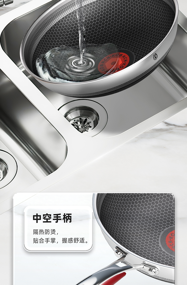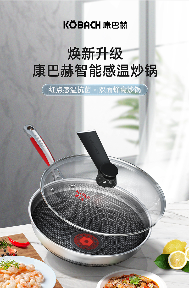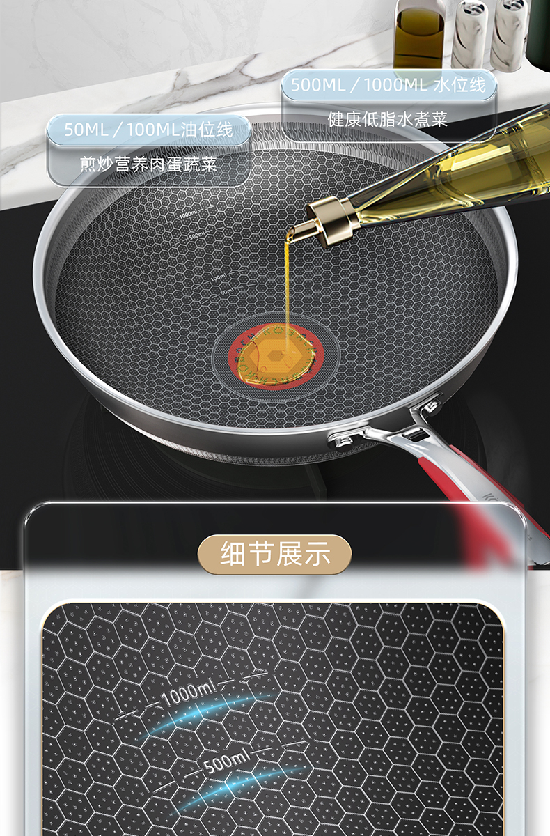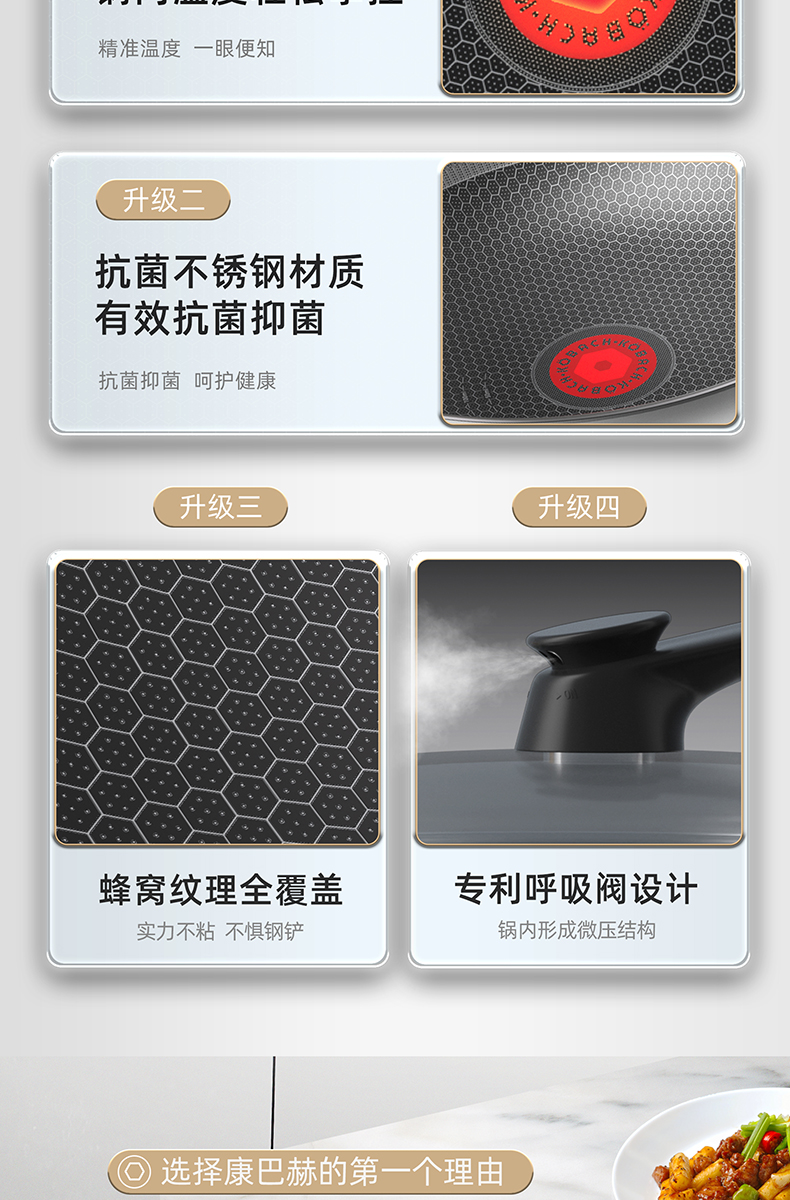 1.蜂窝纹理耐刮耐磨,不惧钢铲不被厨具和手艺束缚,享受自由的烹饪时光,亲手擦亮生活的品质于愉悦中看见幸福 2.多层复合结构,导热快速热量传递均匀烹饪鲜人一步 3.呼吸阀设计,让蒸汽回流到锅内使热量渗入食材,食物熟的更快,锅内压力过大时及时泄压。 4.精细蚀刻工艺,在锅壁内蚀刻出精密凹凸纹理凸出部分构成一张蜂窝网状结构,防粘层仅覆盖纹理凹陷处,不易脱落更耐用