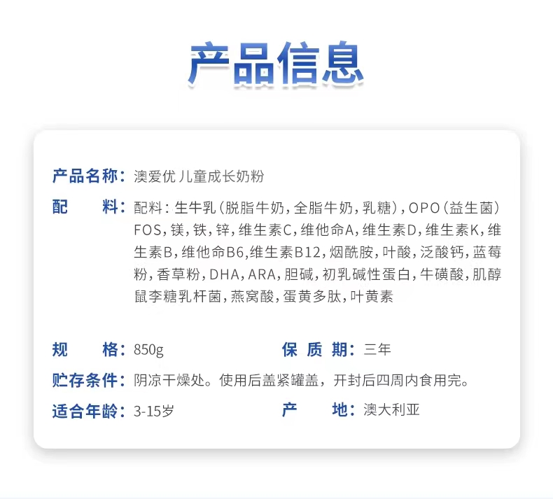 澳洲Ausiki澳爱优儿童成长奶粉长高奶粉 3-15岁 850g