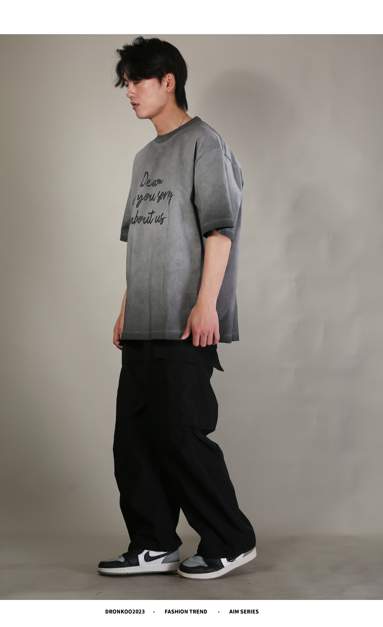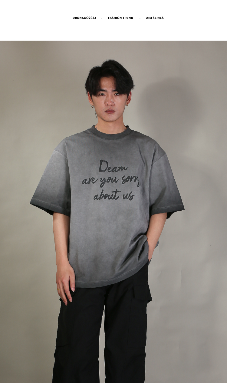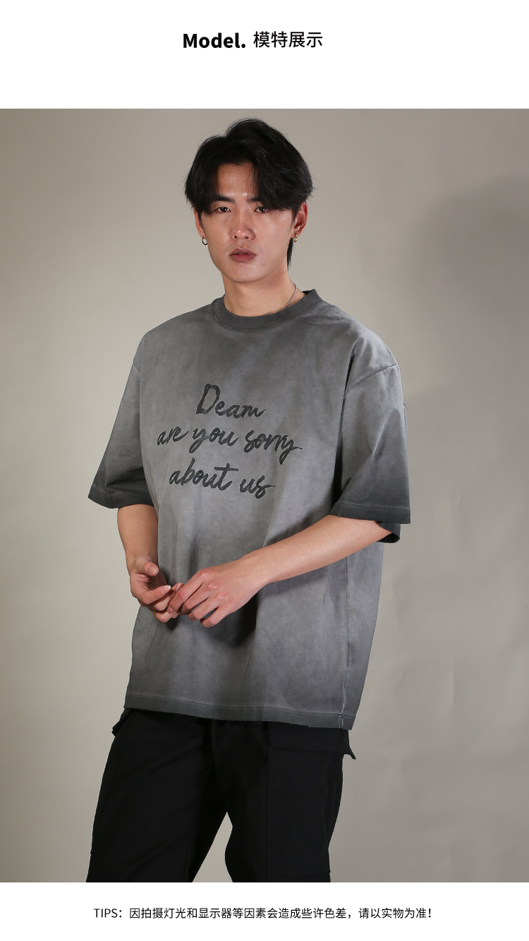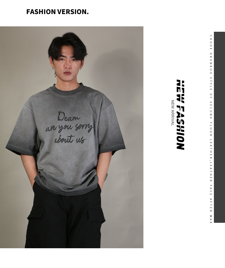 DRONKOO 2026 圆领前三排后一排字母印花做旧磨破阔短袖T恤