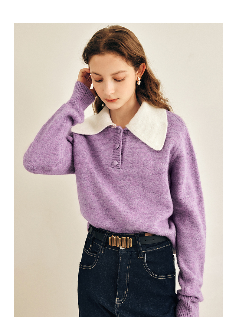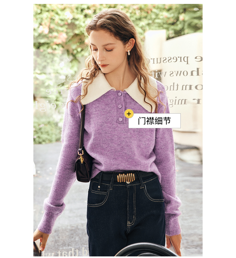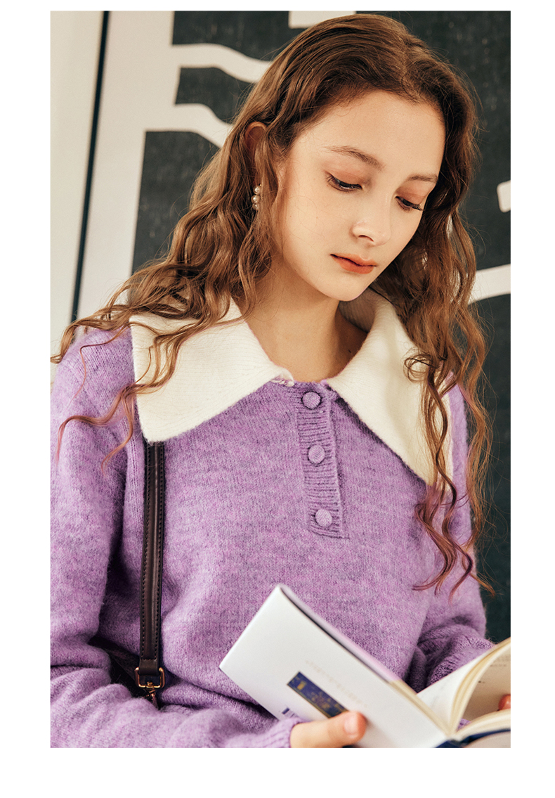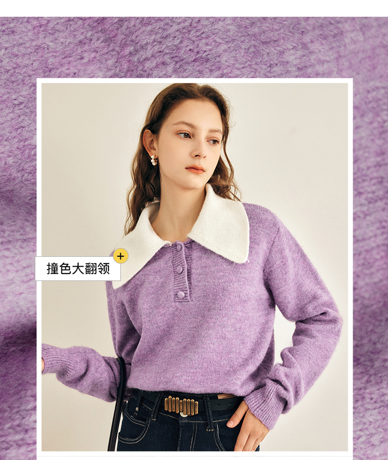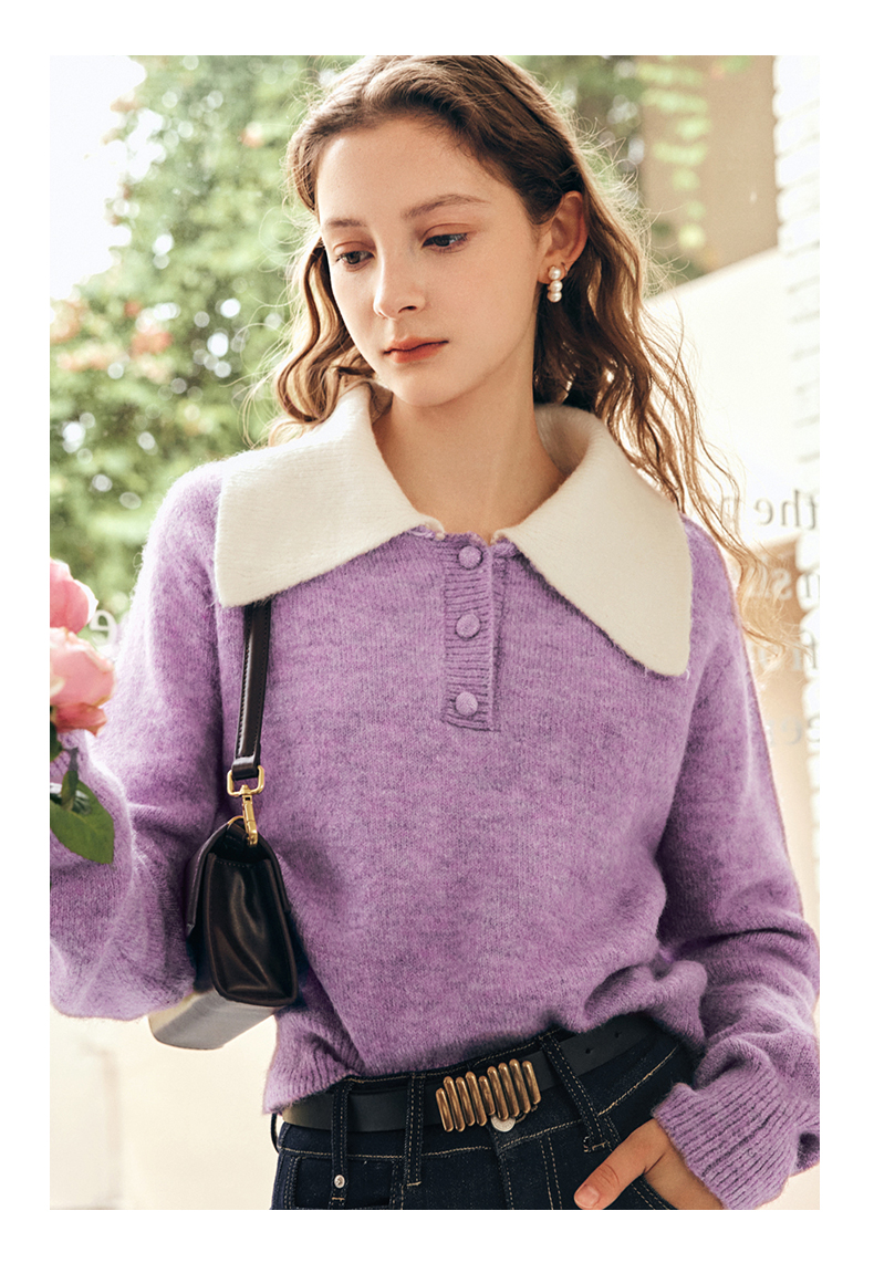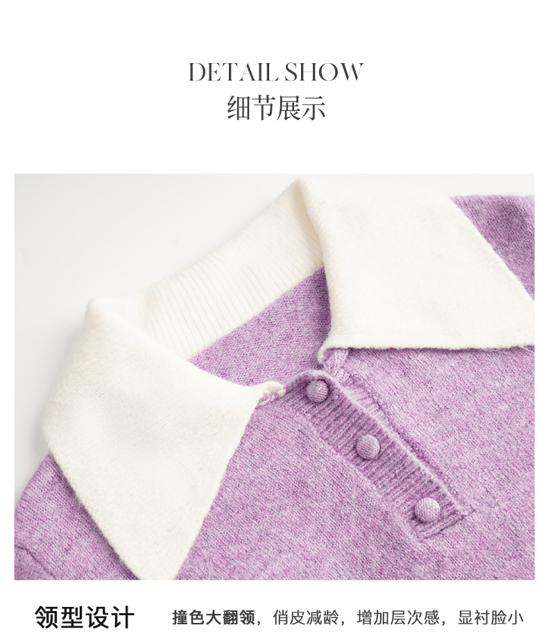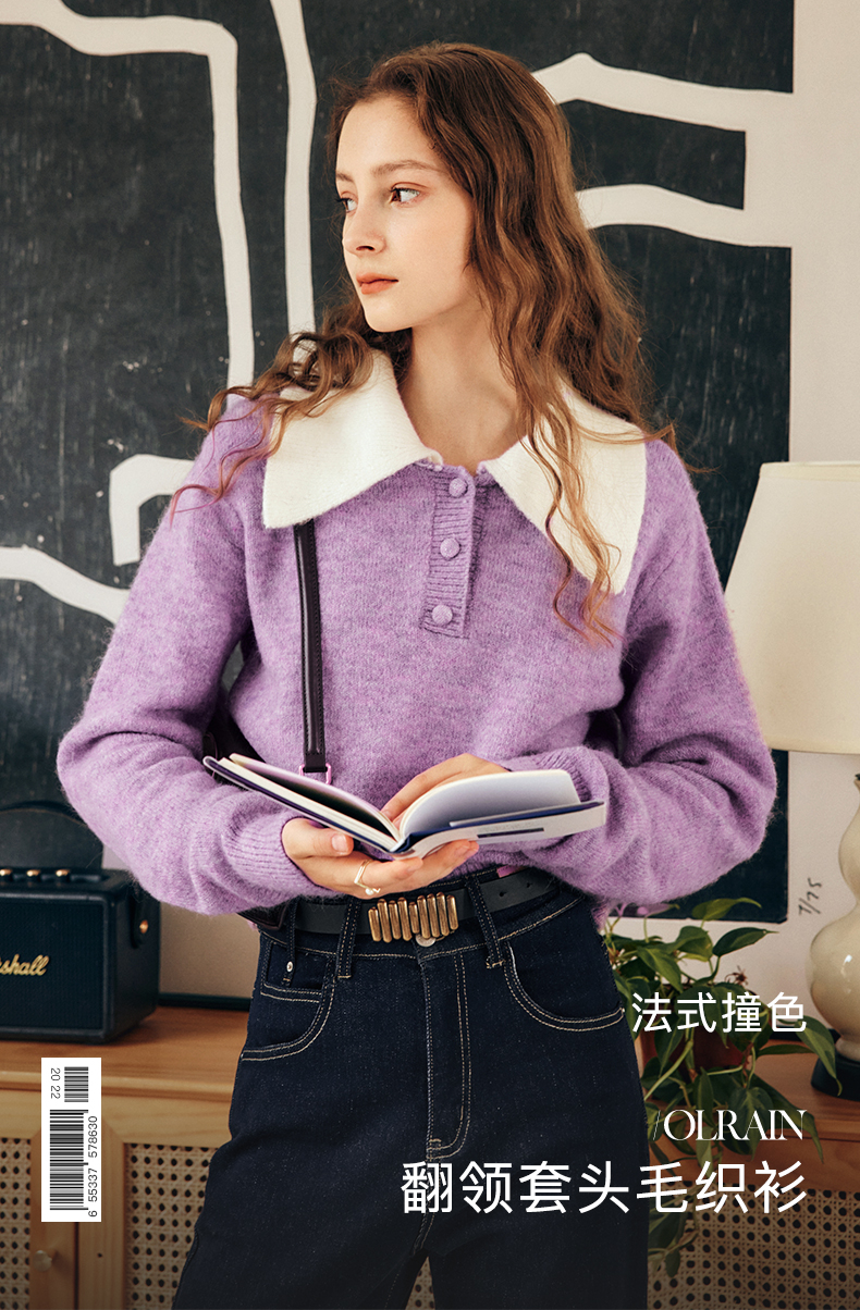 OLrain欧芮儿法式紫色翻领毛衣女秋冬2022年新款宽松撞色针织上衣