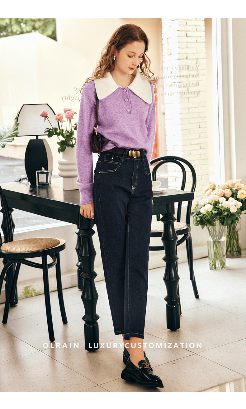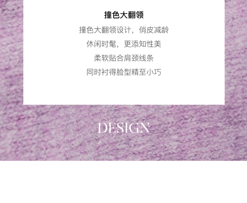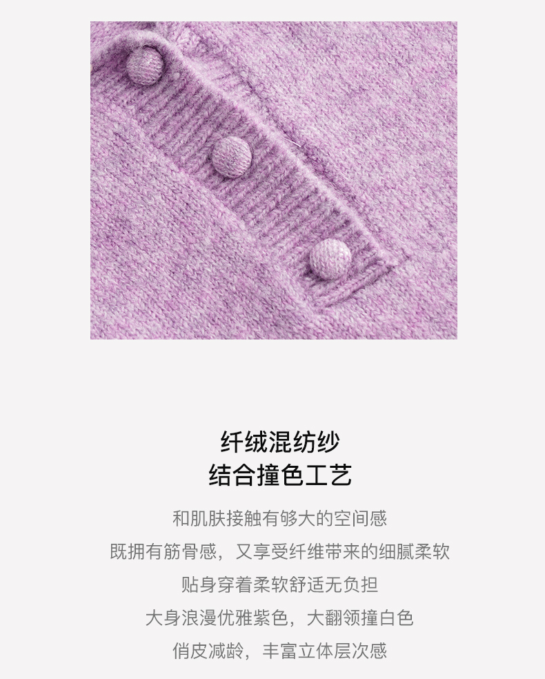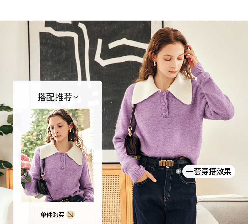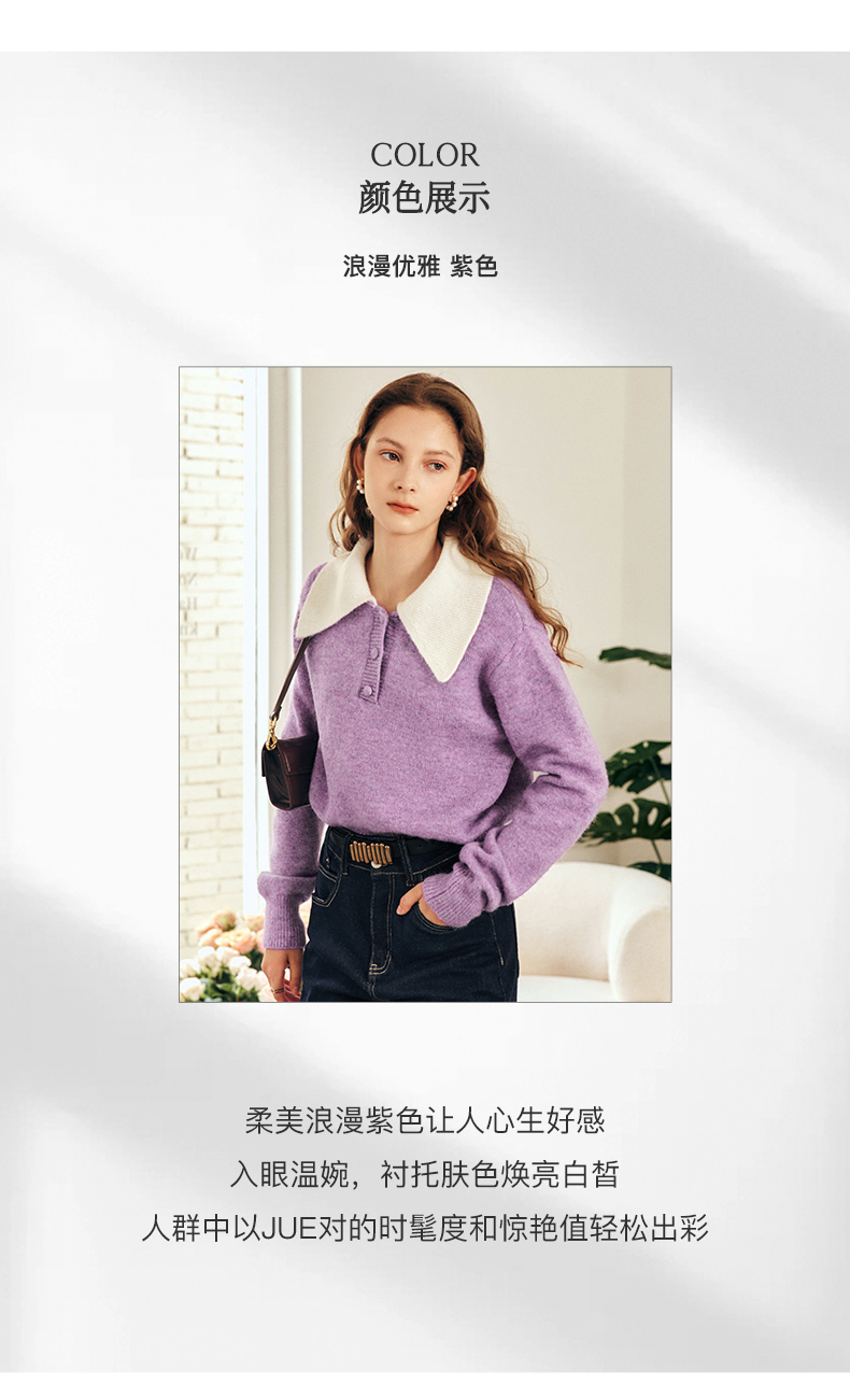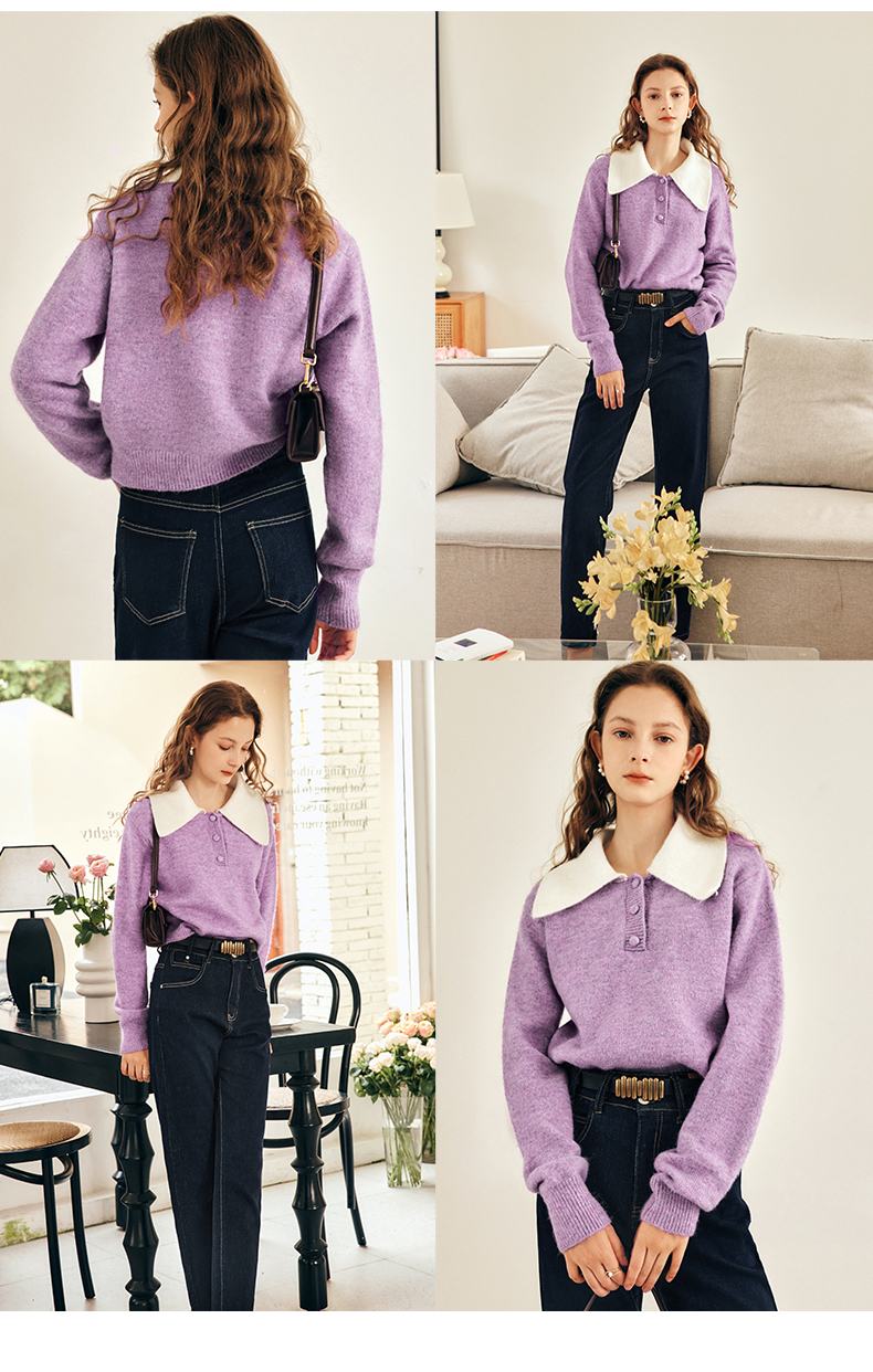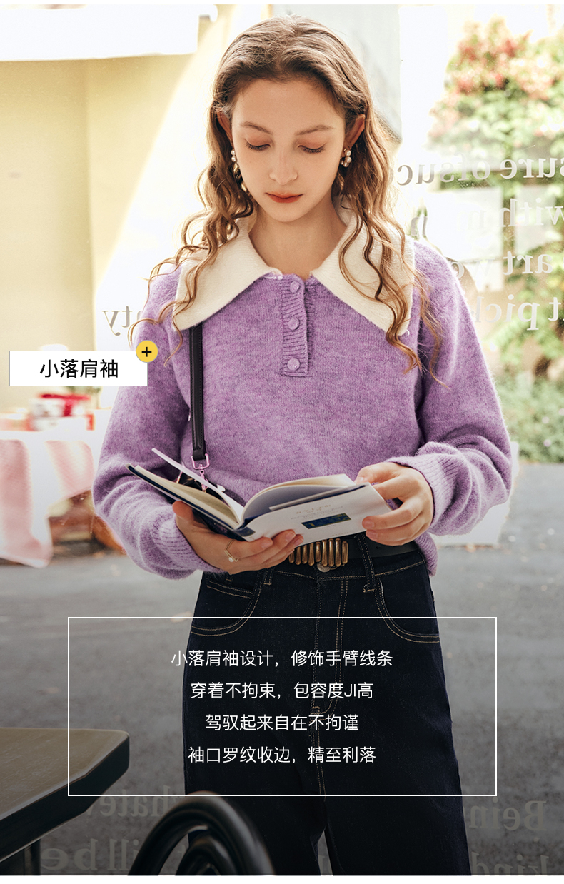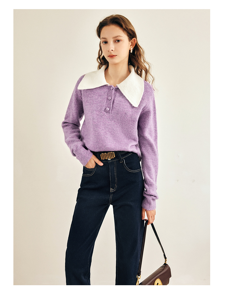 OLrain欧芮儿法式紫色翻领毛衣女秋冬2022年新款宽松撞色针织上衣