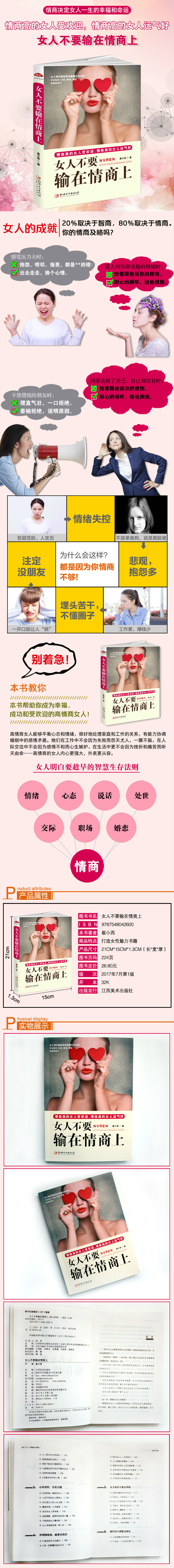 情商决定女人一生的幸福和命运,它可以让女人快乐阳光,活力四射,魅力无穷;也可以让女人悲观忧郁,脆弱敏感,令人生厌。情商的高低对一个人的身心发展有着重大影响,对其能否取得成功同样有着不可估量的作用,有时其作用甚至要超过智力水平。在女人成功的道路上,情商往往比智商起着更重要的作用。女人别输在情商上!愿本书能带给你有益的启示,帮助你成为幸福、成功和受欢迎的高情商女人。