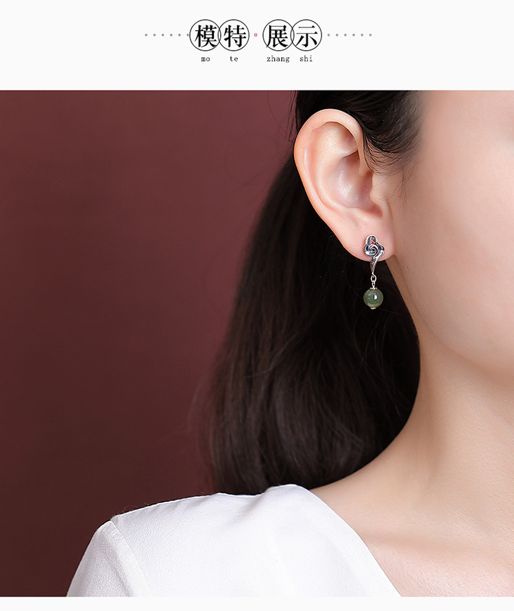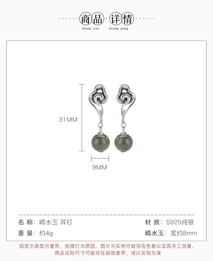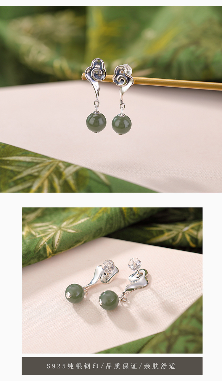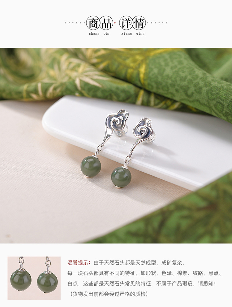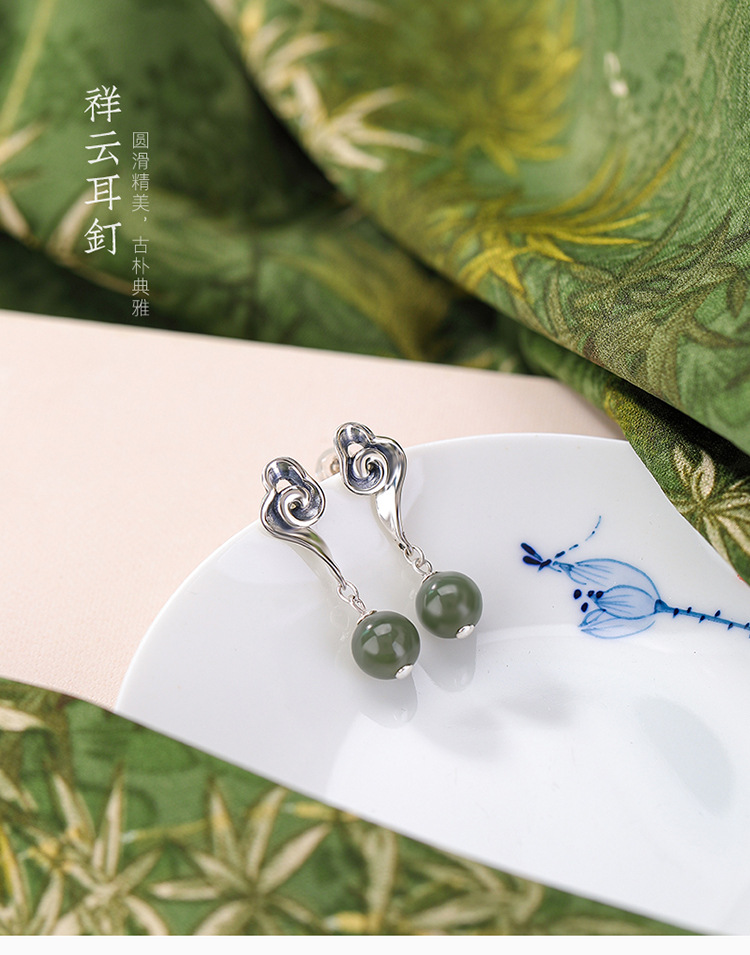 【祥云清影】S925纯银天然和田玉晴水玉祥云圆珠耳饰【CW-ED03935】