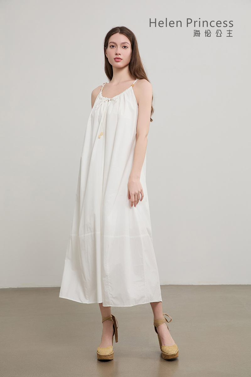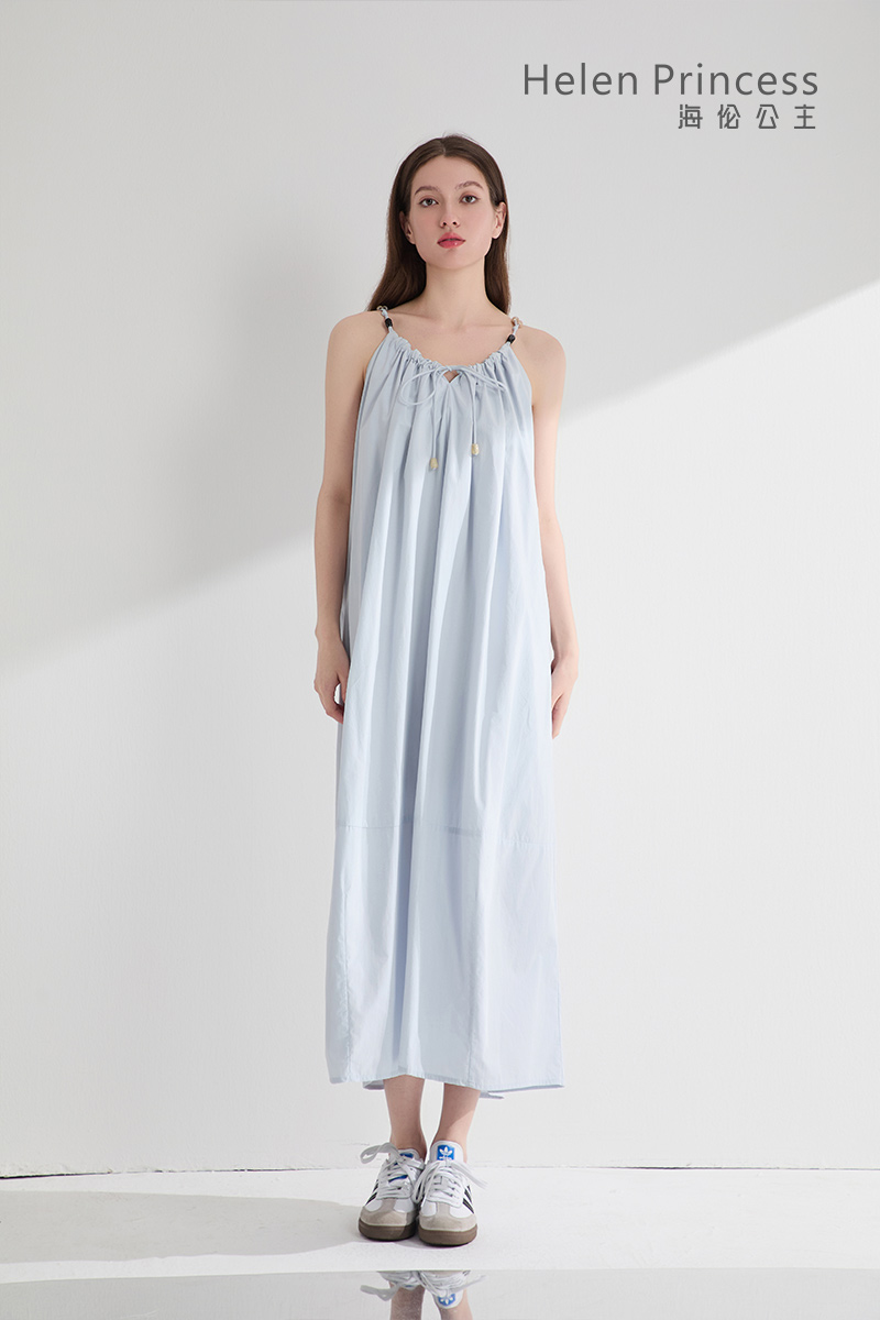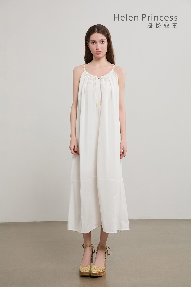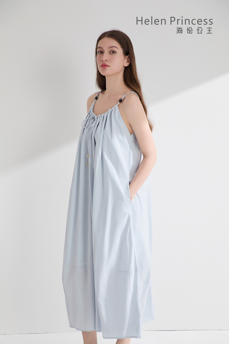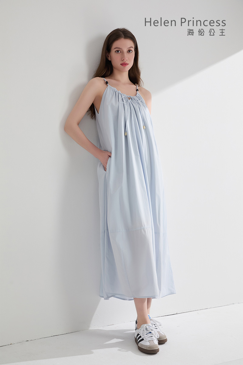 吊带设计,肩带上点缀着小巧的串珠装饰,增添了几分精美感。领口处的抽皱系带设计丰富了整体的层次感,营造出简约又浪漫的度假风氛围感,两侧有隐形口袋设计,实穿性强。