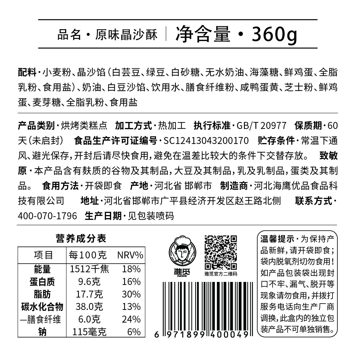 雅觅 原味晶沙酥360g 6枚蛋黄酥雪媚娘蛋黄夹心零食 办公室休闲食品