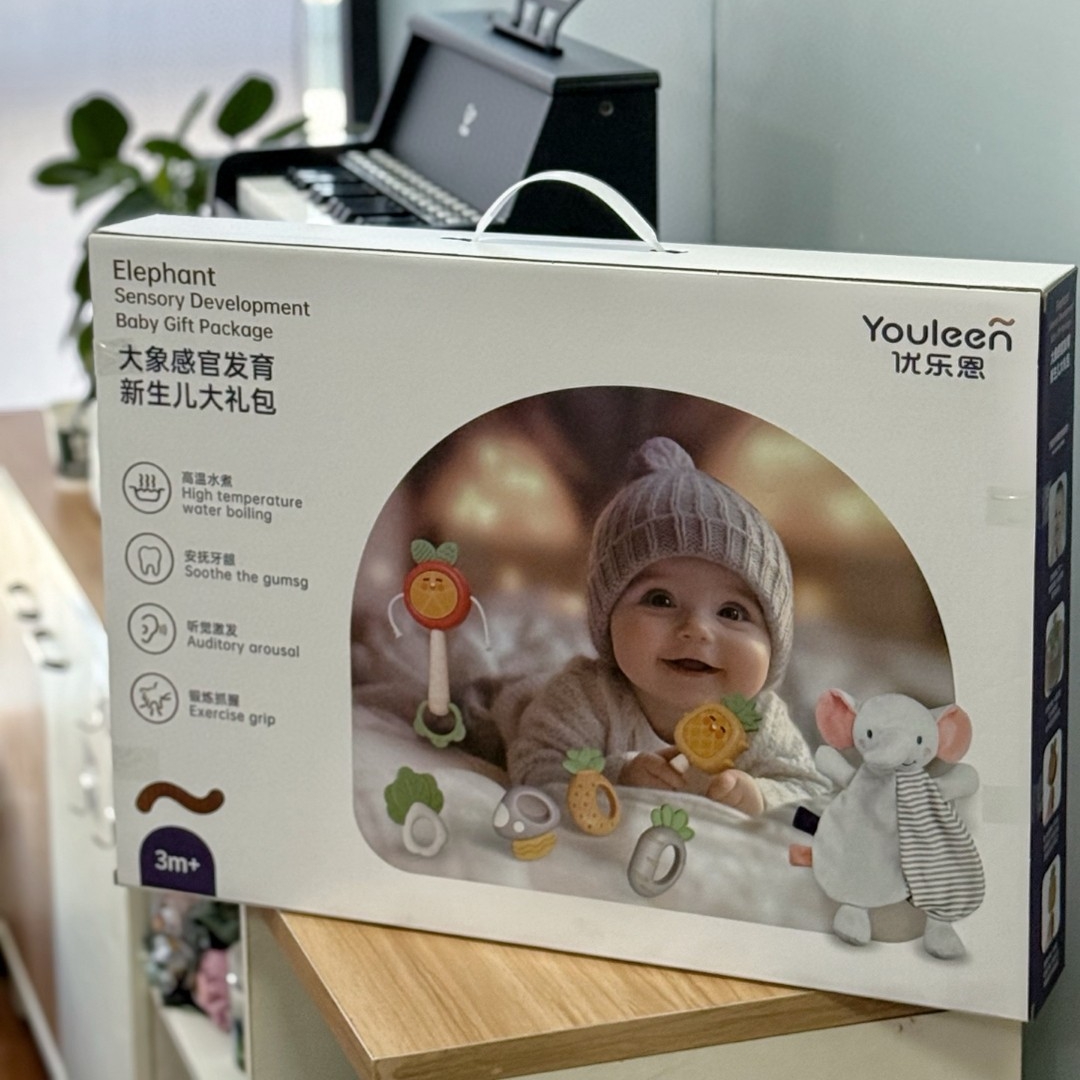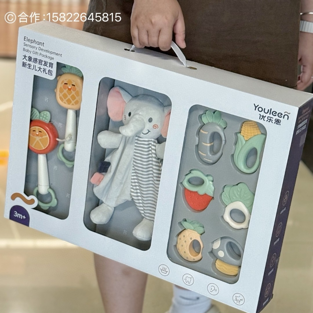 优乐恩婴儿手摇铃牙胶大象感官发育新生儿礼包0-3个月新生儿安抚宝宝益智玩具1岁礼盒套装